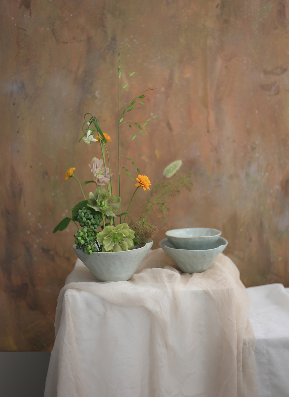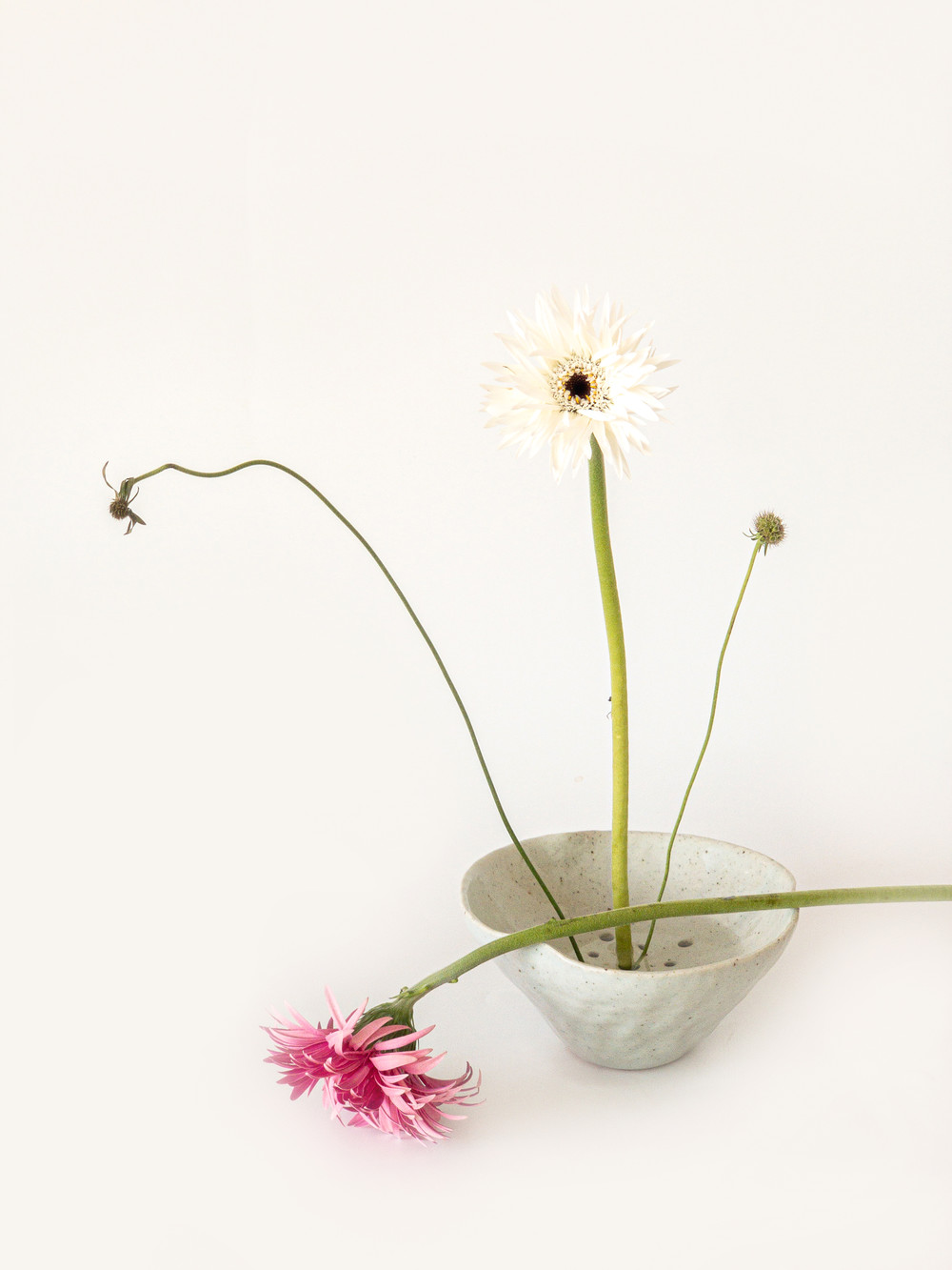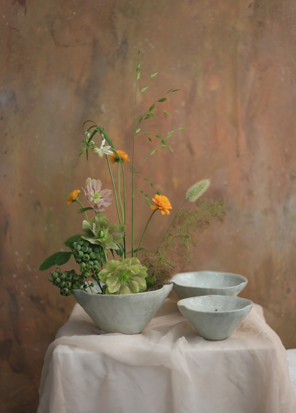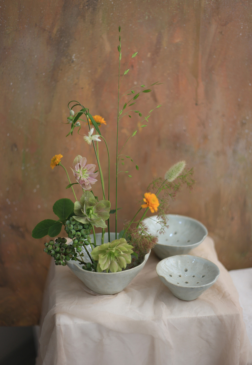 오아시스를 사용하지 않고 꽃을 꽂을 수 있는 수반입니다. 연잎을 모티브로 만들어졌으며, 안쪽에는 구멍이 뚤려 있어 별도의 침봉이나 오아시스를 사용하지 않아도 꽃을 꽂아 연출할 수 있습니다. 작품 하나하나 손으로 정성들여 작업해 모양과 질감이 조금씩 달라 자연 속 연잎을 옮겨온 것처럼 안정감과 편안함을 느끼게 해줍니다. 소량의 물을 수반에 담고 꽃을 꽂으면 누구나 쉽게 멋진 꽃꽂이를 완성하실 수 있습니다. 찻자리에서도 계절별로 변해가는 꽃과 풀을 꽂아 연출해보세요. 더욱 따뜻한 분위기를 느끼실 수 있습니다.