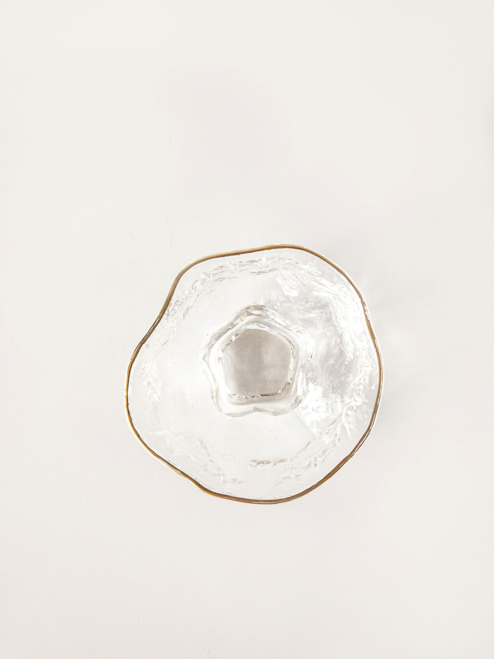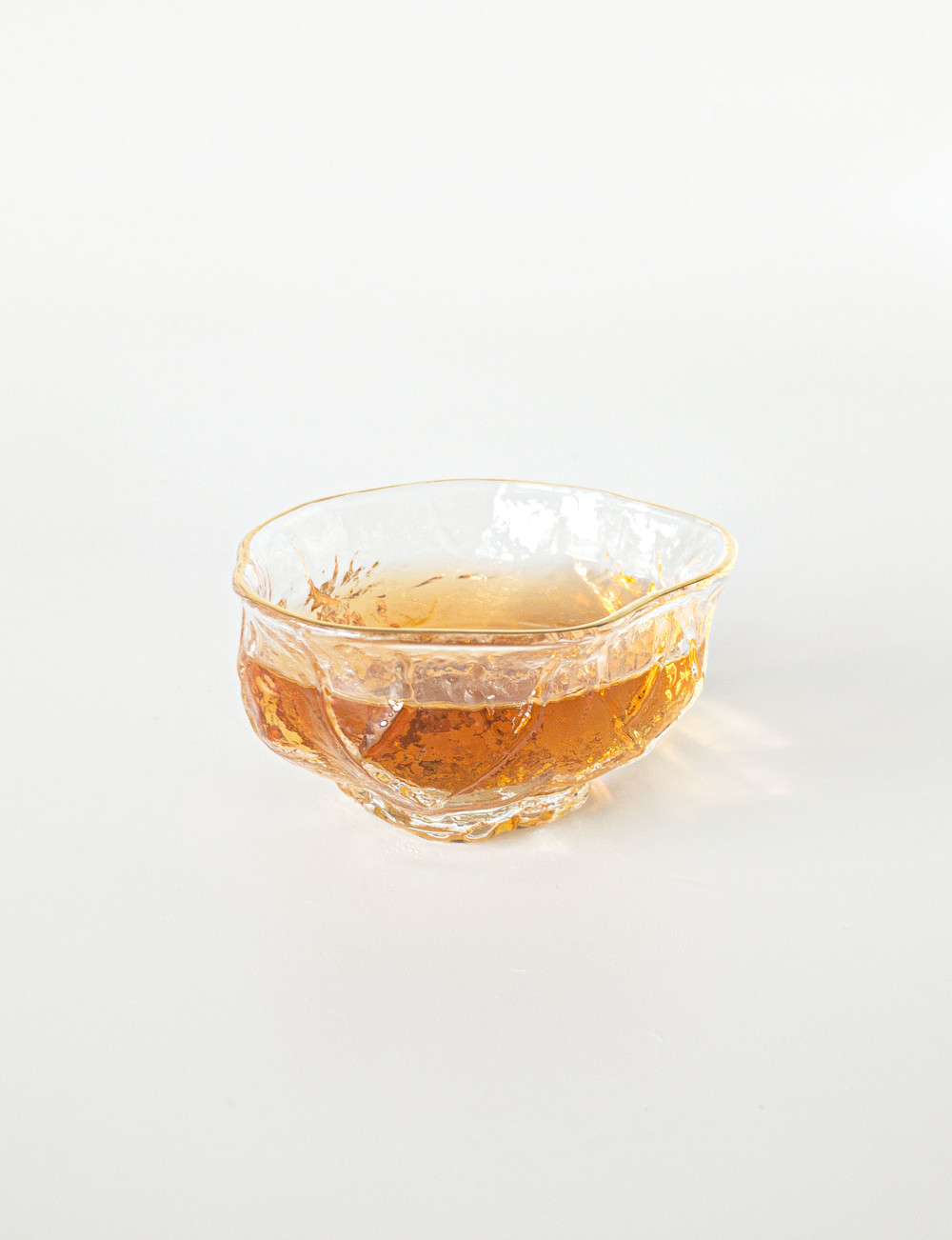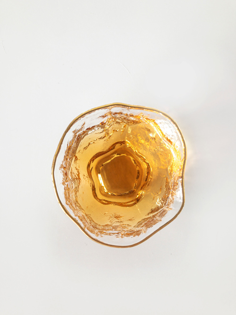 비정형적으로 일그러진 형태가 독특한 유리 찻잔입니다. 모든 면의 형태가 다르게 되어있어 특별하며 소장가치가 높습니다. 잔의 요철에 의해 차를 따랐을 때 더욱 빛이 영롱하게 일렁이며 아름답습니다. 윗면에는 금테가 둘러져 있어 포인트가 됩니다. 상세사진을 통해 그 독특한 형태의 미감을 느껴보세요.
