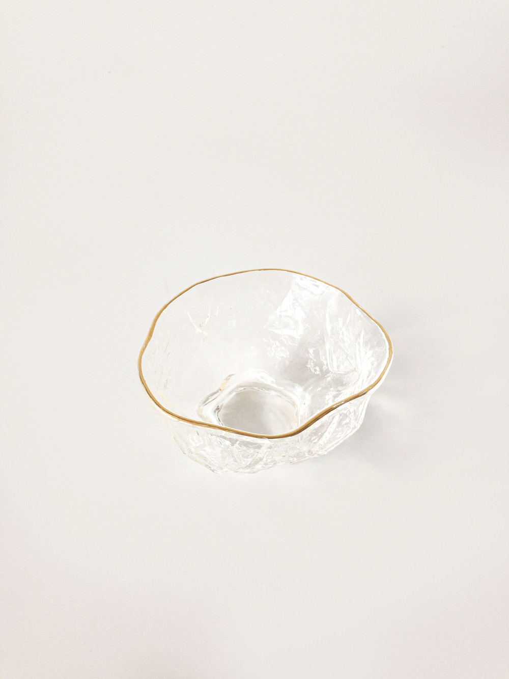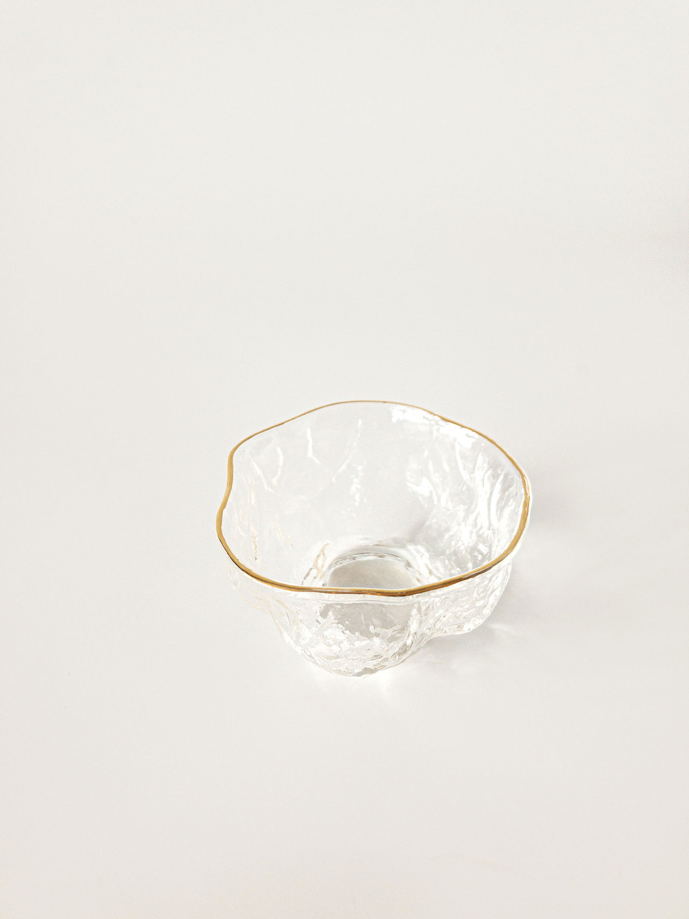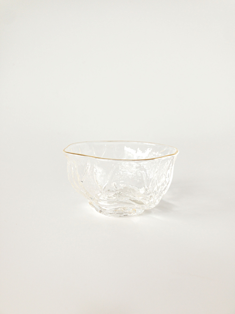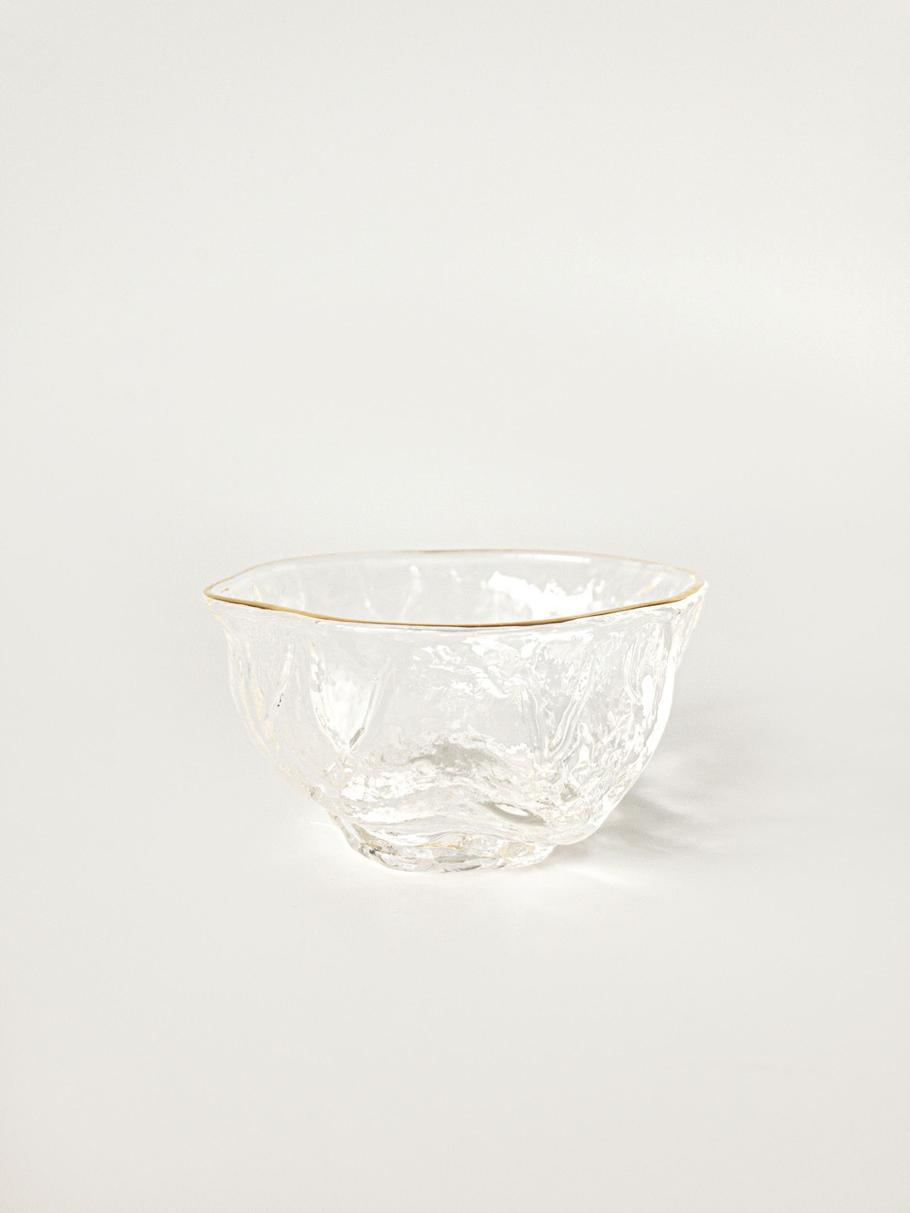 비정형적으로 일그러진 형태가 독특한 유리 찻잔입니다. 모든 면의 형태가 다르게 되어있어 특별하며 소장가치가 높습니다. 잔의 요철에 의해 차를 따랐을 때 더욱 빛이 영롱하게 일렁이며 아름답습니다. 윗면에는 금테가 둘러져 있어 포인트가 됩니다. 상세사진을 통해 그 독특한 형태의 미감을 느껴보세요.