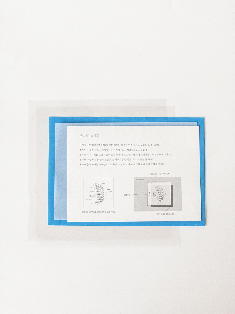 천에 도안을 그려져 있지 않습니다. 첨부된 수예용 복사지를 사용하여 도안을 따라 그려야합니다.