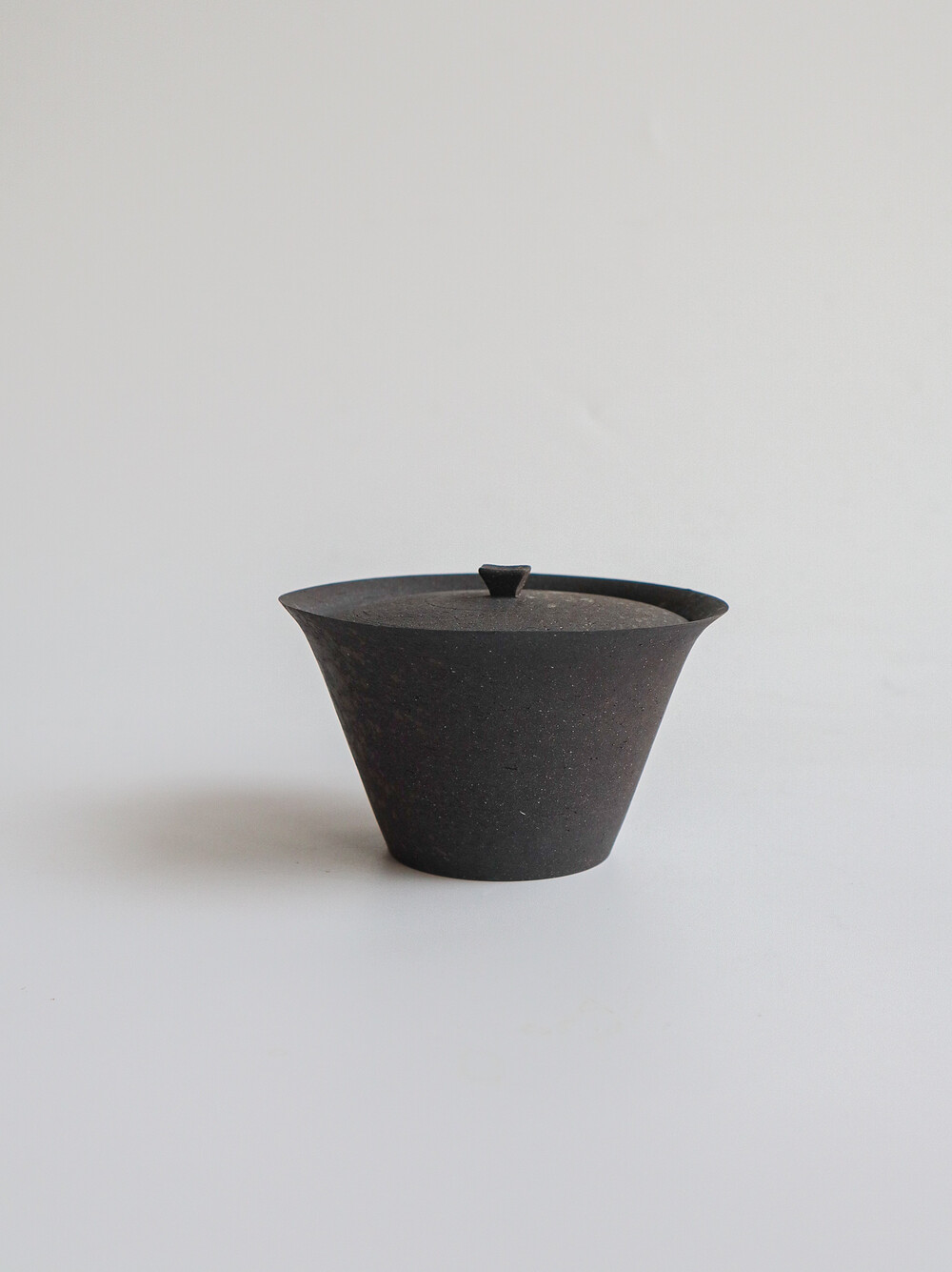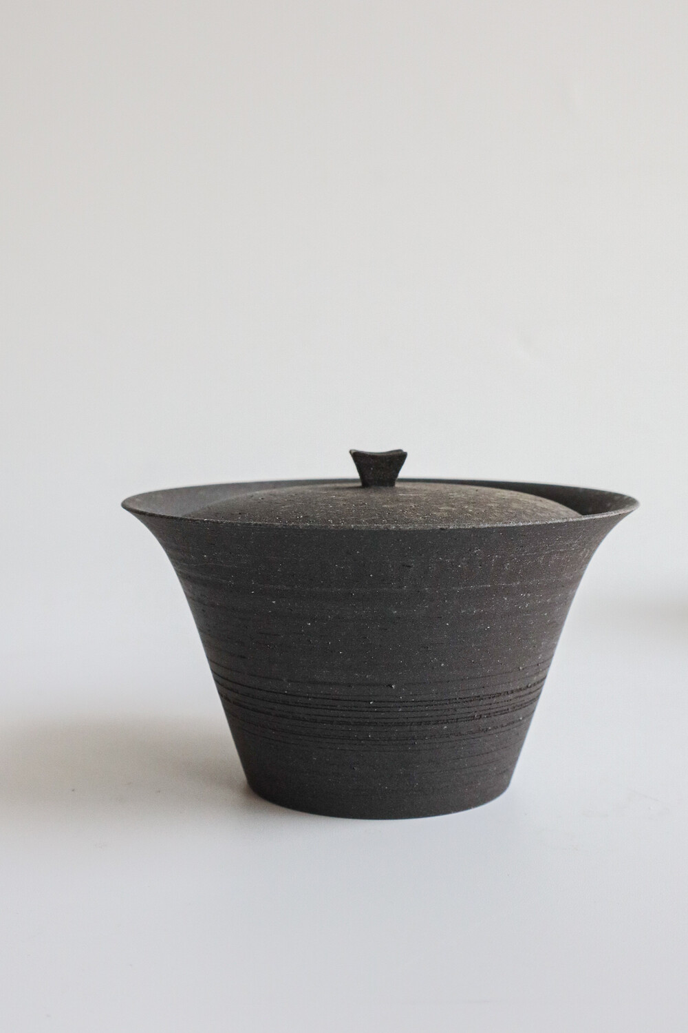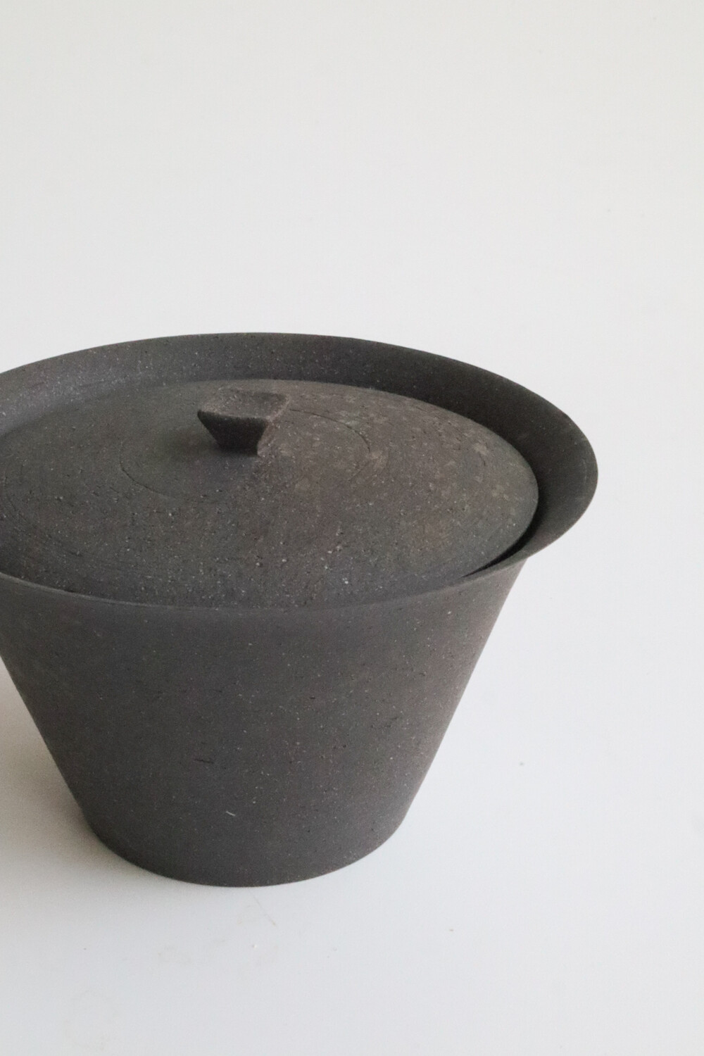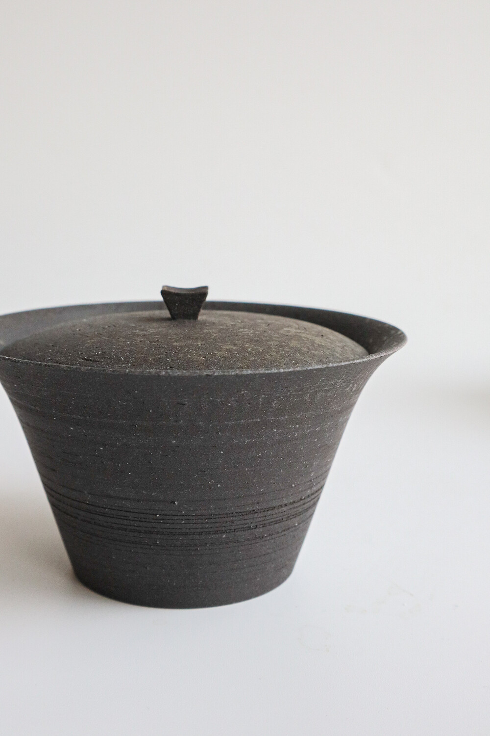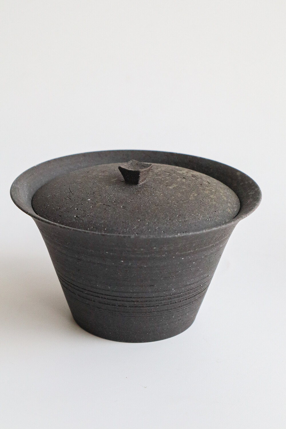 최민록 작가의 흑도 사각꼭지 개완입니다. 철분이 많이 함유되어 있는 검정색 소지로 작업 후 유약을 입히지 않고, 소성시 내화갑이라는 고온에서 견디는 상자 안에 작품을 넣은 후 그 주위에 숯을 쌓아 넣고 뚜껑을 닫아 연기가 작품에 스며 들 수 있게 작업하여 우리 전통 기와와 같은 느낌을 내었습니다.