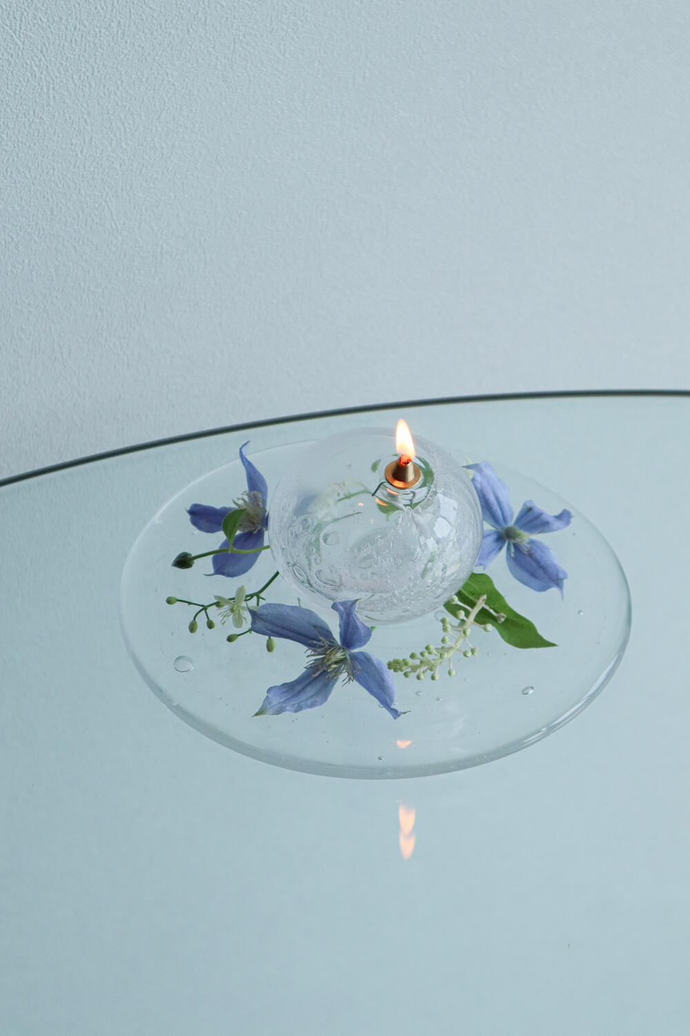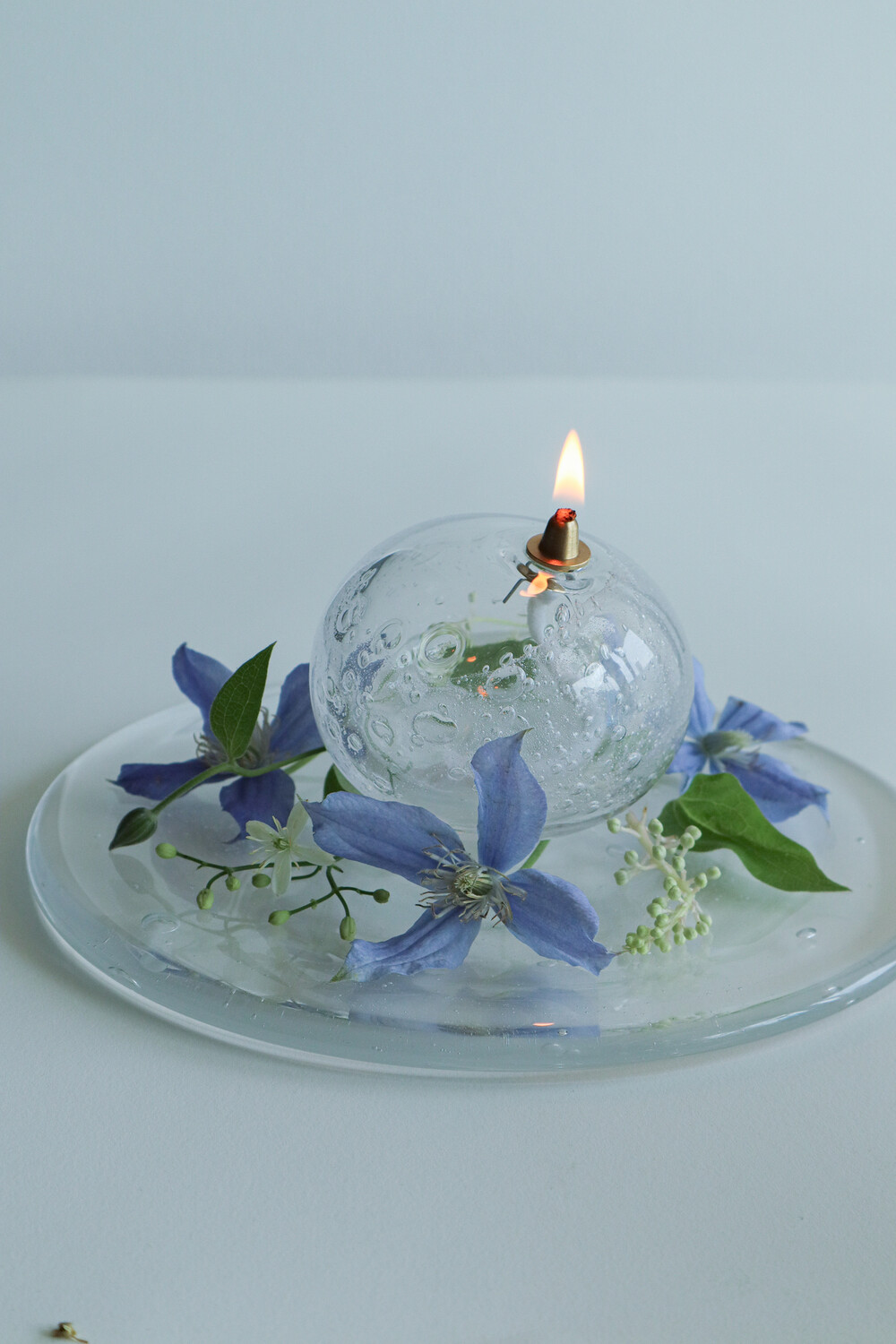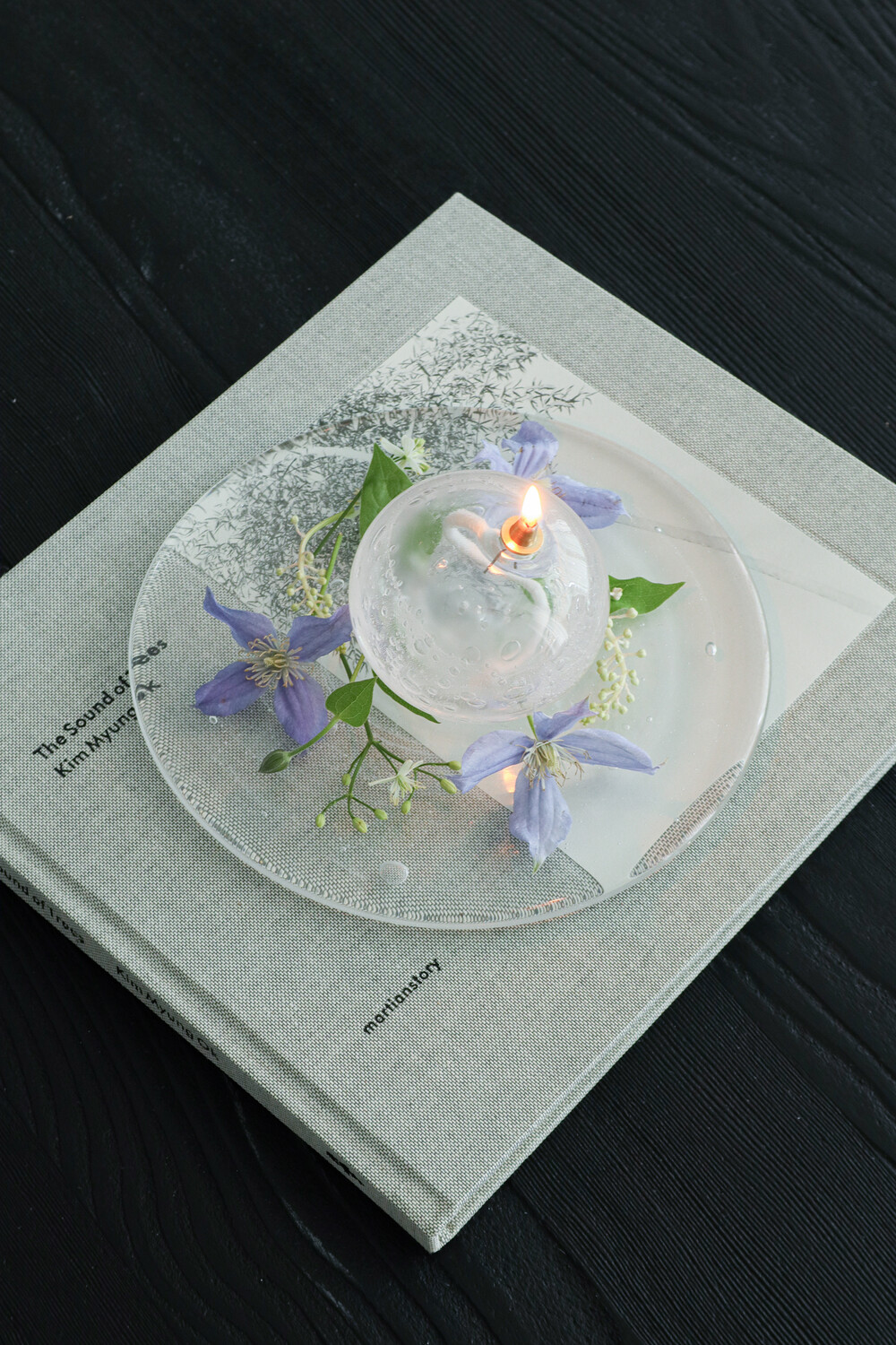 마버글라스의 접시 호롱입니다. 원형의 접시에 둥근 호롱이 부착된 형태입니다. 생화 등 다양한 장식을 더해 활용하시면 공간을 더욱 아름답게 밝혀줍니다.
