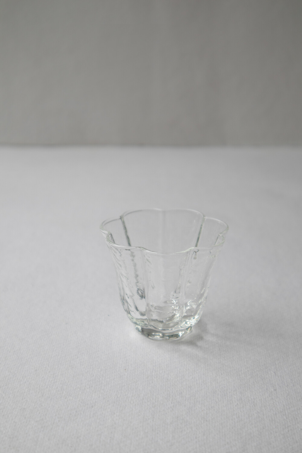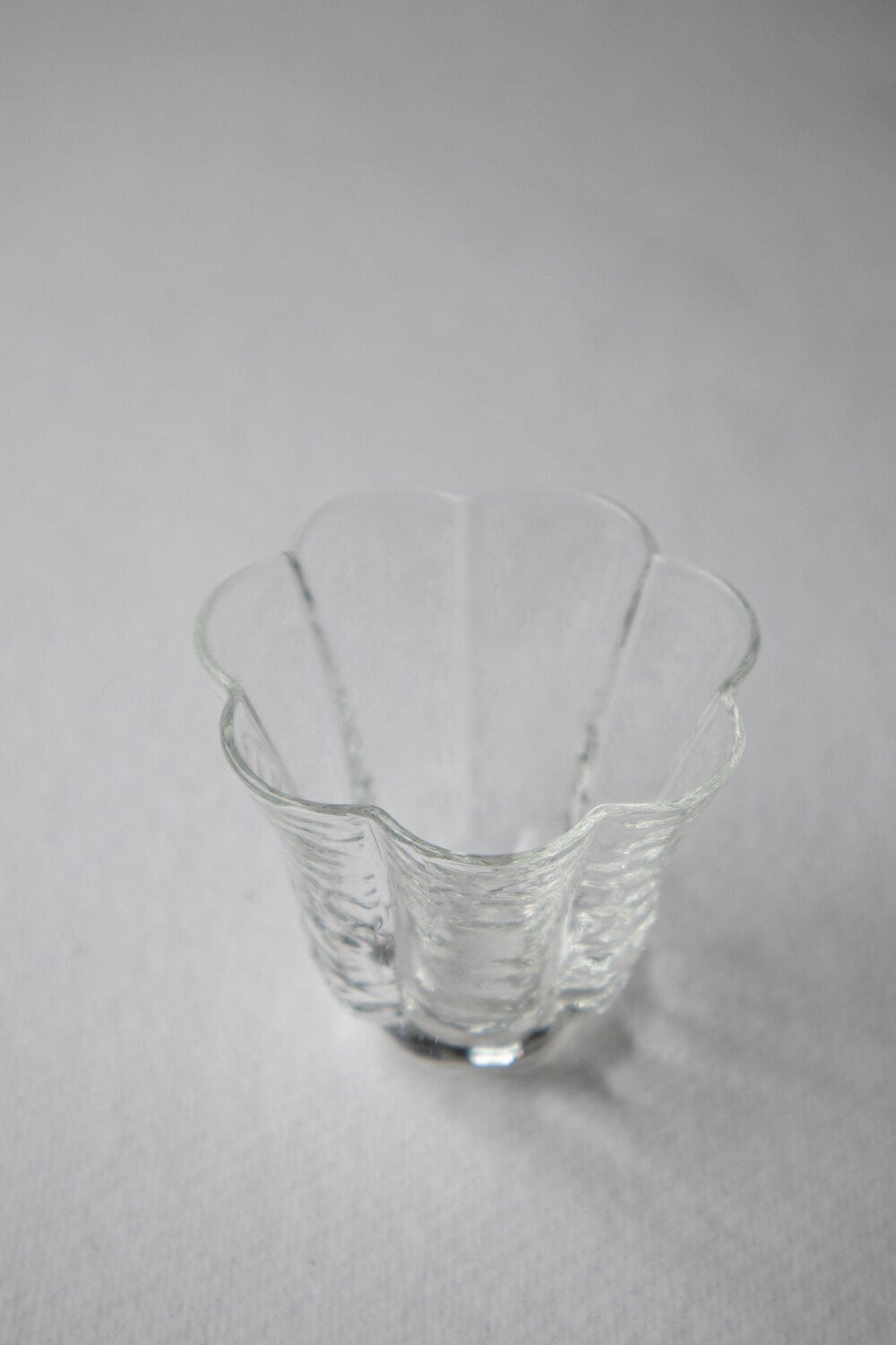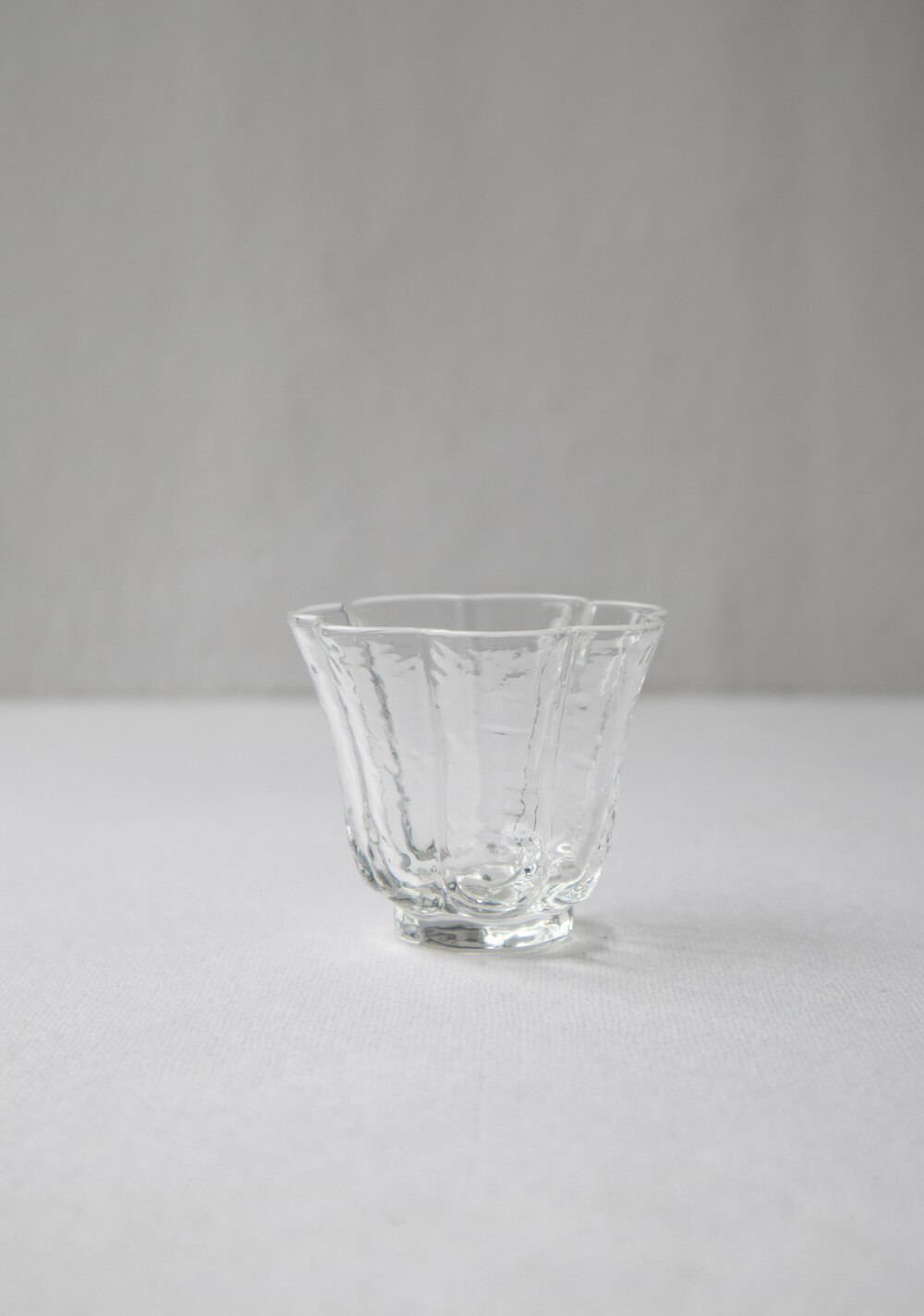 꽃잎 모양의 유리 찻잔입니다. 유리에 불규칙한 요철이 있어서 빛이 비치면 유리가 더욱 영롱하게 빛이 납니다.