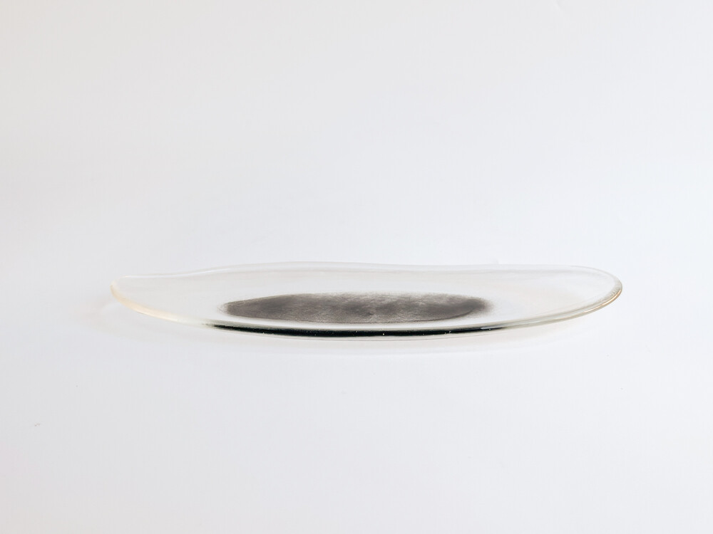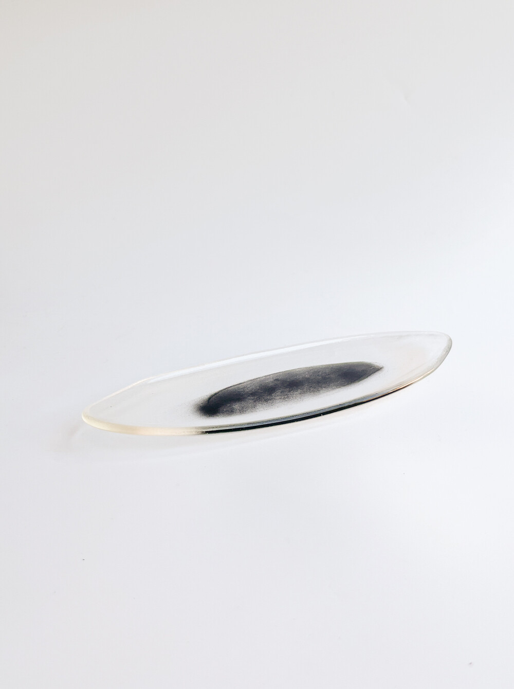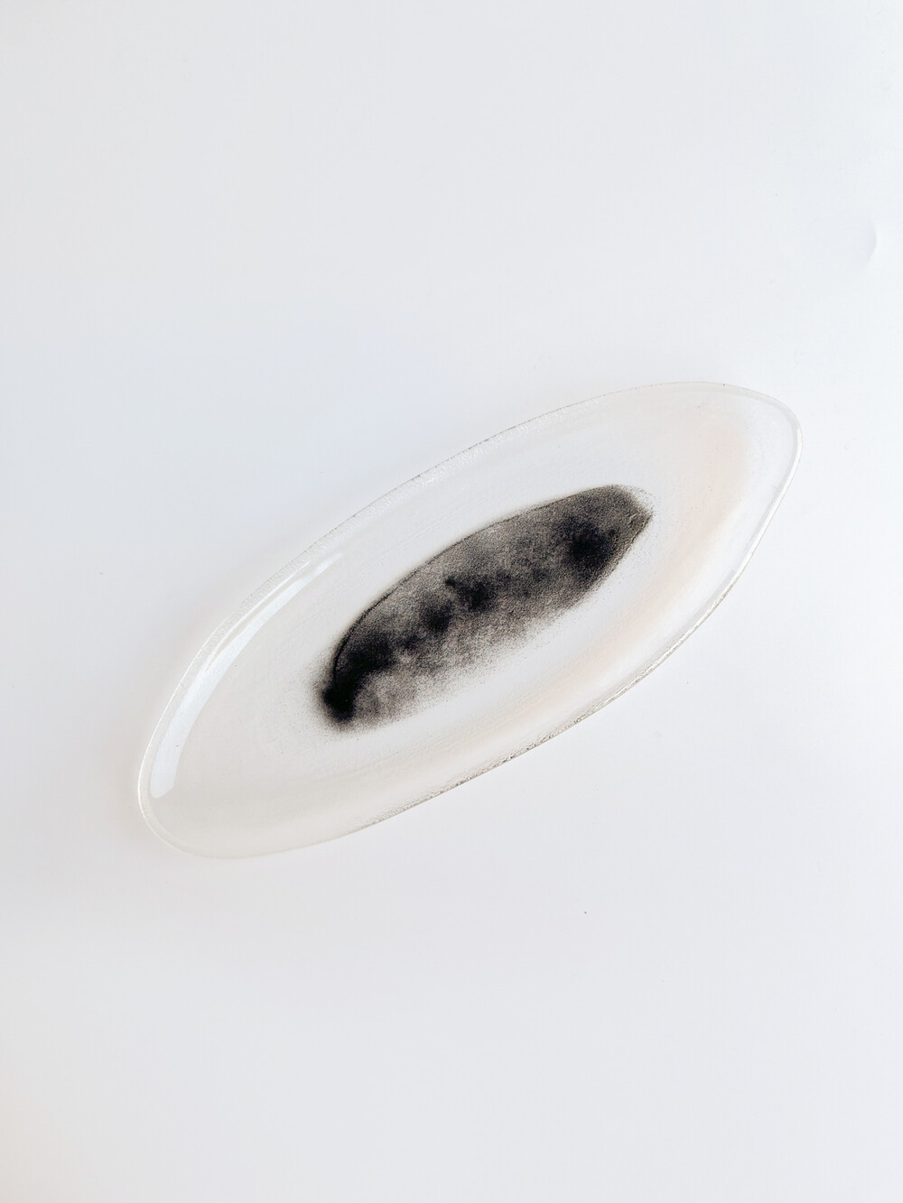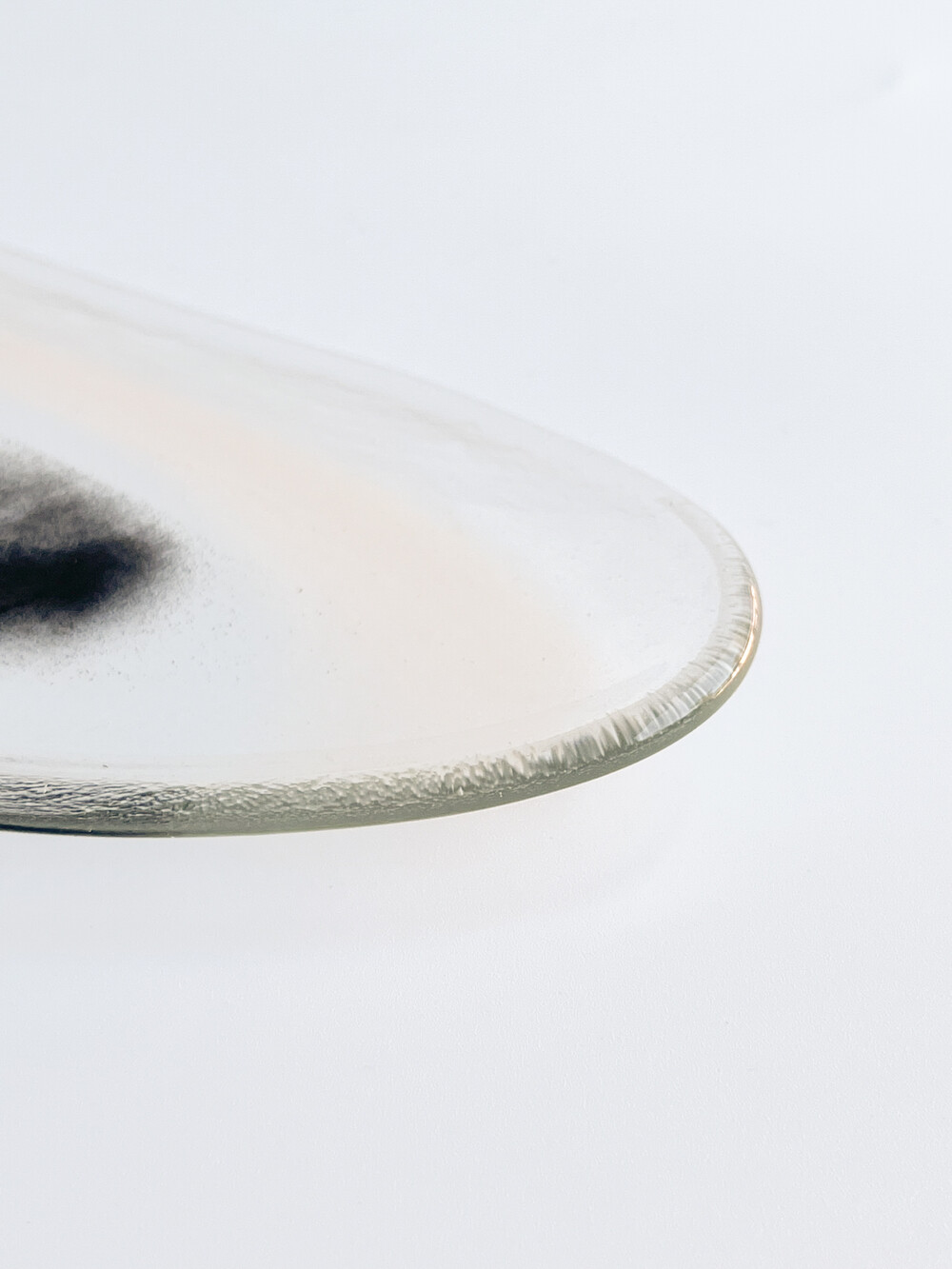 유리편집 김은주 작가의 수묵화 타원 접시입니다. 테두리의 비정형정인 라인감과 긴 형태가 돋보입니다. 투명 유리와 가운데 흑의 대비가 마치 잔잔한 수묵화를 연상하게 합니다. 과일이나 치즈 등을 올려 플레이트 용도로 혹은 문구류를 담는 트레이 용도로 다양하게 활용해보시길 바랍니다.