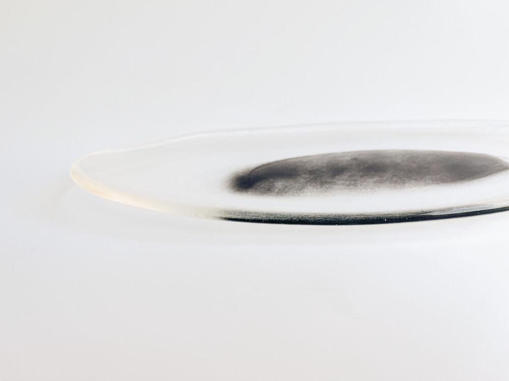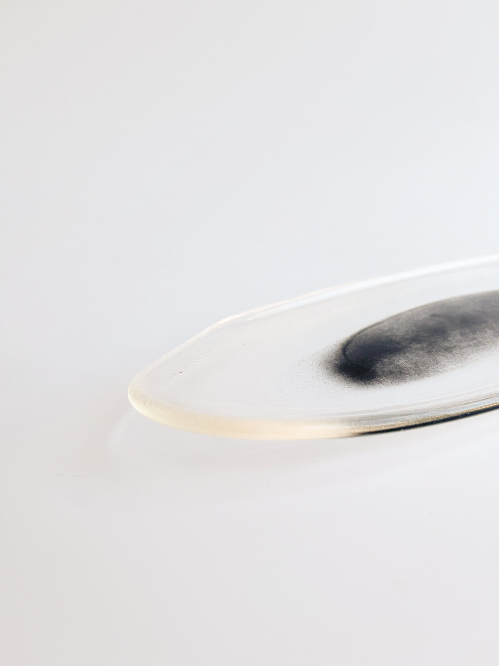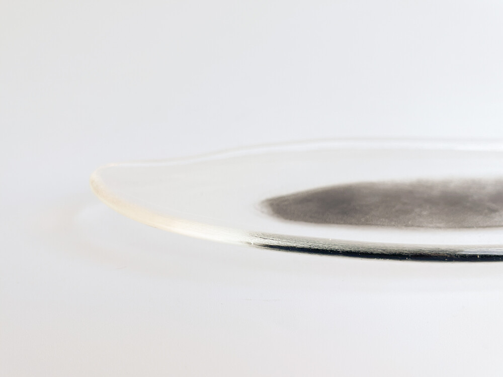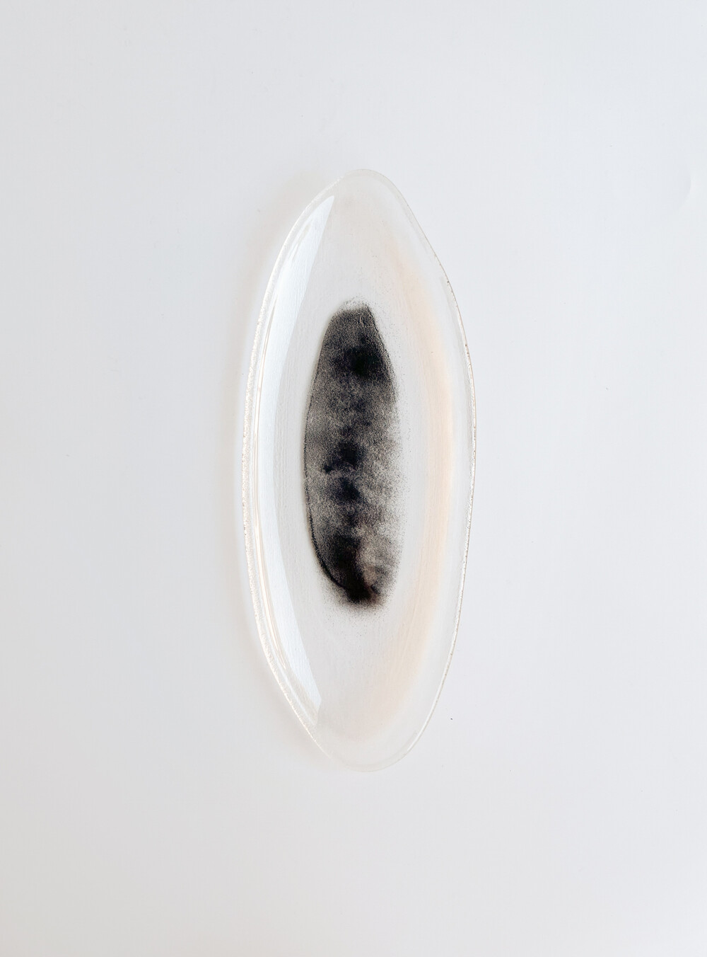유리편집 김은주 작가의 수묵화 타원 접시입니다. 테두리의 비정형정인 라인감과 긴 형태가 돋보입니다. 투명 유리와 가운데 흑의 대비가 마치 잔잔한 수묵화를 연상하게 합니다. 과일이나 치즈 등을 올려 플레이트 용도로 혹은 문구류를 담는 트레이 용도로 다양하게 활용해보시길 바랍니다.