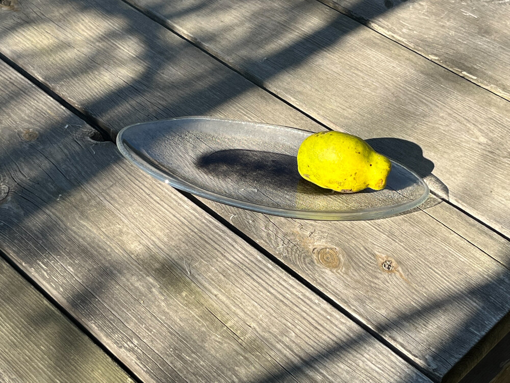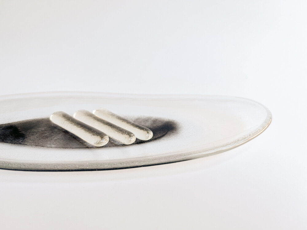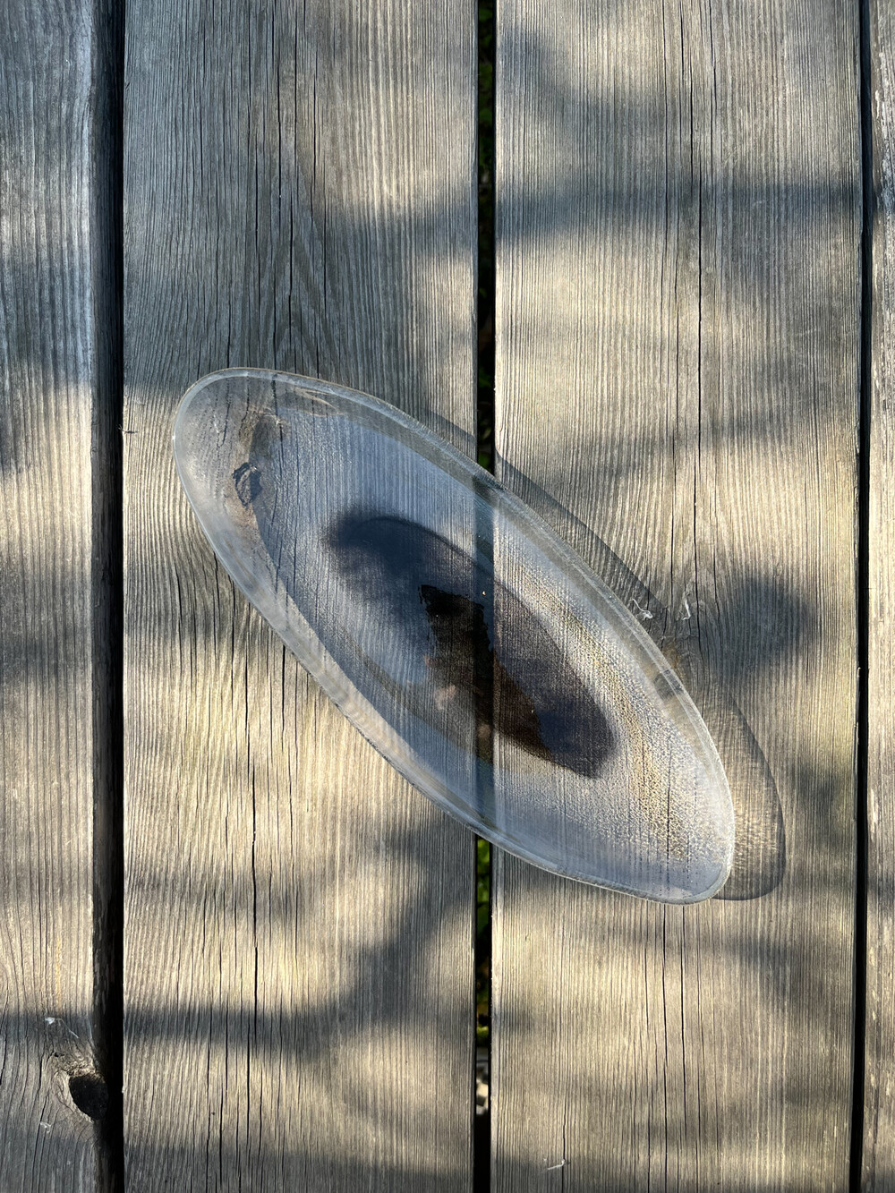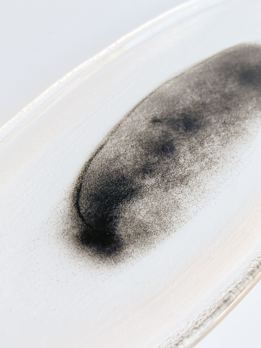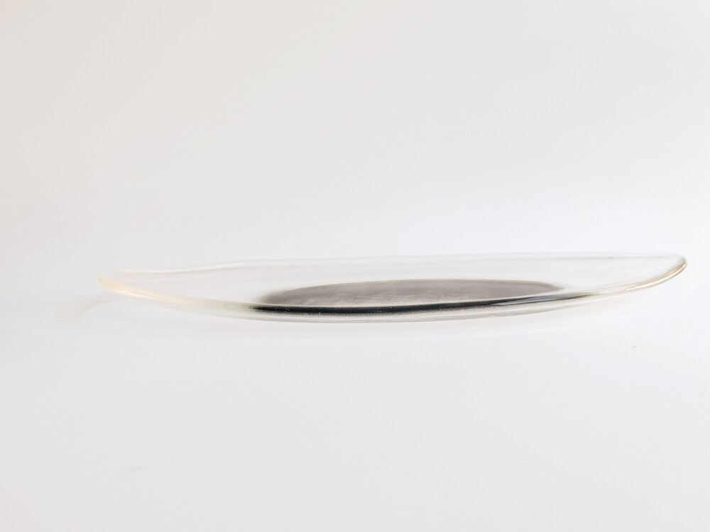 유리편집 김은주 작가의 수묵화 타원 접시입니다. 테두리의 비정형정인 라인감과 긴 형태가 돋보입니다. 투명 유리와 가운데 흑의 대비가 마치 잔잔한 수묵화를 연상하게 합니다. 과일이나 치즈 등을 올려 플레이트 용도로 혹은 문구류를 담는 트레이 용도로 다양하게 활용해보시길 바랍니다.