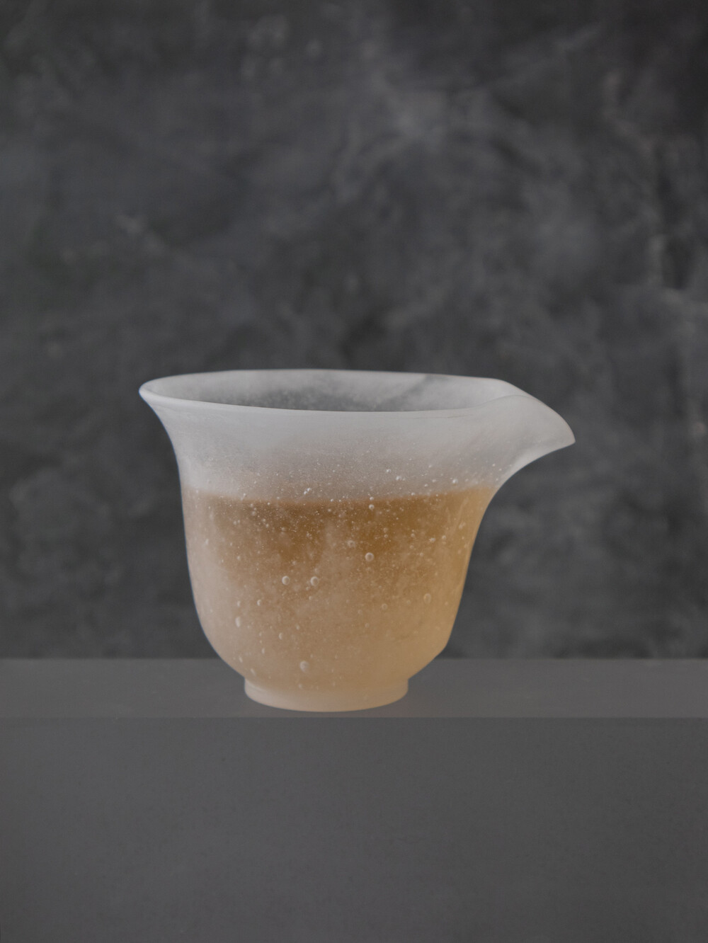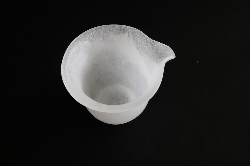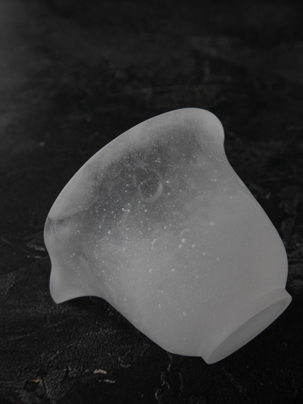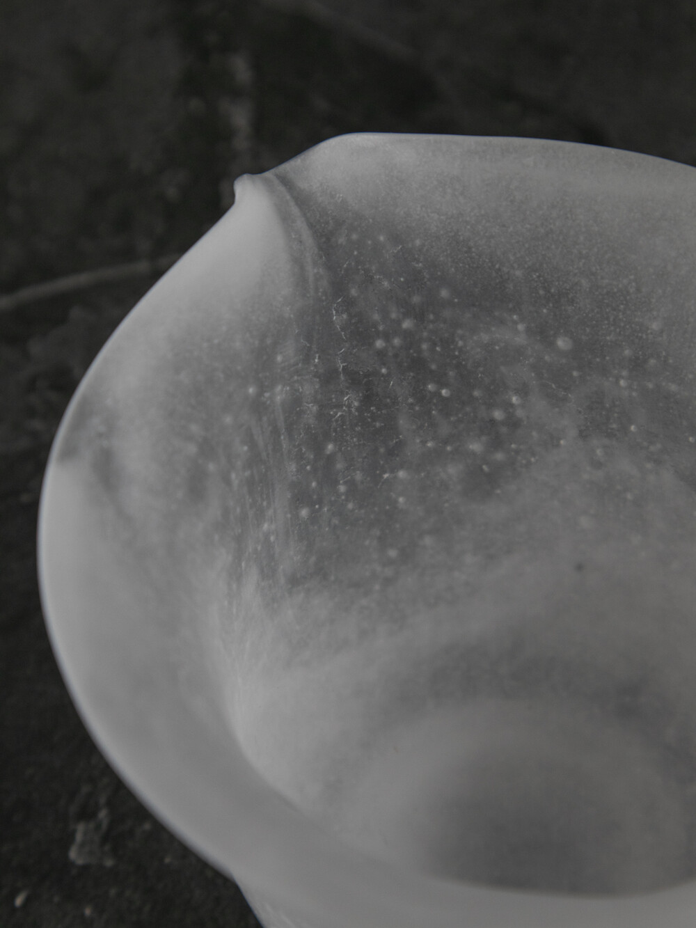 베르비에 유하나 작가의 눈결 유리 숙우입니다. 유리캐스팅 기법으로 만들어졌으며, 유리 파우더와 공기가 만나며 만들어진 무늬가 겨울에 사뿐히 내린 눈 같기도 꽁꽁 언 얼음 사이로 보이는 결정 같기도 합니다. 특히 찻물을 담으면 뽀얗게 찻물이 빛나며 유리의 질감들이 고스란히 드러 나는데 이때는 마치 달의 표면처럼 느껴지기도 합니다. 참 다양한 매력을 가진 작품입니다. 한 손에 들어오는 알맞은 크기에 매끄럽고 보들보들한 촉감 덕분에 자꾸만 사용하고 싶어집니다. 다가오는 겨울, 눈결을 닮은 베르비에의 작품들과 함께 포근하고 아름다운 찻자리를 가지시길 바랍니다.