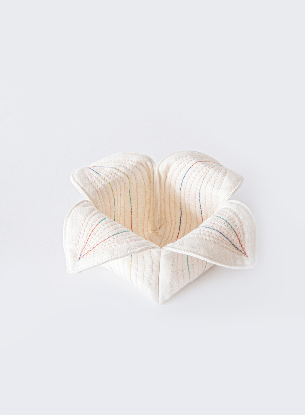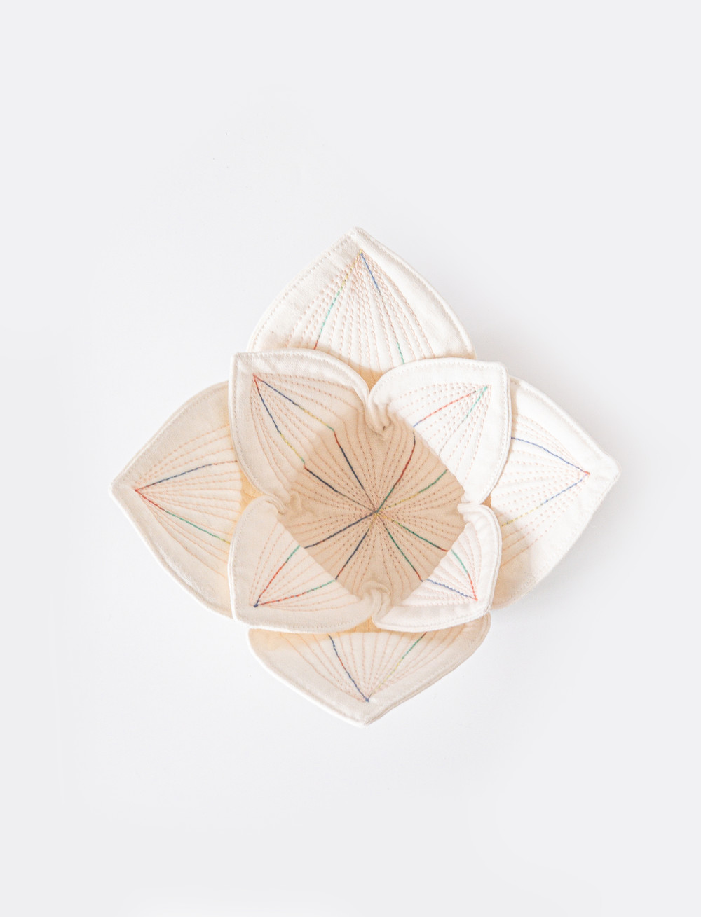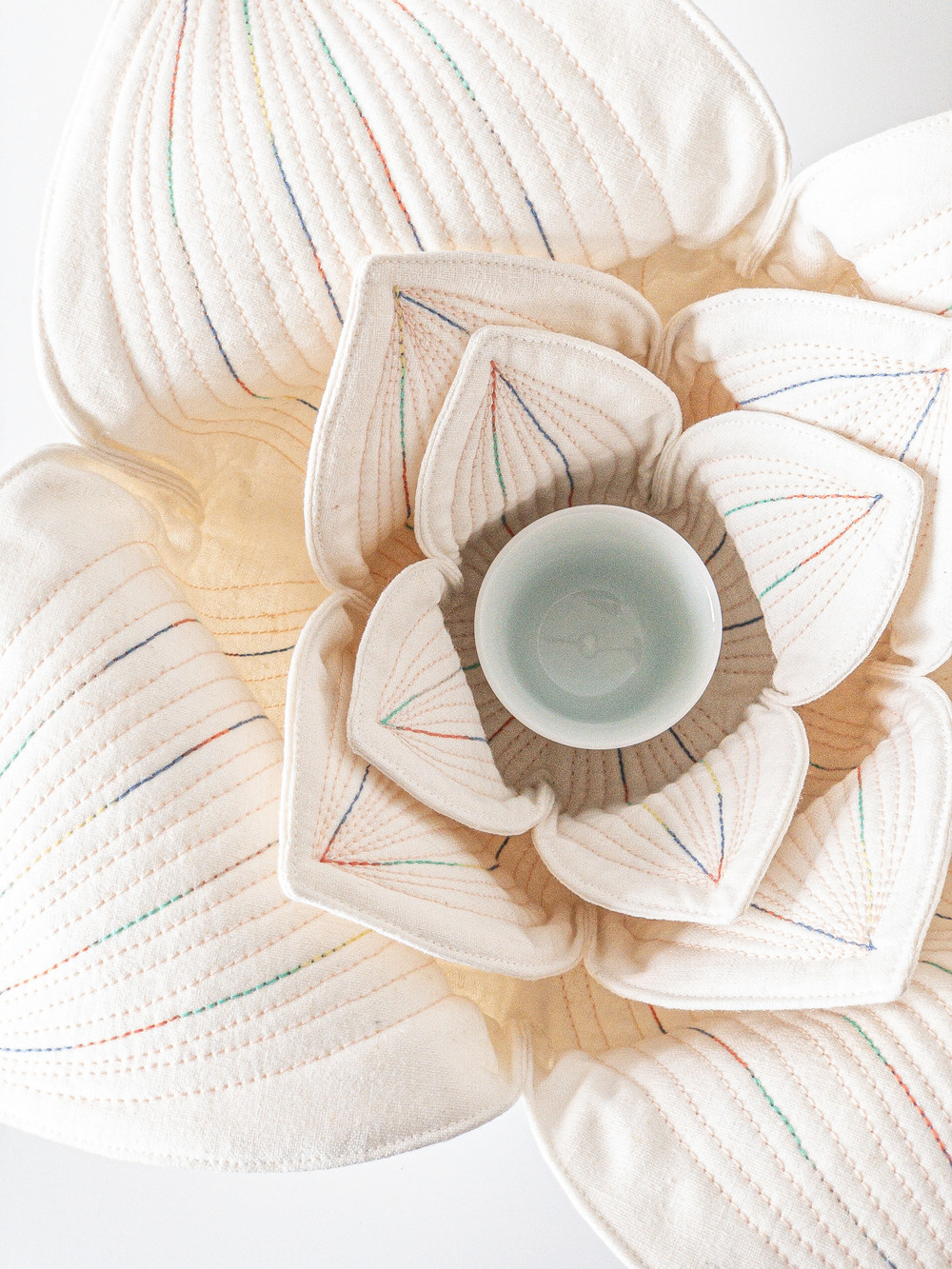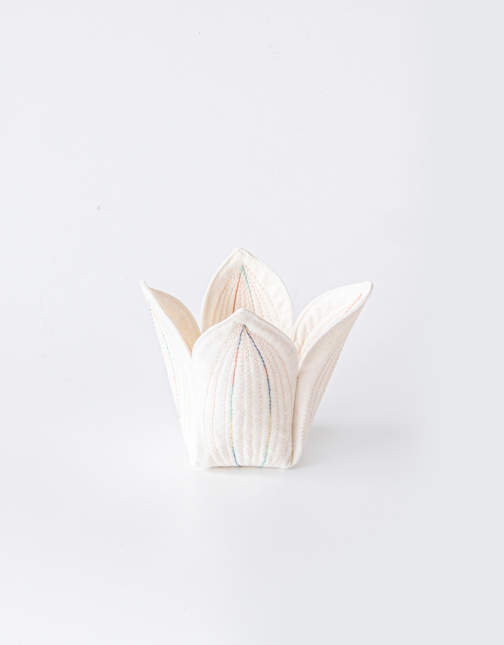 뵤량의 연꽃 모양 누비 바구니(S)입니다. 전통 누비 기법을 모던하게 재해석한 제품으, 원단과 원단 사이에 솜을 넣고 그 위에 재봉틀로 선을 끊이지 않게 촘촘하게 이어 누빔과 꽃잎의 결을 완성합니다. S 사이즈는 아주 작은 사이즈로 아끼는 잔 하나를 넣어 보관하거나, 일상에서 잃어버리기 쉬운 반지,귀걸이 등 작고 귀중한 물건들을 넣어서 사용해보세요. 다른 사이즈들과 겹쳐 활용하시면 활짝 피어난 연꽃을 연상시켜 훌륭한 일상 속 오브제가 됩니다. 그 자체로도 선물용으로 좋으며, 바구니 속 작은 선물을 넣어 더욱 따뜻하고 소중한 마음을 전달하셔도 좋습니다.
