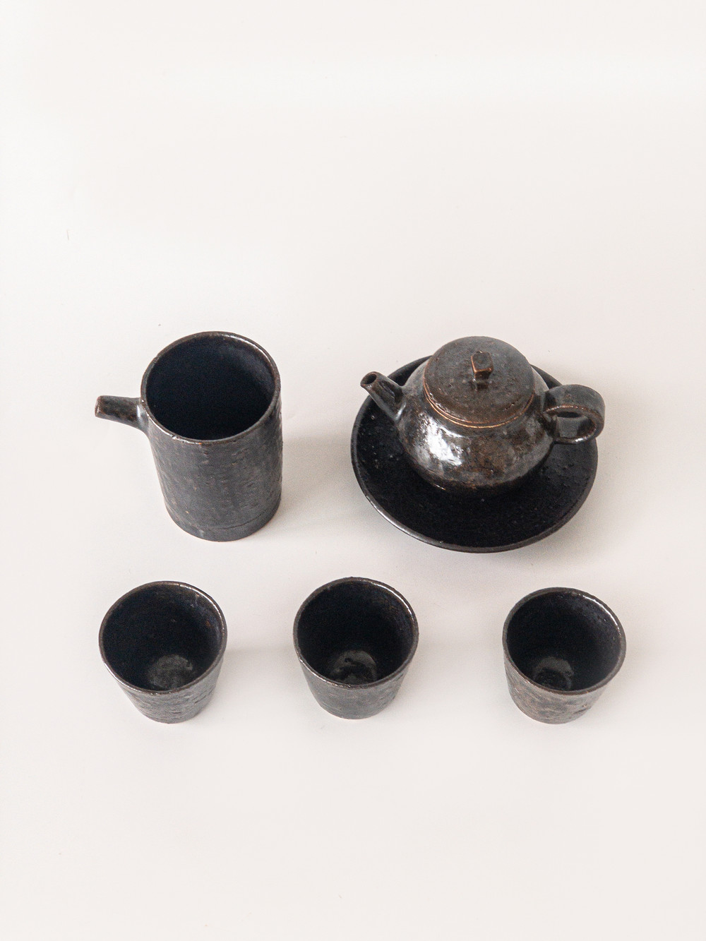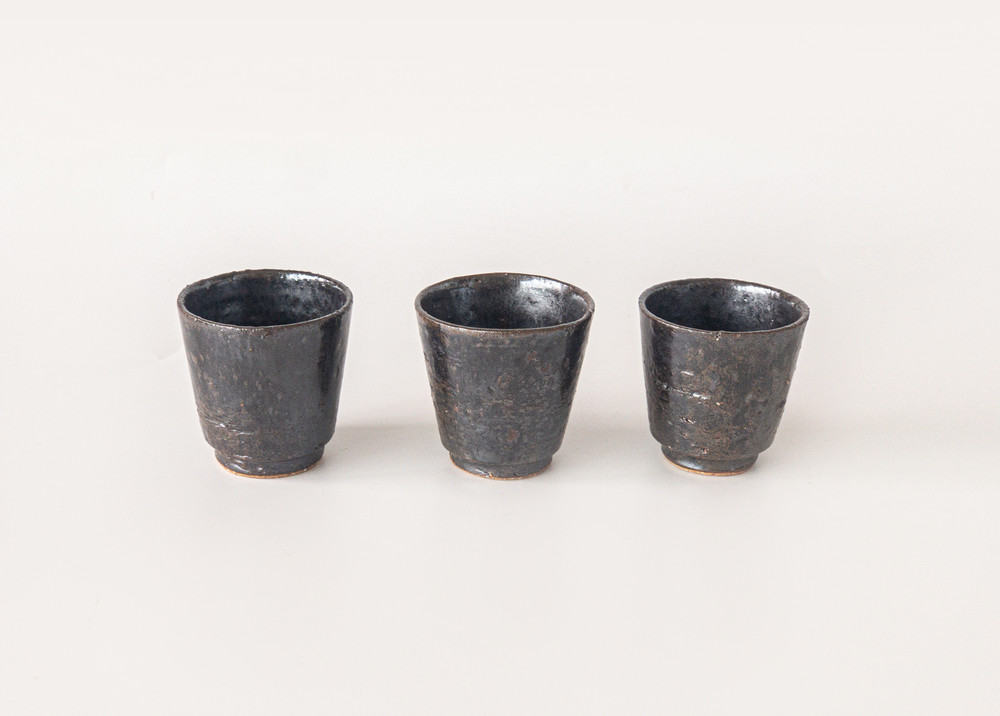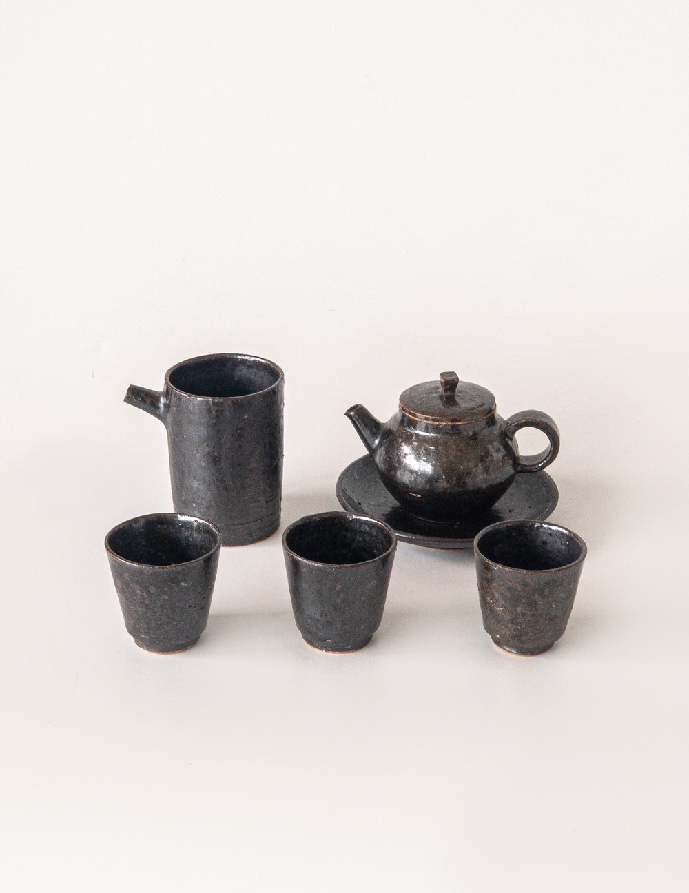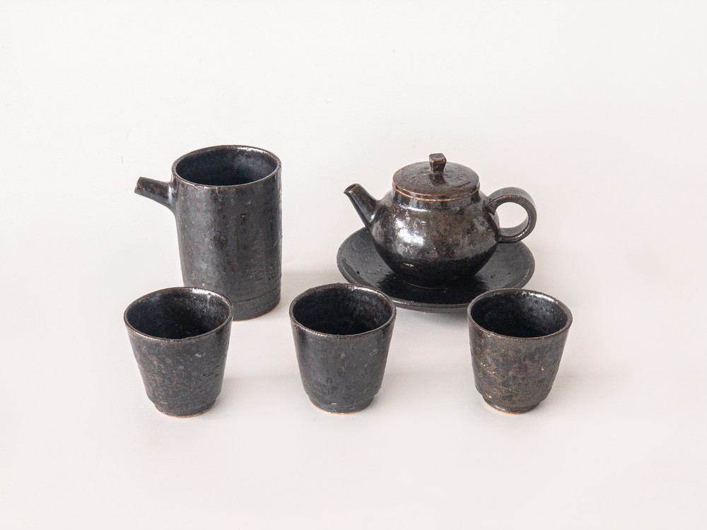 도예공방 섬김 김동건 작가님의 흑유 다구세트입니다. 다관, 다관받침, 숙우, 잔들로 구성되어 있습니다. 차도구의 가장 심플하고 모던한 형태를 표현하였습니다. 거친 태토를 사용하여 크고 작은 요철들이 있는 질감이 멋스럽습니다. 흑유를 사용하여 묵직하고 고급스러운 분위기를 냅니다.