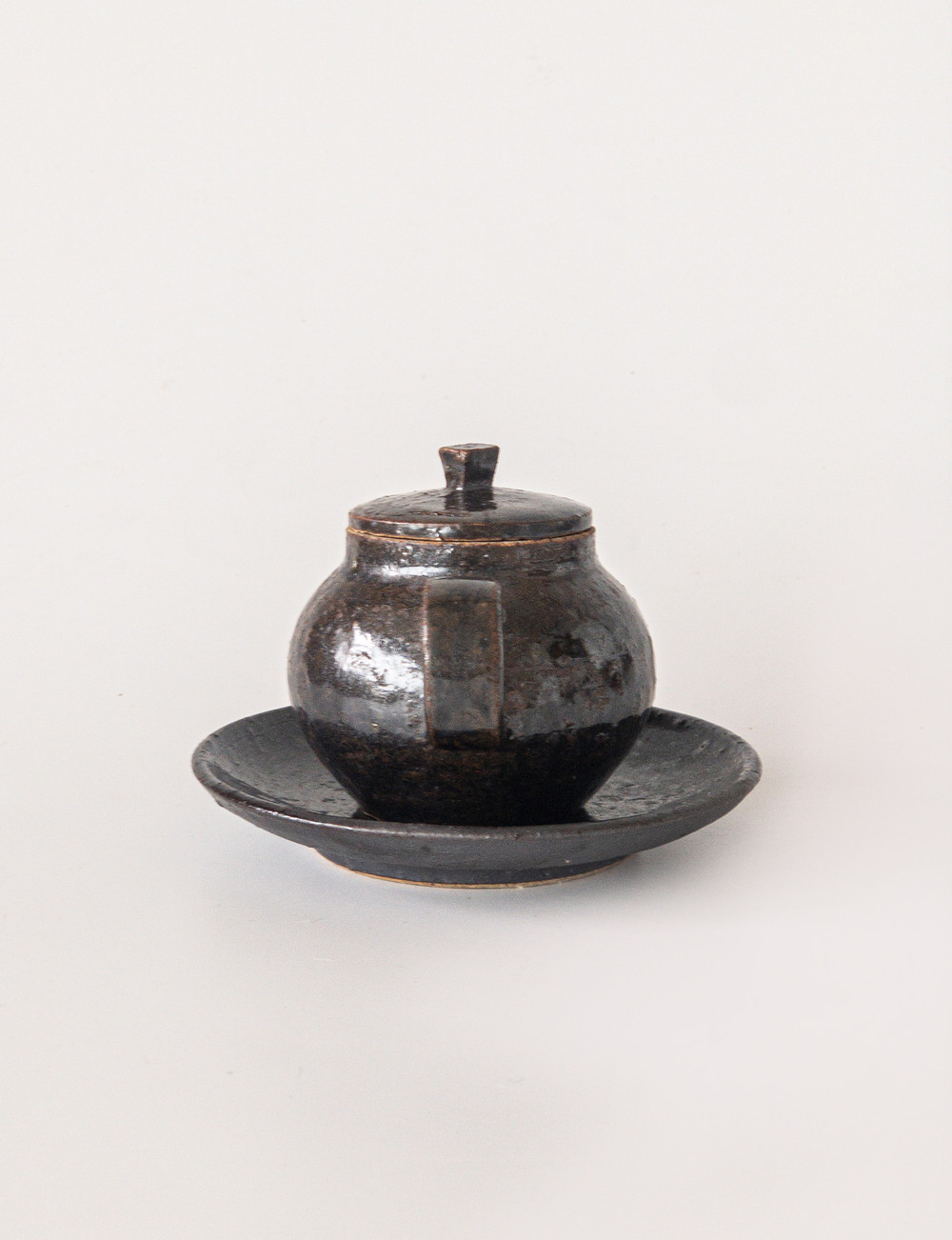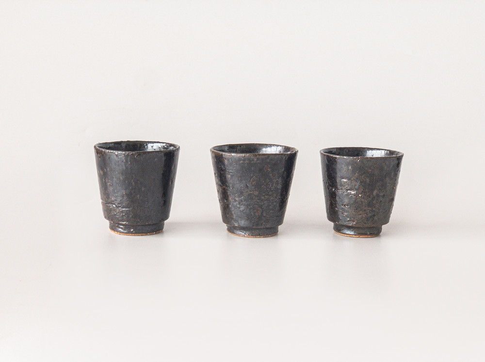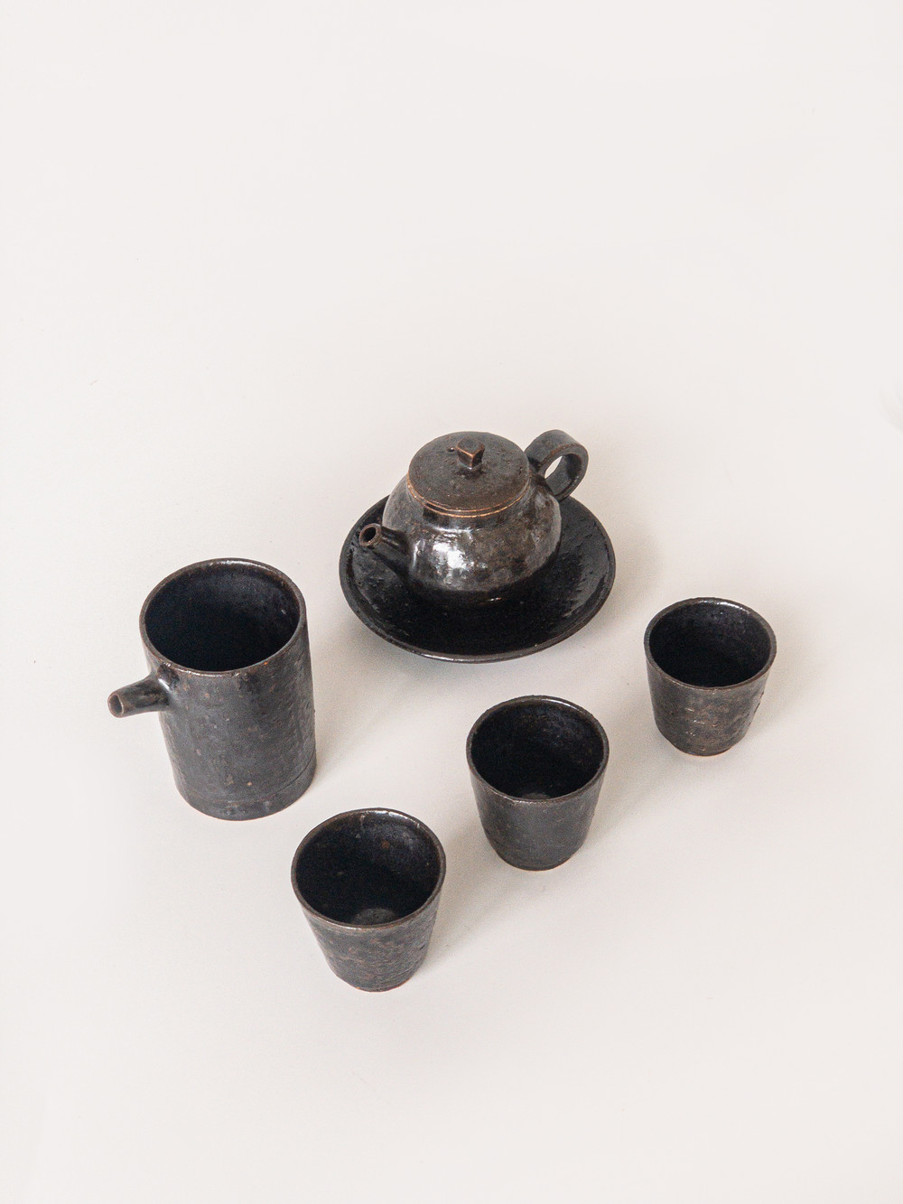 도예공방 섬김 김동건 작가님의 흑유 다구세트입니다. 다관, 다관받침, 숙우, 잔들로 구성되어 있습니다. 차도구의 가장 심플하고 모던한 형태를 표현하였습니다. 거친 태토를 사용하여 크고 작은 요철들이 있는 질감이 멋스럽습니다. 흑유를 사용하여 묵직하고 고급스러운 분위기를 냅니다.
