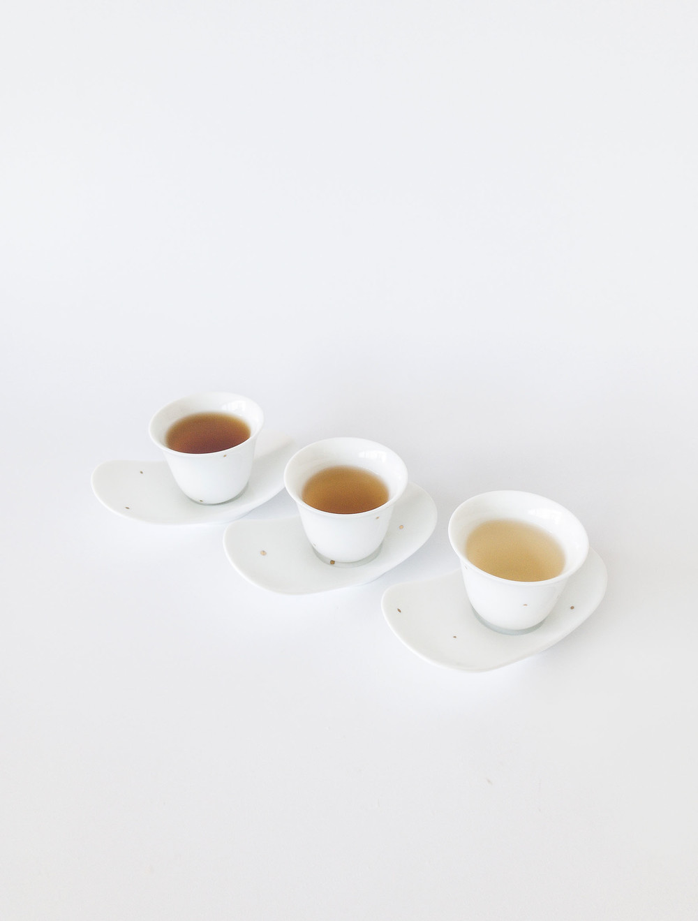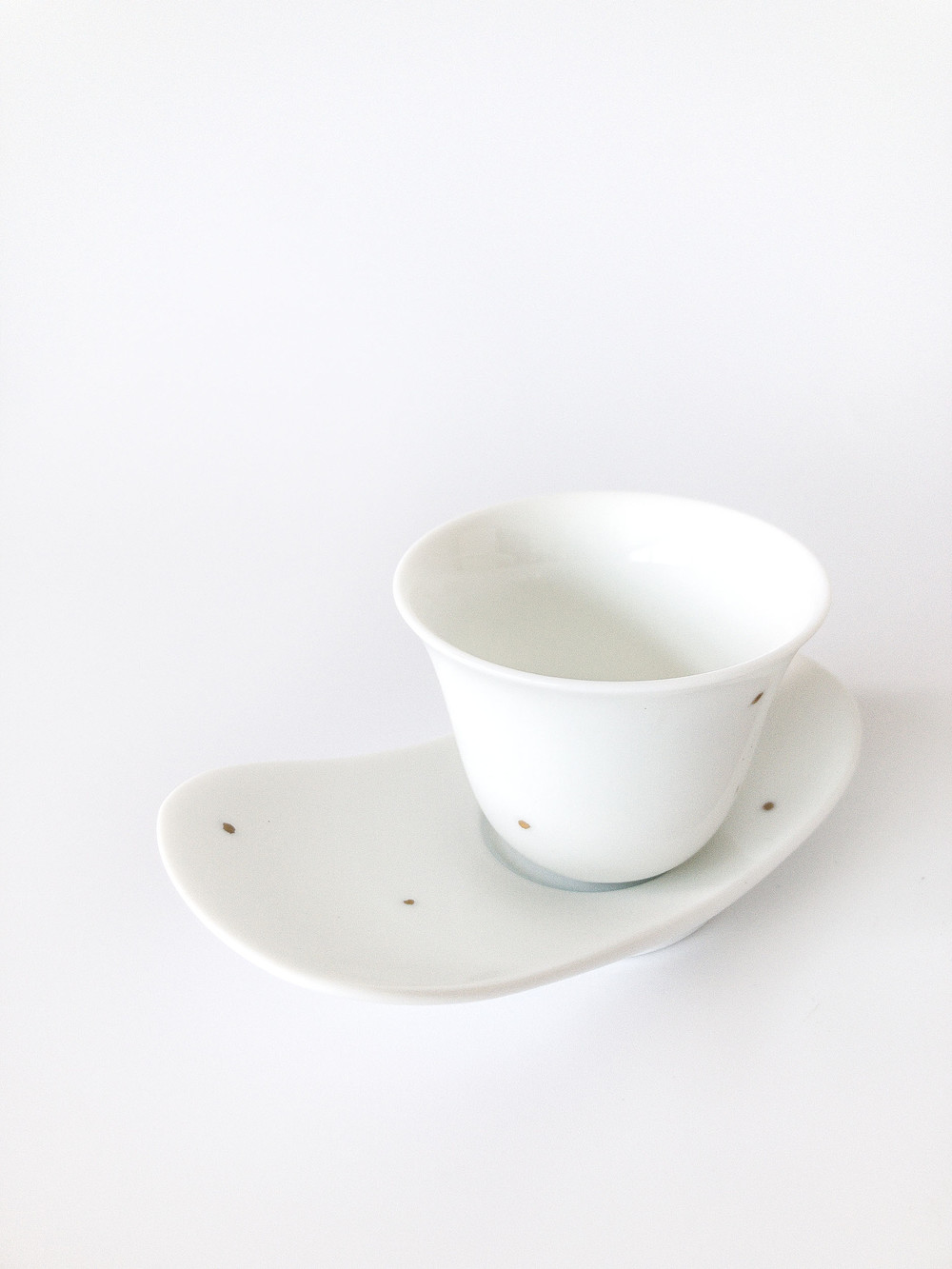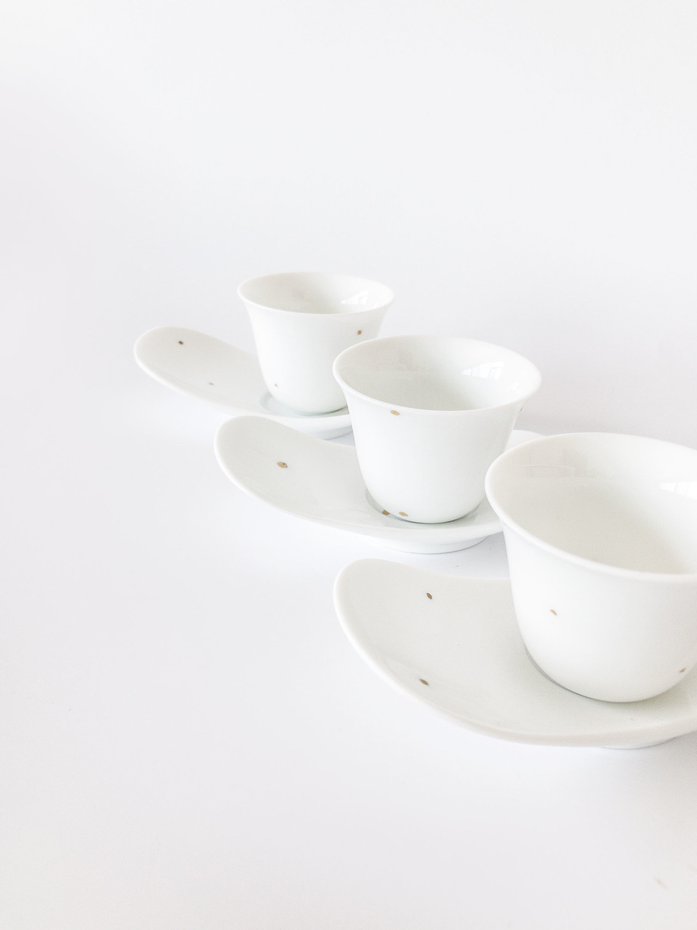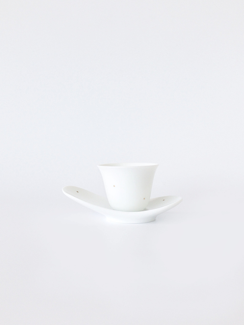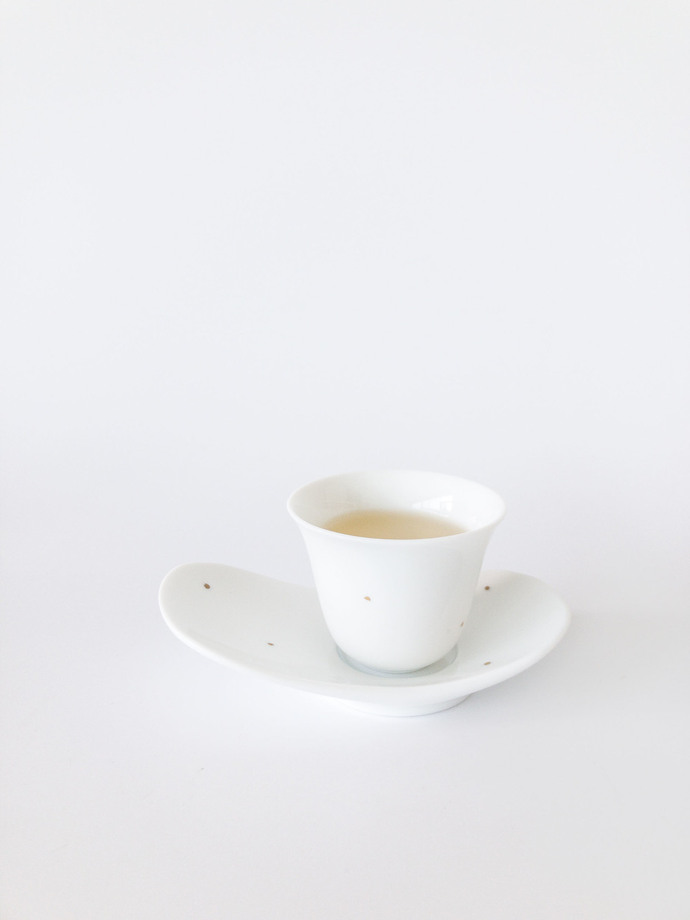 백자 찻잔과 잔받침 세트입니다. 잔받침의 모양이 한쪽이 더 길어 독특하며, 전체적으로 유연하게 곡이져 우아한 분위기를 냅니다. 백색 위에 금박 도트무늬가 포인트가 되며 지루함을 덜어줍니다. 잔마다 금박의 모양이나 위치 등이 다를 수 있으며 제품은 랜덤으로 발송됩니다.
