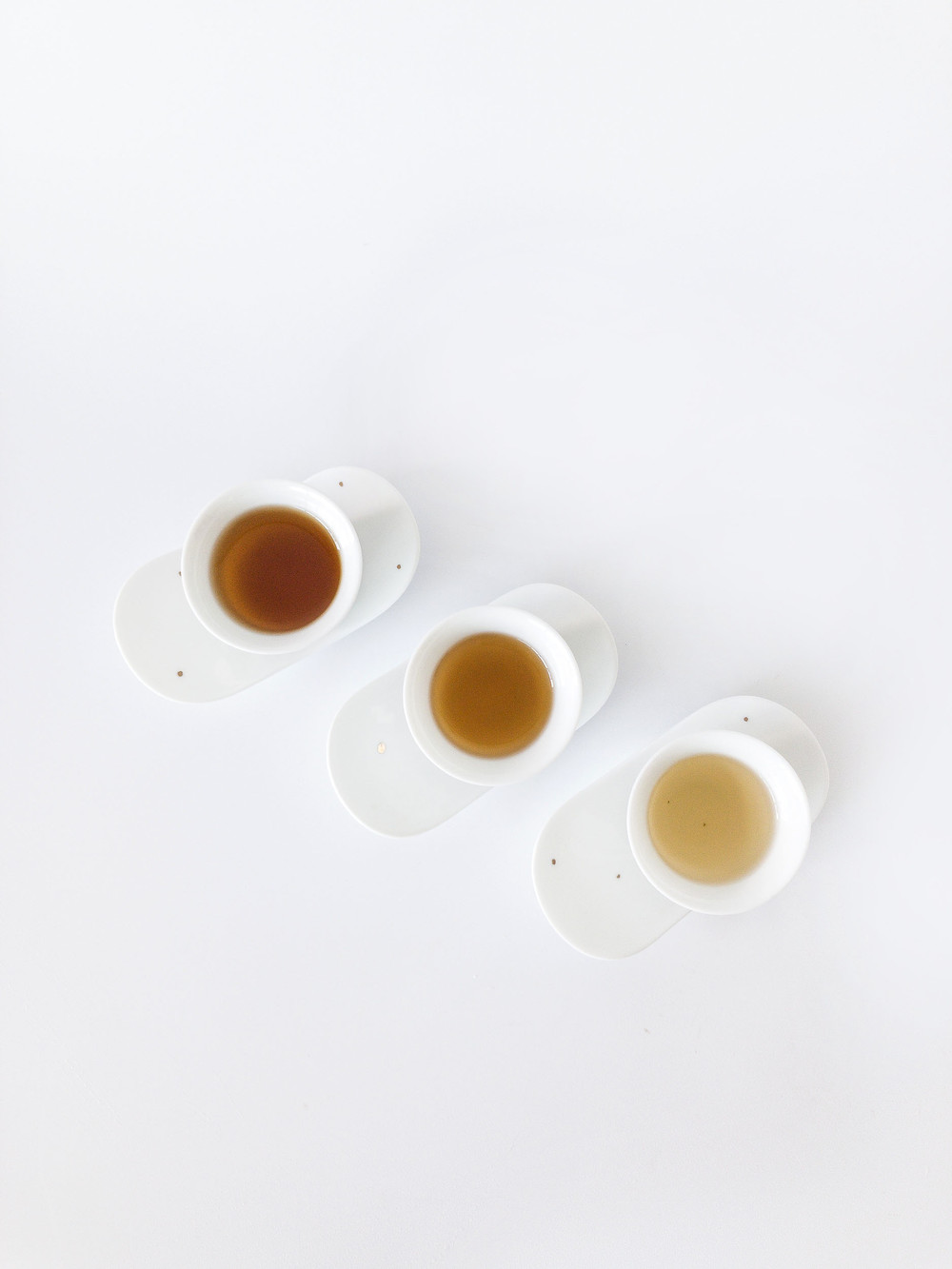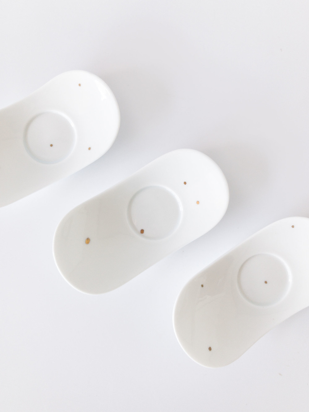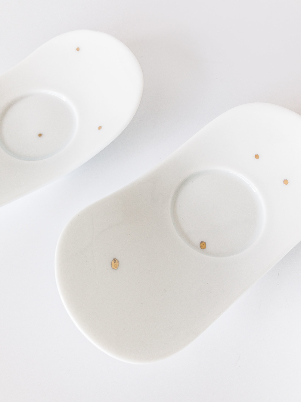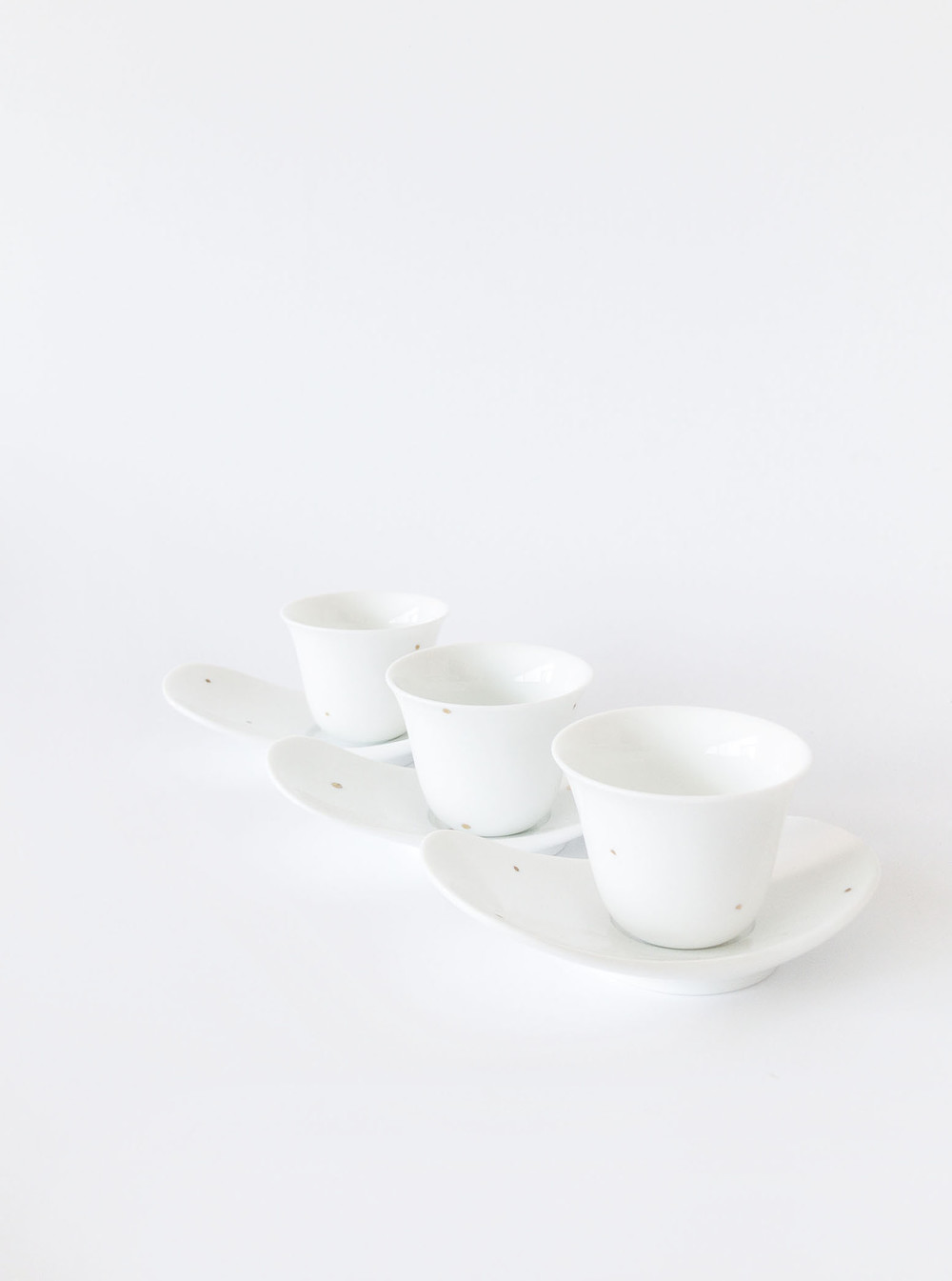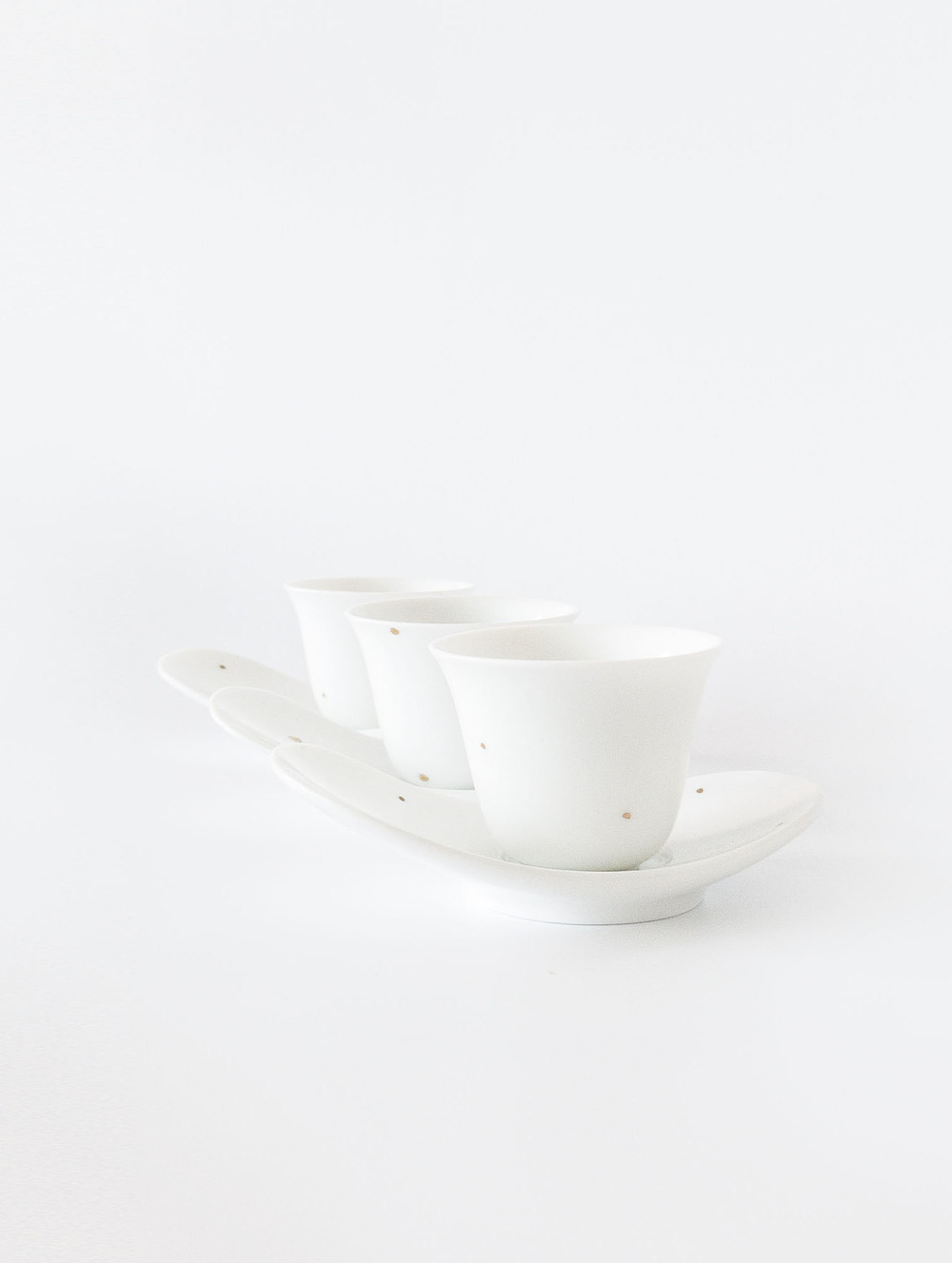 백자 찻잔과 잔받침 세트입니다. 잔받침의 모양이 한쪽이 더 길어 독특하며, 전체적으로 유연하게 곡이져 우아한 분위기를 냅니다. 백색 위에 금박 도트무늬가 포인트가 되며 지루함을 덜어줍니다. 잔마다 금박의 모양이나 위치 등이 다를 수 있으며 제품은 랜덤으로 발송됩니다.