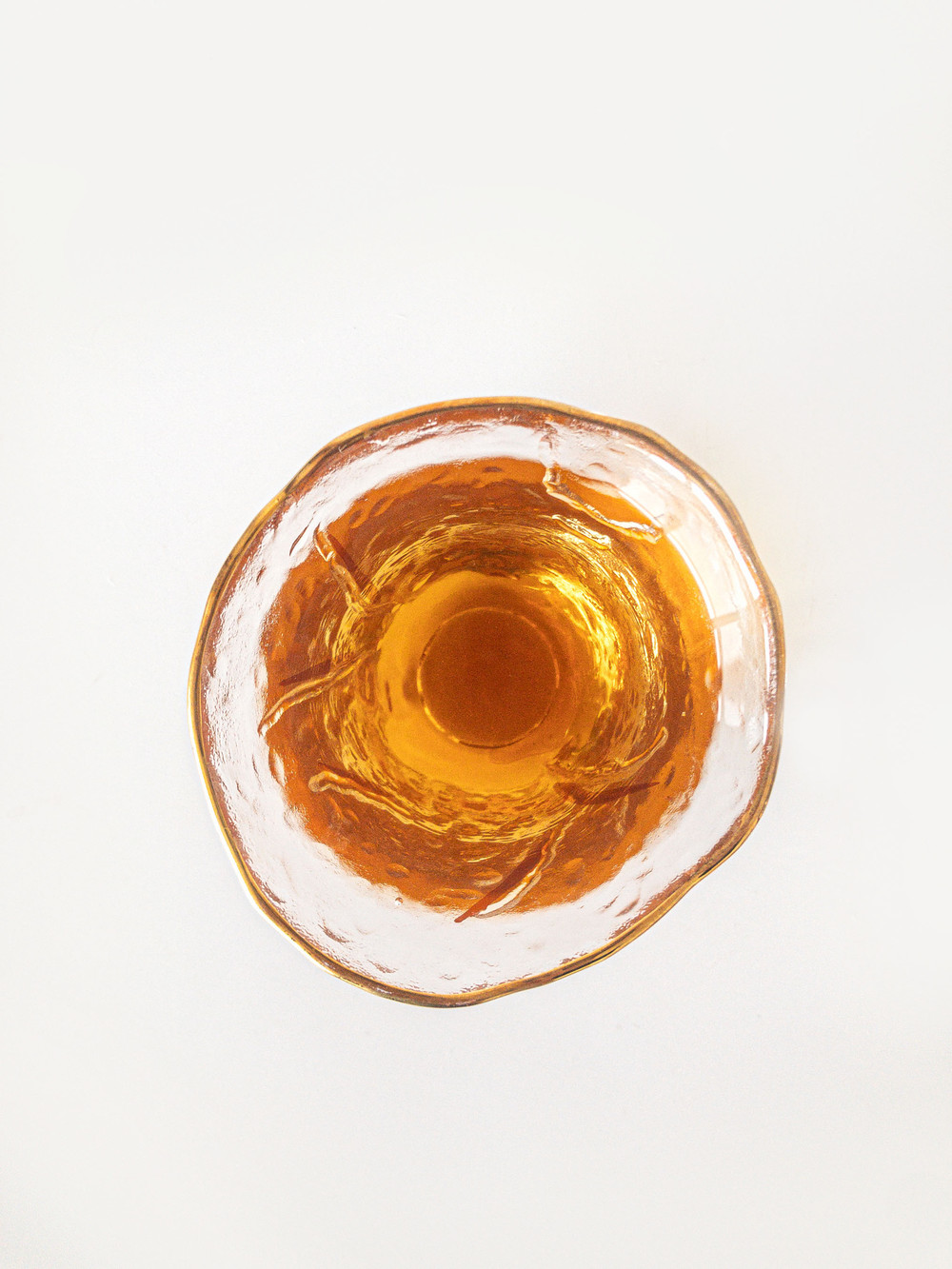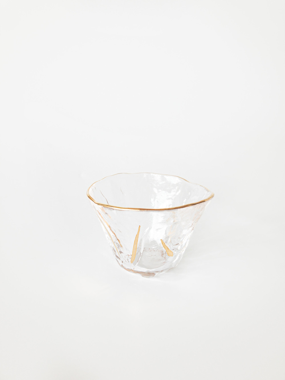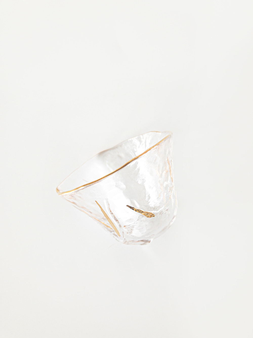 비정형적인 모양이 인상적인 유리 찻잔입니다. 고급 유리로 만들어져 견고하며, 유리 표면에 요철이 있어 찻물을 따랐을 때 빛이 난반사되며 영롱하게 반짝입니다. 손에 잡히는 감과 입술에 닫는 느낌이 좋아 손이 자주가는 제품입니다. 테두리와 표면에 금으로 장식이 되어 있어 고급스럽고 매력적인 제품으로, 금테두리가 있는 유리개완 제품과 함께 하시길 추천드립니다. 입고 시마다 칠해진 금 무늬가 조금씩 다를 수 있습니다.