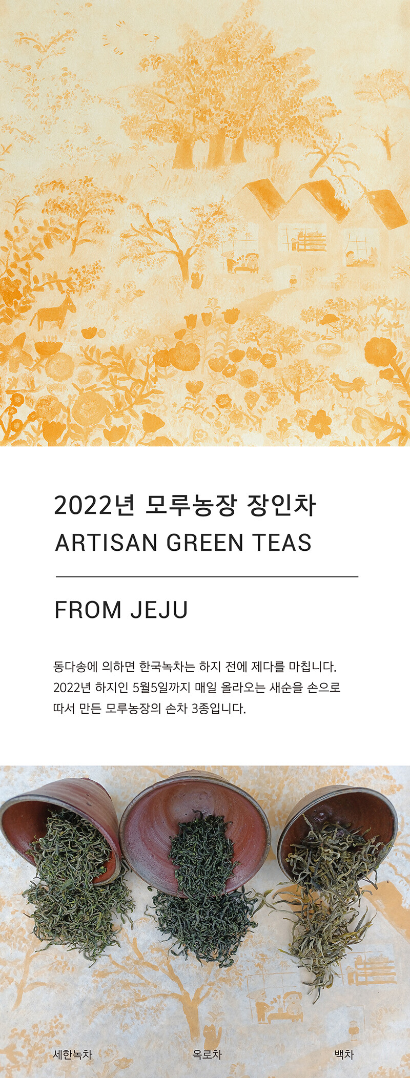 제주도에 위치한 청정 유기농 다원인 모루농장의 22년 햇차인 장인차 3종을 소개합니다. 동다송에 의하면 한국녹차는 하지 전에 제다를 마칩니다. 2022년 하지인 5월 5일까지 매일 올라오는 새순을 손으로 따서 만든 모루농장의 손차입니다. 옵션에서 종류를 선택하여주시고, 세트 상품은 할인된 가격으로 만나보실 수 있습니다. 추가옵션을 통해 오동나무상자 선물포장이 가능하오니 소중한 분께 신선한 햇차로 마음을 전해보세요.