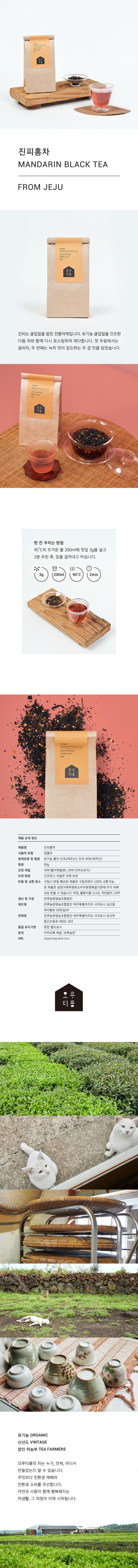 제주도에 위치한 청정 유기농 다원인 모루농장의 모루티룸 진피홍차 잎차(50g)입니다. 진피 홍차에 쓰인 진피는 귤껍질을 말린 전통약재로 유기농 귤껍질을 건조한 다음 차와 함께 다시 로스팅하여 제다합니다. 첫 우림에서는 귤피차, 두 번째는 녹차 맛이 압도하는 두겹의 맛을 담았습니다.