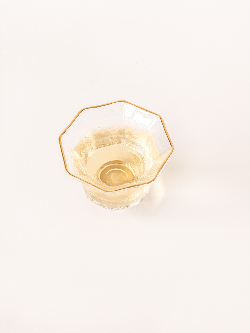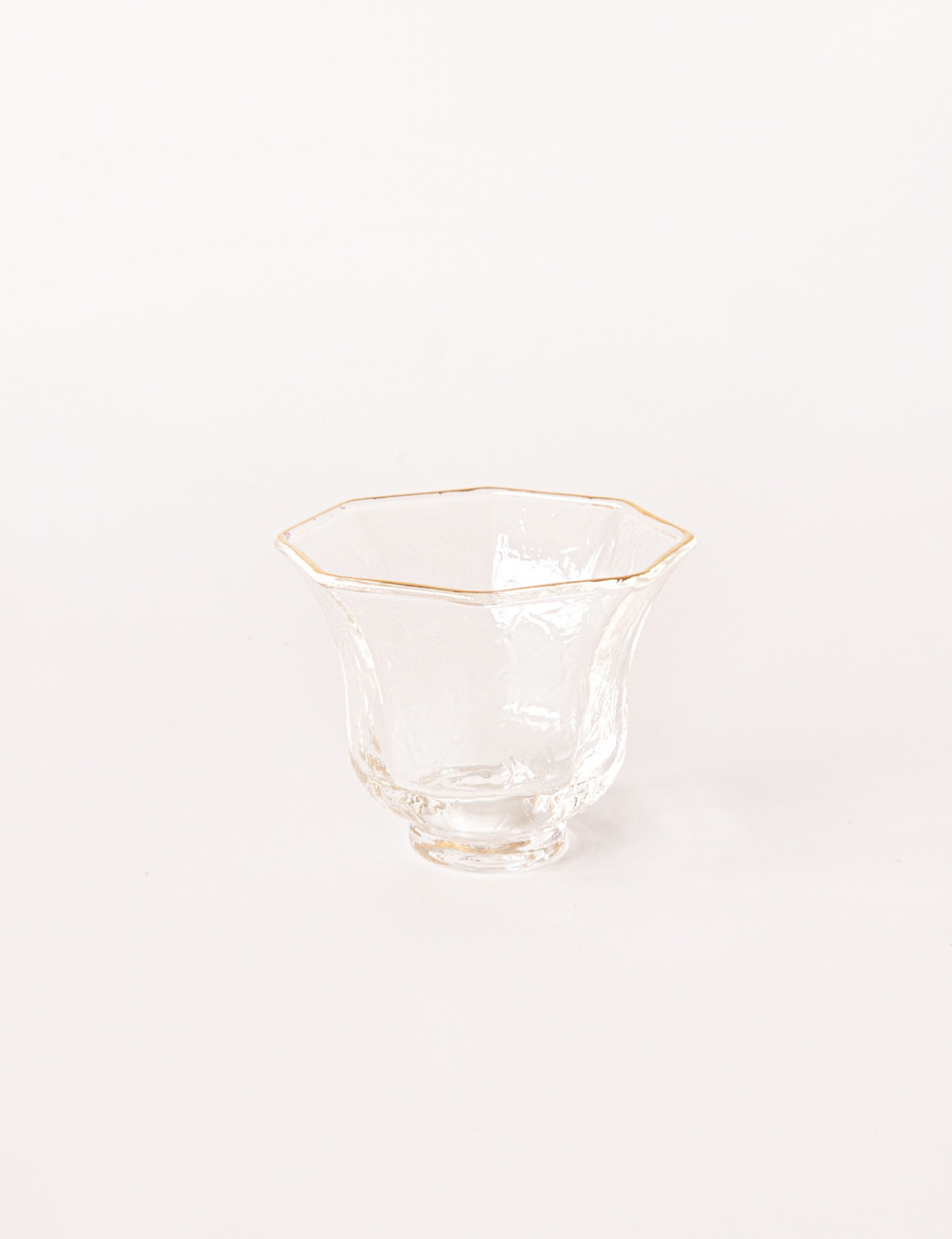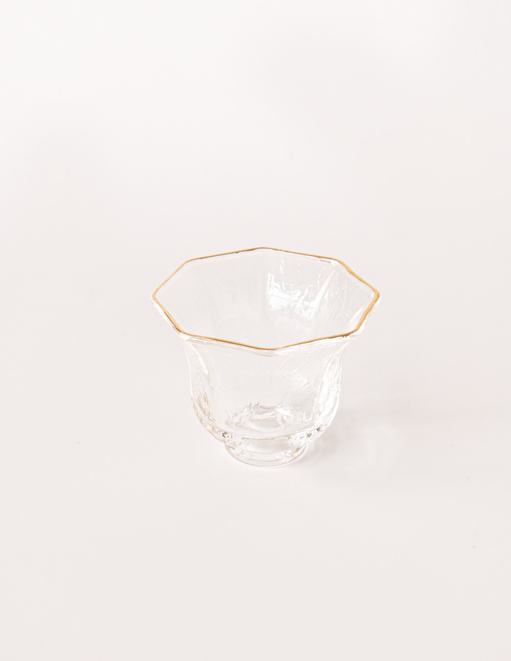 팔각모양의 작은 유리 잔입니다. 위쪽으로 우아하게 넓어지는 라인이 매력적인 제품으로 찻자리를 더욱 아름답게 만들어줍니다. 위쪽에는 골드로 테두리가 칠해져있습니다. 간혹 금테 라인이 매끄럽지 않을 수도 있으나 이는 제조 공정상 나타나는 자연스러운 현상으로 양해부탁드립니다.