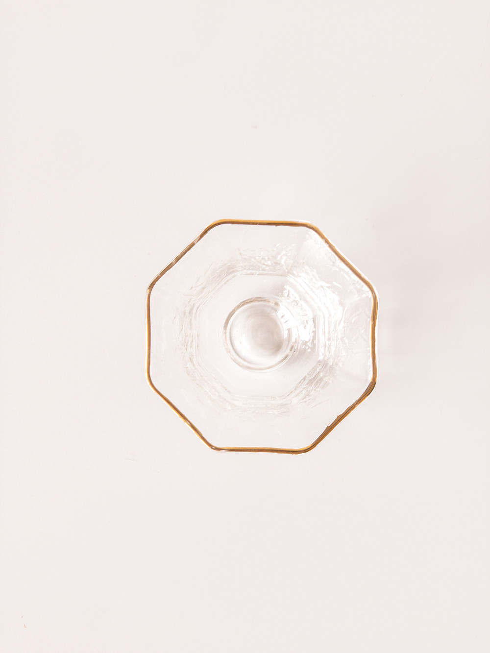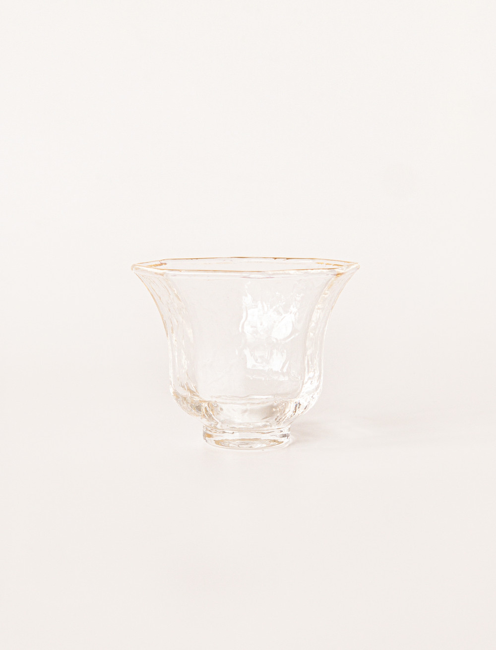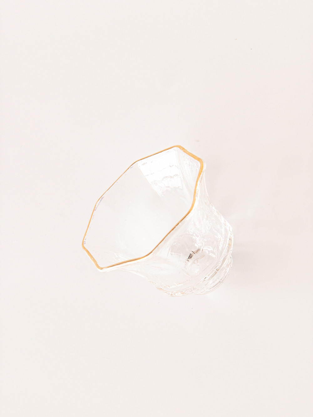 팔각모양의 작은 유리 잔입니다. 위쪽으로 우아하게 넓어지는 라인이 매력적인 제품으로 찻자리를 더욱 아름답게 만들어줍니다. 위쪽에는 골드로 테두리가 칠해져있습니다. 간혹 금테 라인이 매끄럽지 않을 수도 있으나 이는 제조 공정상 나타나는 자연스러운 현상으로 양해부탁드립니다.