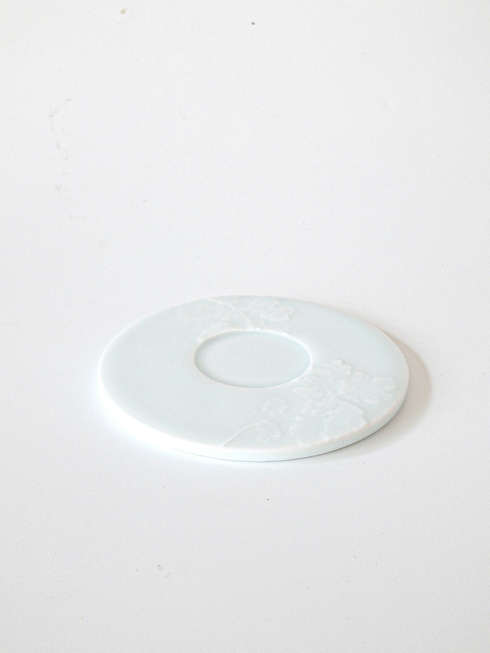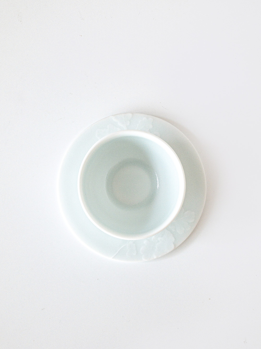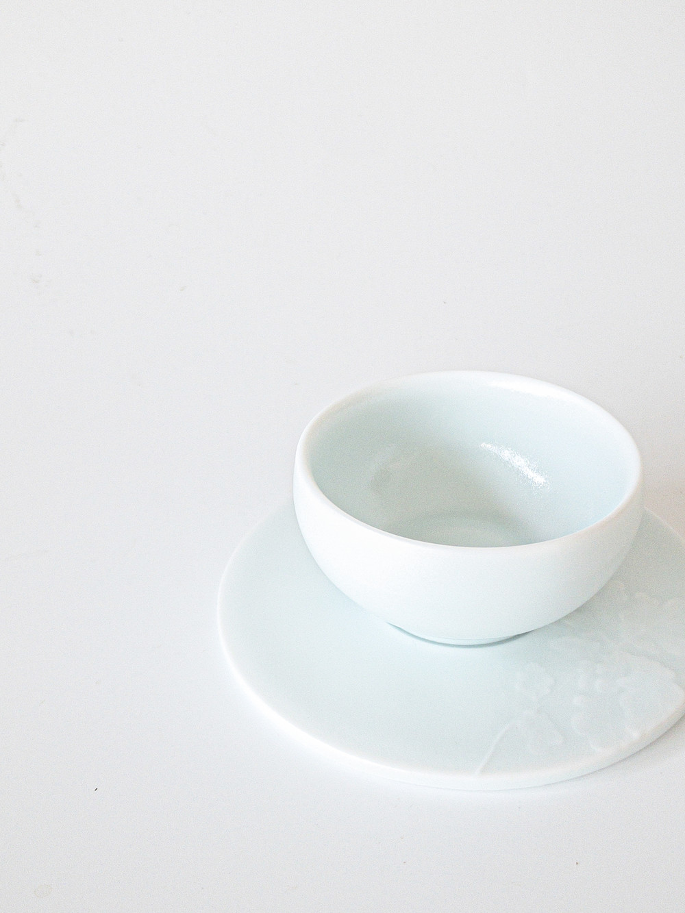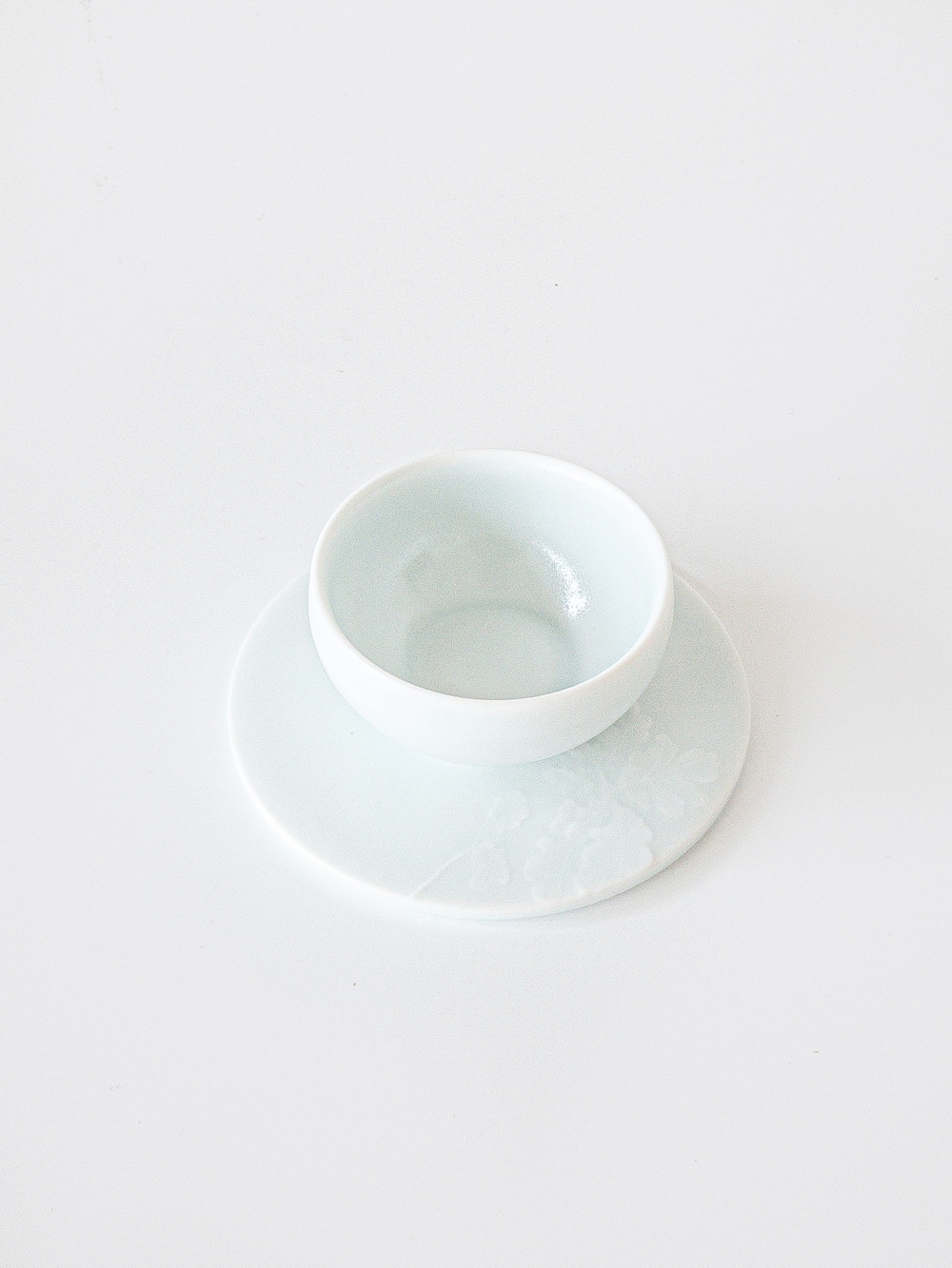 박혜성 작가의 애기똥풀의 부조가 들어간 찻잔받침과, 동그란 모양의 찻잔 세트입니다. 전체적으로 옅은 푸른 빛이 도는 백자 제품입니다. 잔받침은 납작한 원형으로 그 모양이 독특하며, 잔은 손에 쥐었을 때 사이즈감이 좋습니다. 찻잔받침에는 애기똥풀의 잎을 옅게 올렸습니다. 잔잔하게 보이는 풀과 함께 특별한 차 마시는 시간이 되시길 바랍니다.