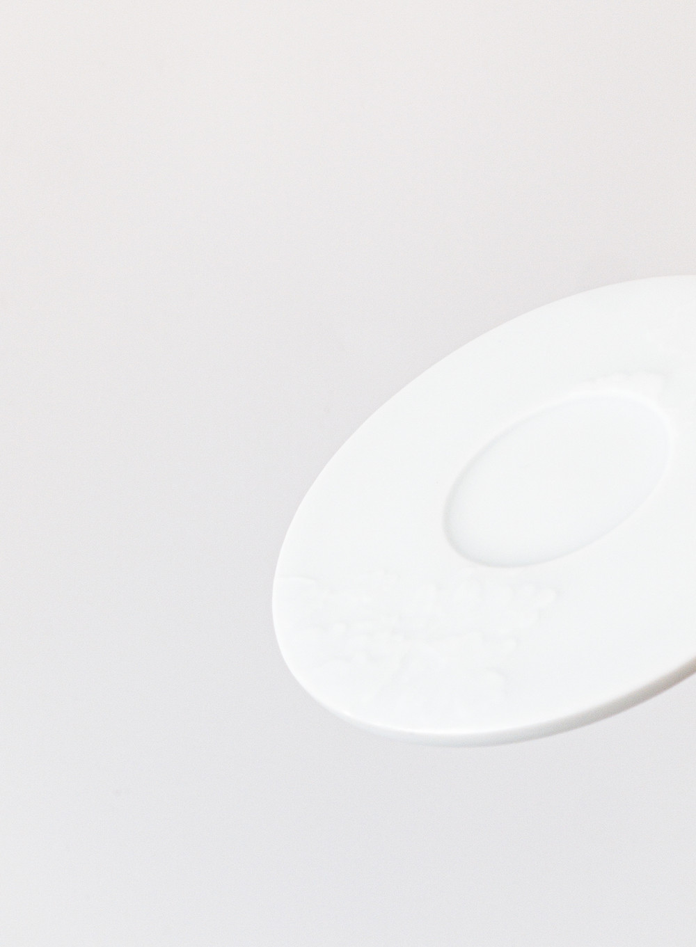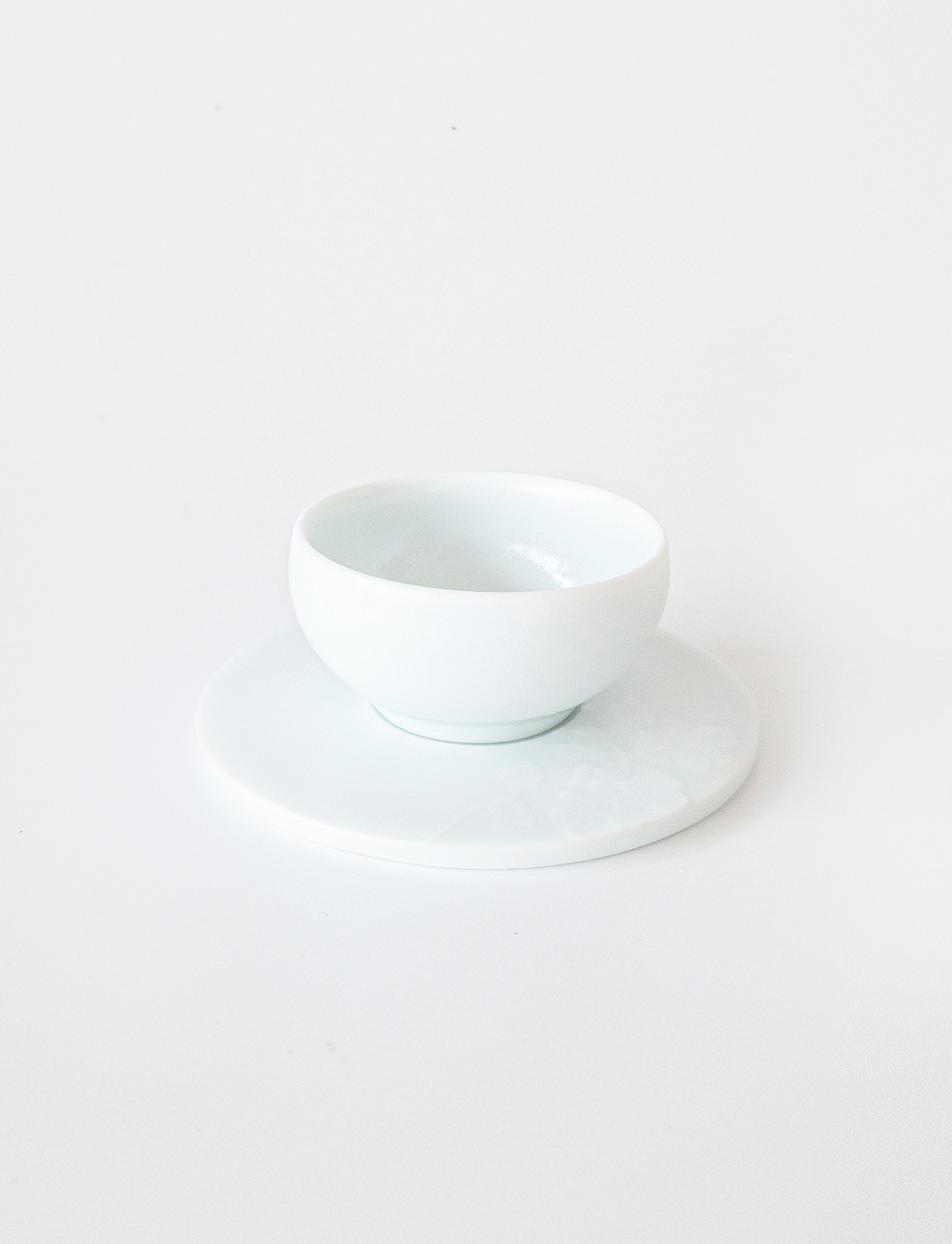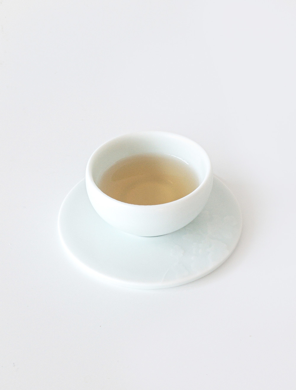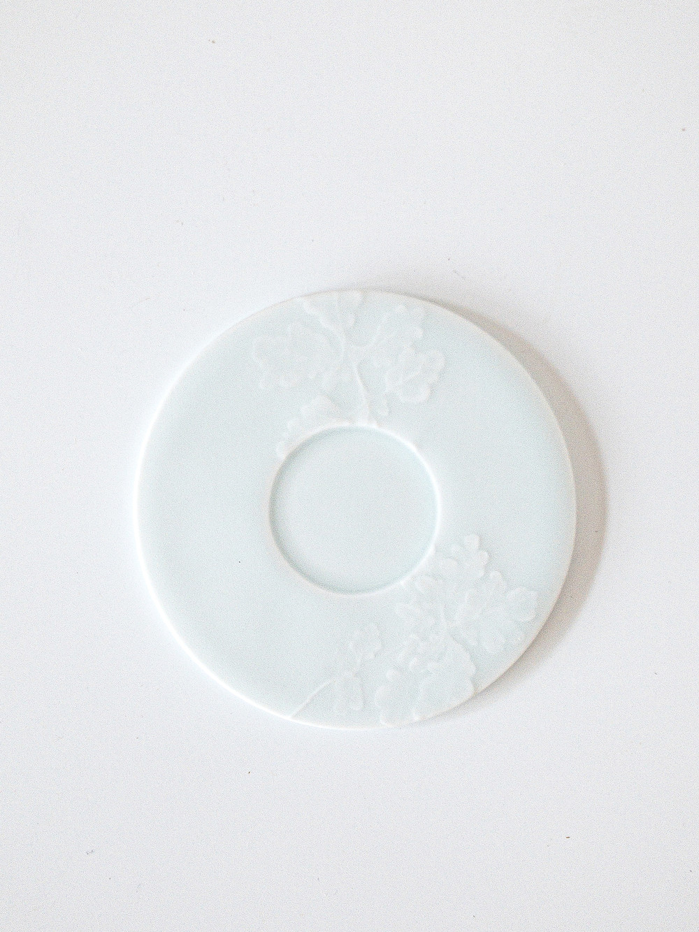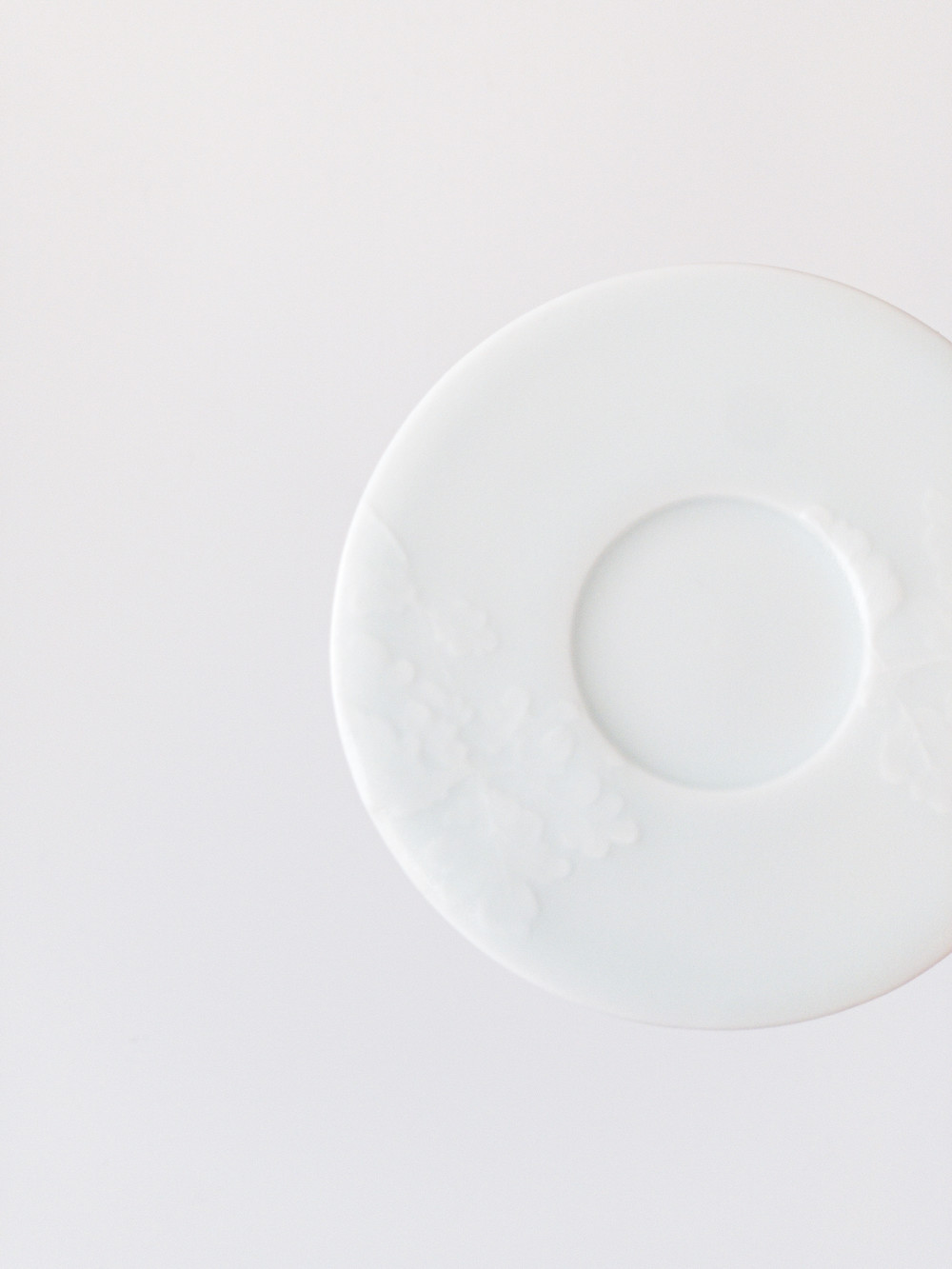 박혜성 작가의 애기똥풀의 부조가 들어간 찻잔받침과, 동그란 모양의 찻잔 세트입니다. 전체적으로 옅은 푸른 빛이 도는 백자 제품입니다. 잔받침은 납작한 원형으로 그 모양이 독특하며, 잔은 손에 쥐었을 때 사이즈감이 좋습니다. 찻잔받침에는 애기똥풀의 잎을 옅게 올렸습니다. 잔잔하게 보이는 풀과 함께 특별한 차 마시는 시간이 되시길 바랍니다.
