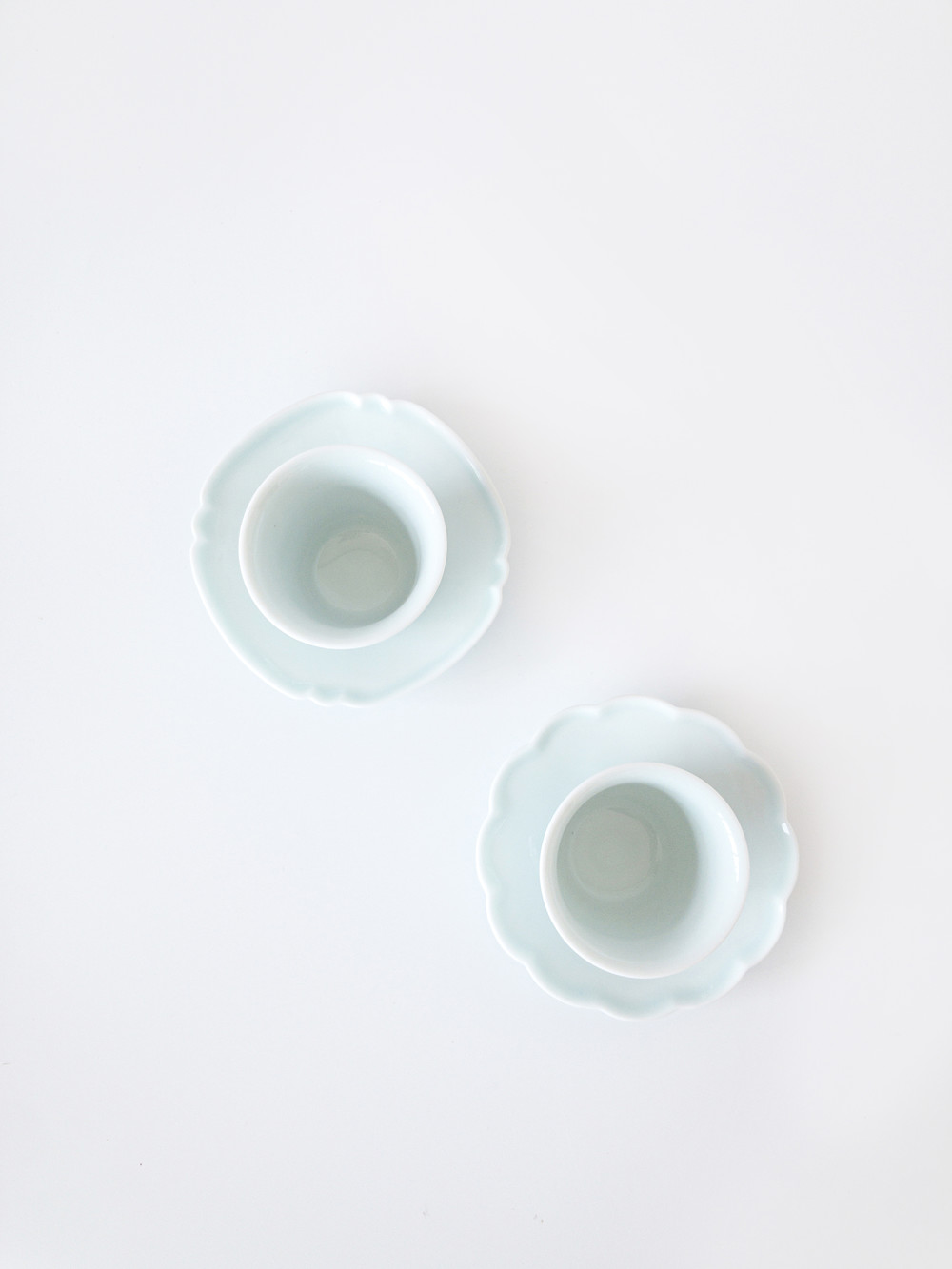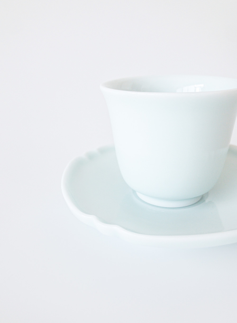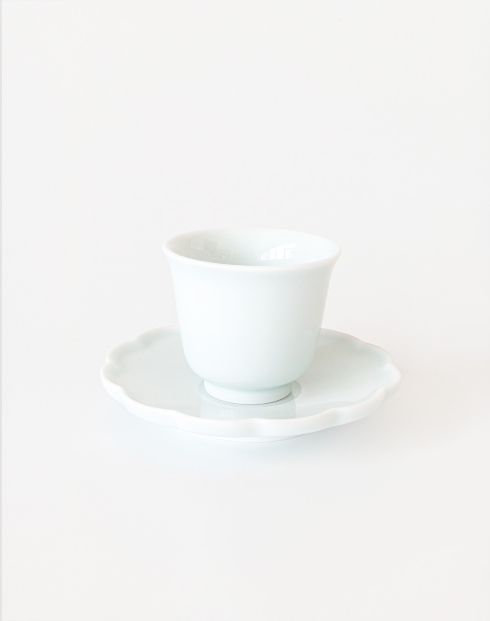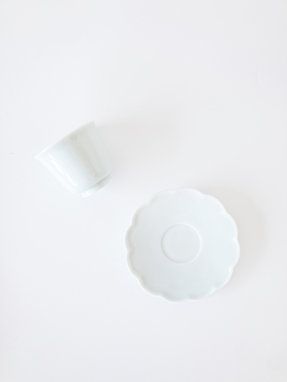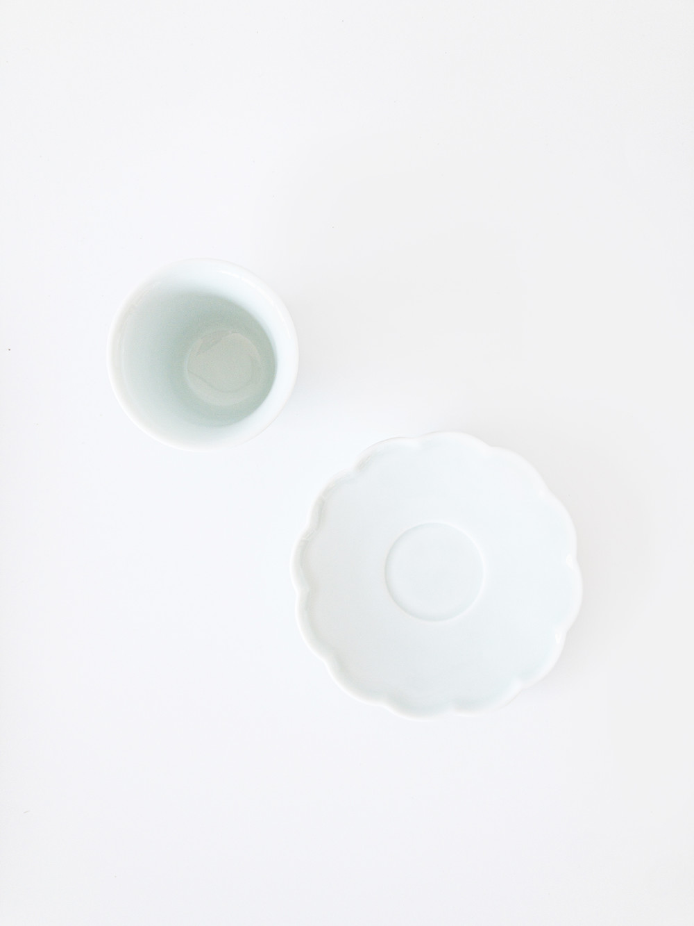 한국 전통 문양에서 모티브를 얻은 동글동글 꽃잎 모양의 잔받침과 찻잔 세트입니다.