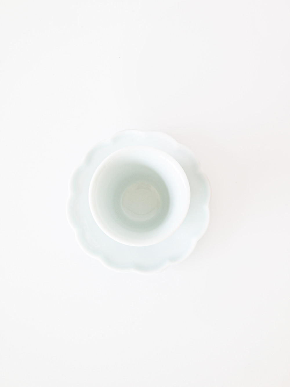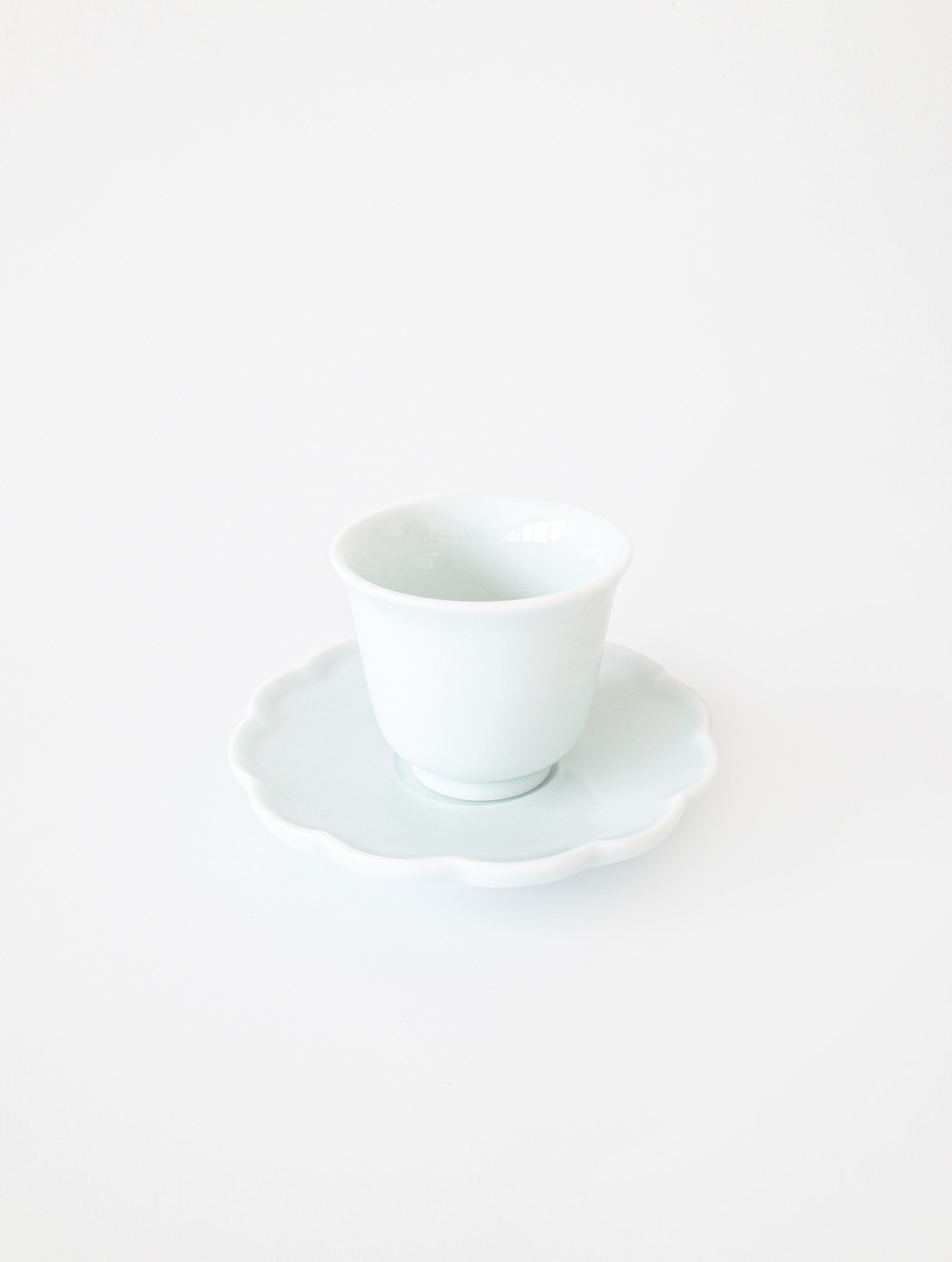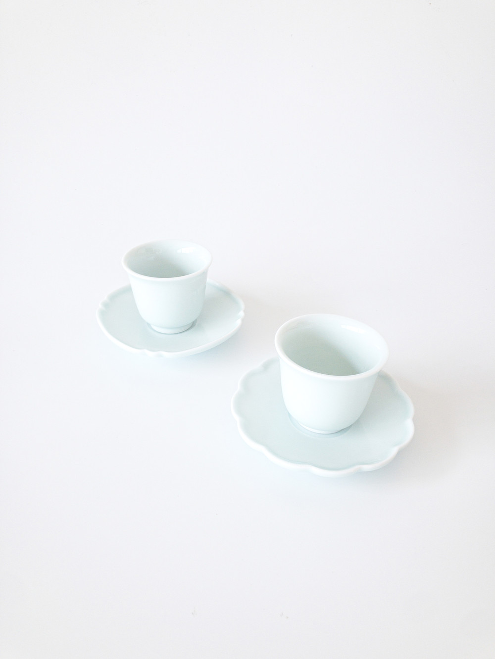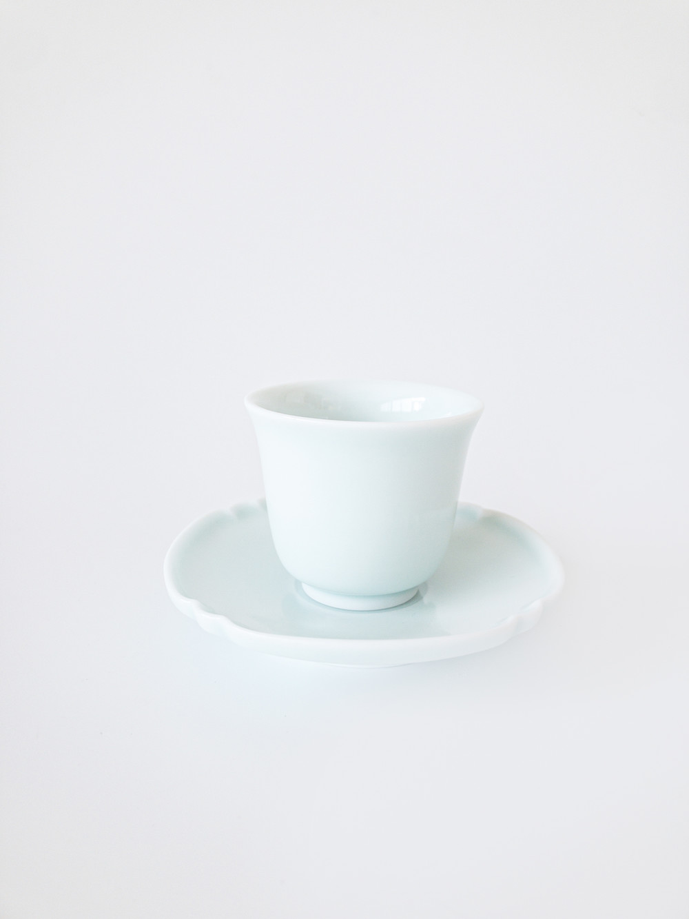 한국 전통 문양에서 모티브를 얻은 동글동글 꽃잎 모양의 잔받침과 찻잔 세트입니다.