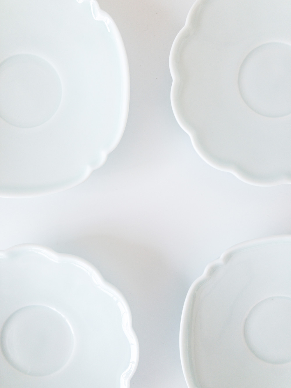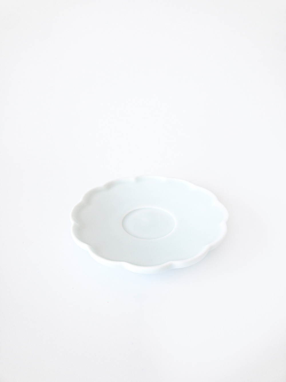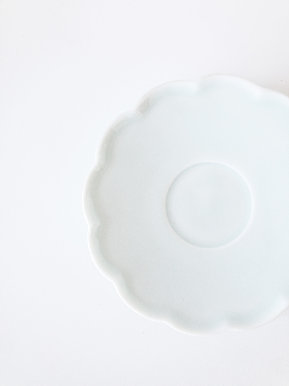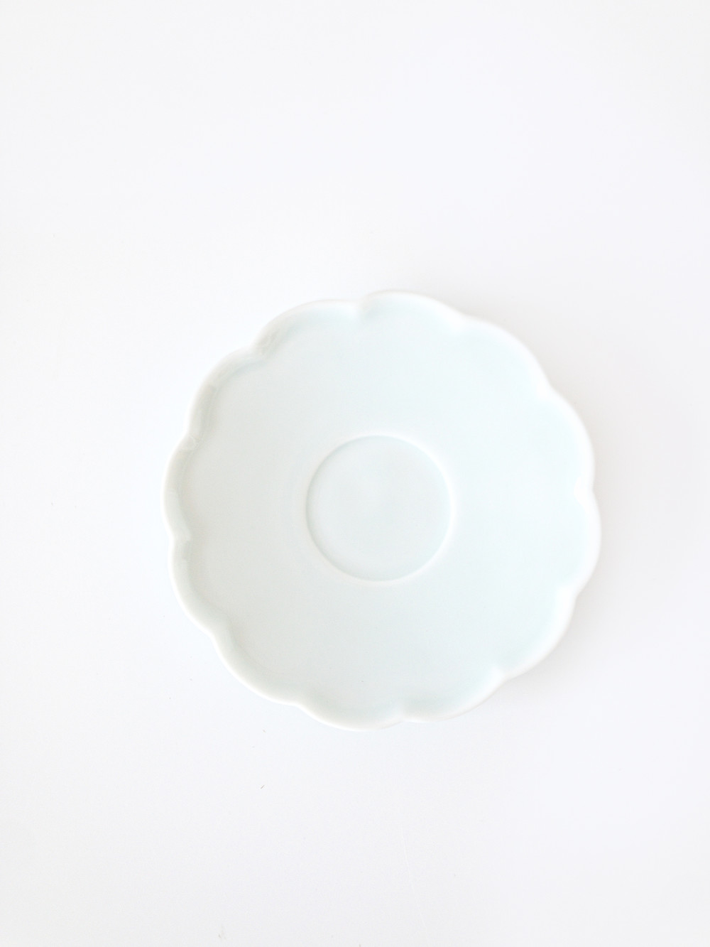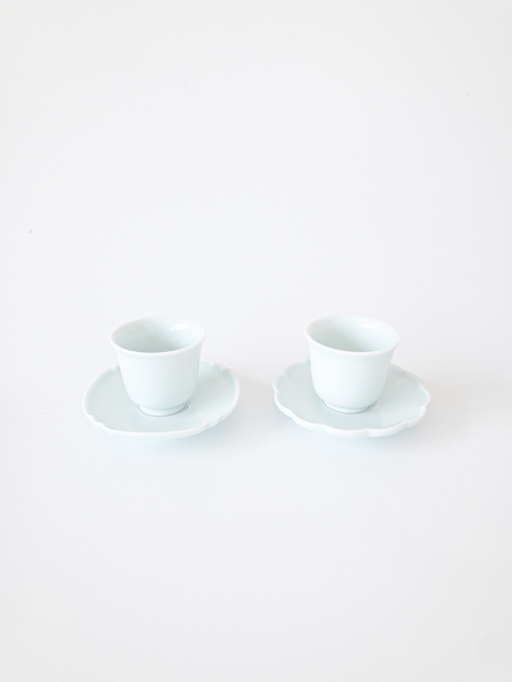한국 전통 문양에서 모티브를 얻은 동글동글 꽃잎 모양의 잔받침과 찻잔 세트입니다.