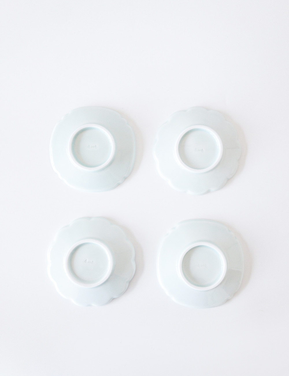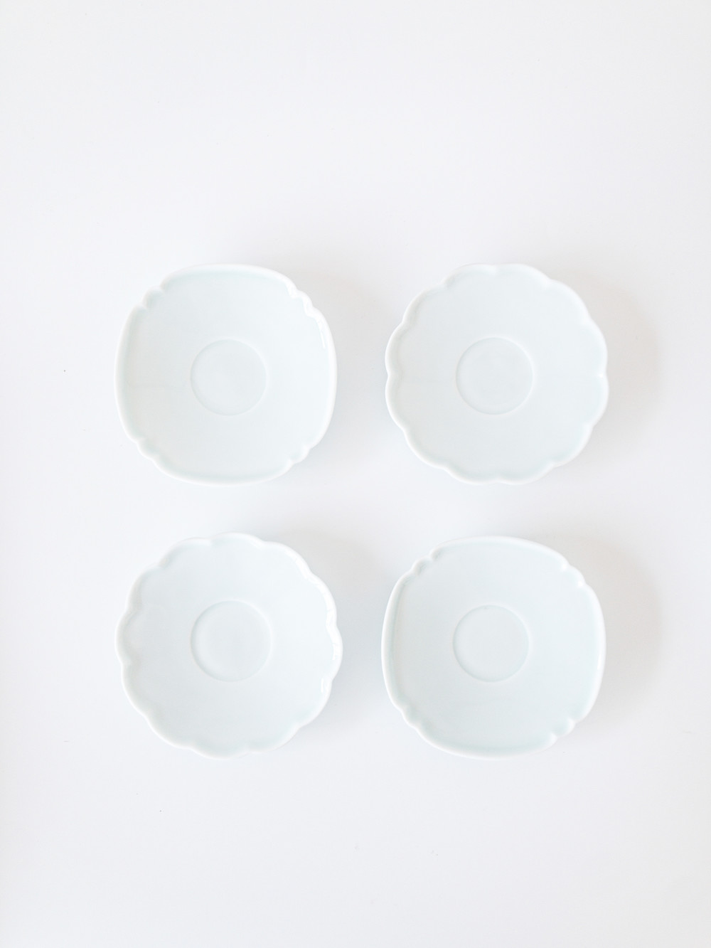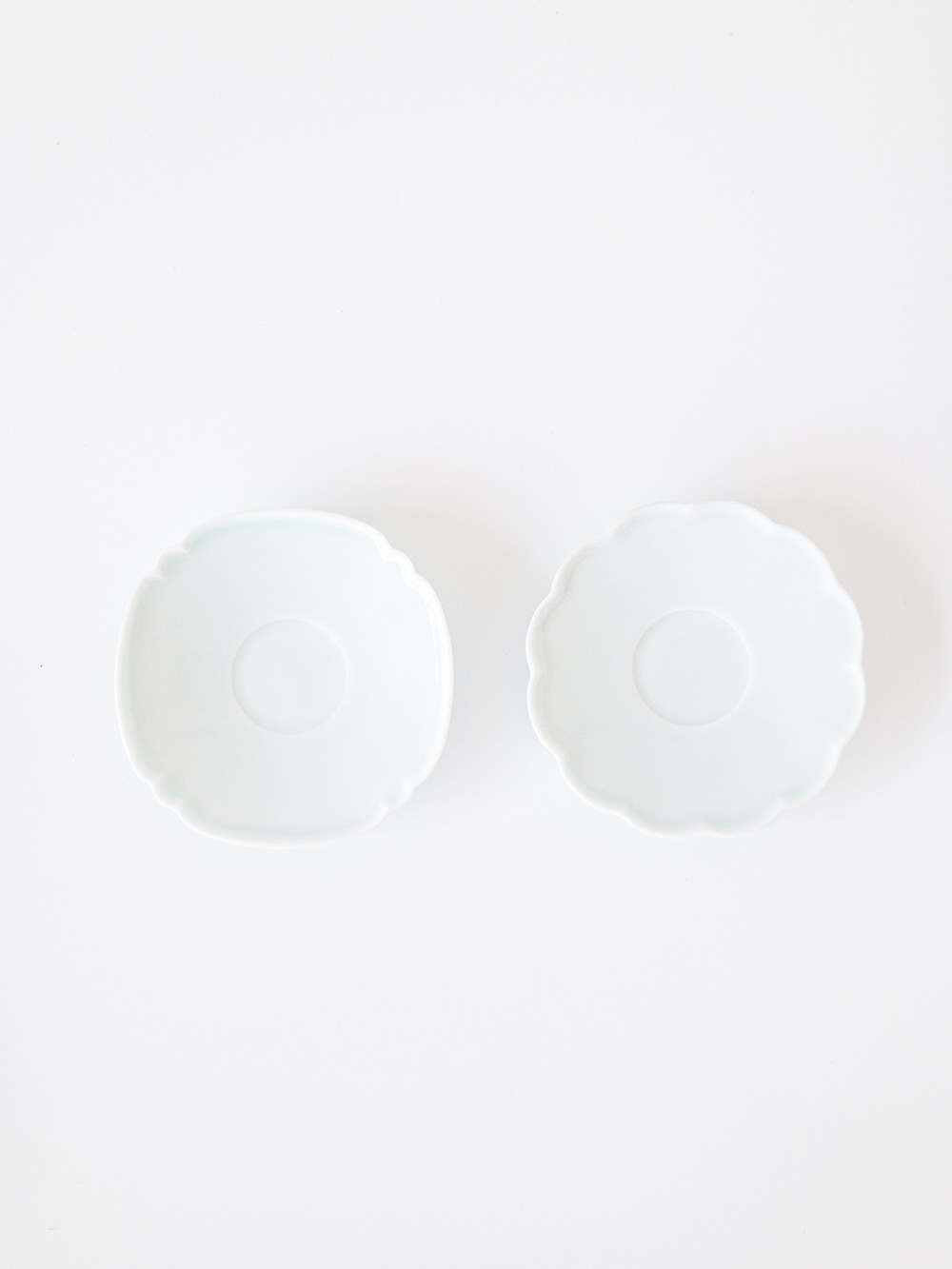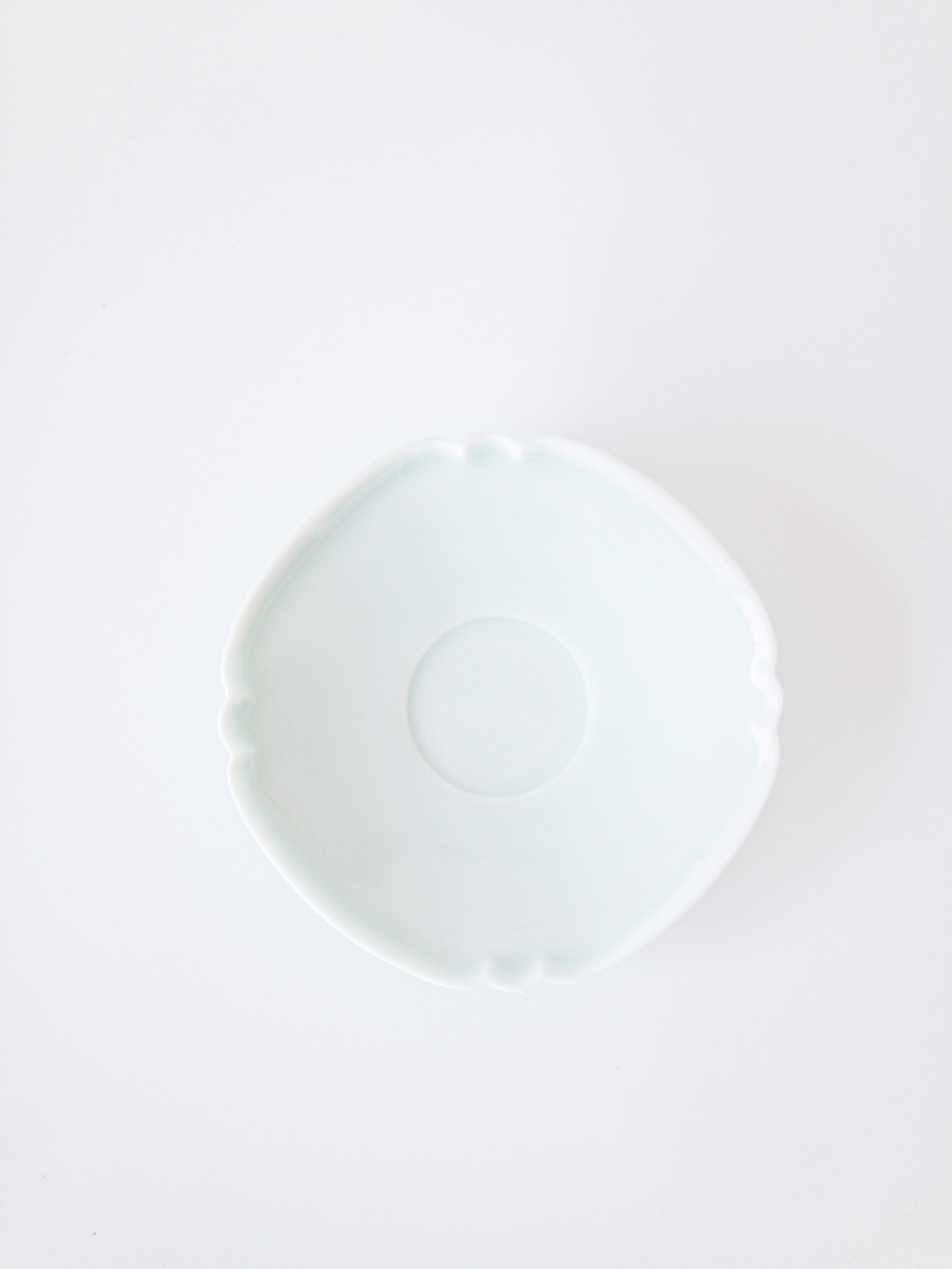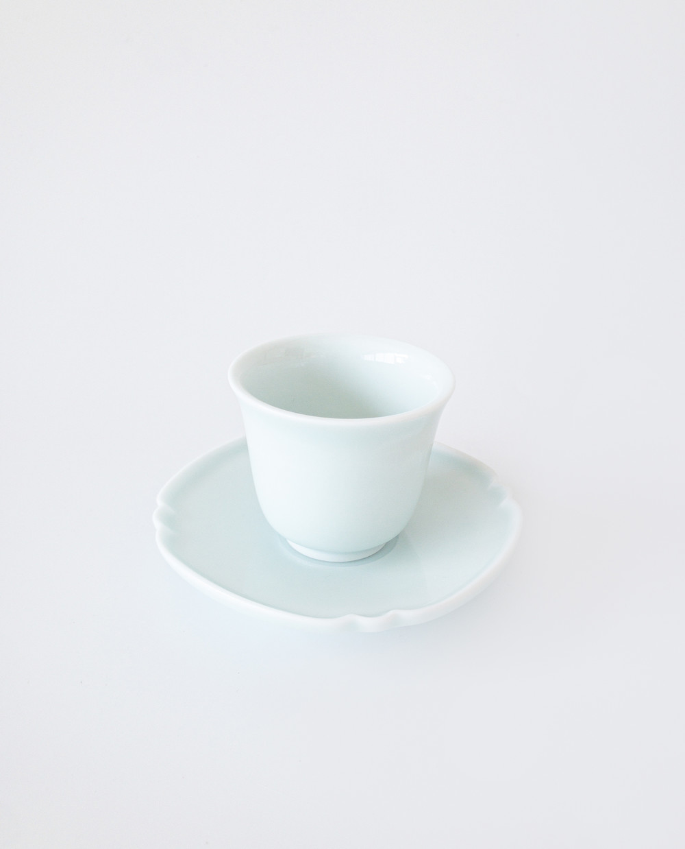 한국 전통 문양에서 모티브를 얻은 둥근 사각형의 꽃모양 찻잔 받침과 찻잔세트입니다.