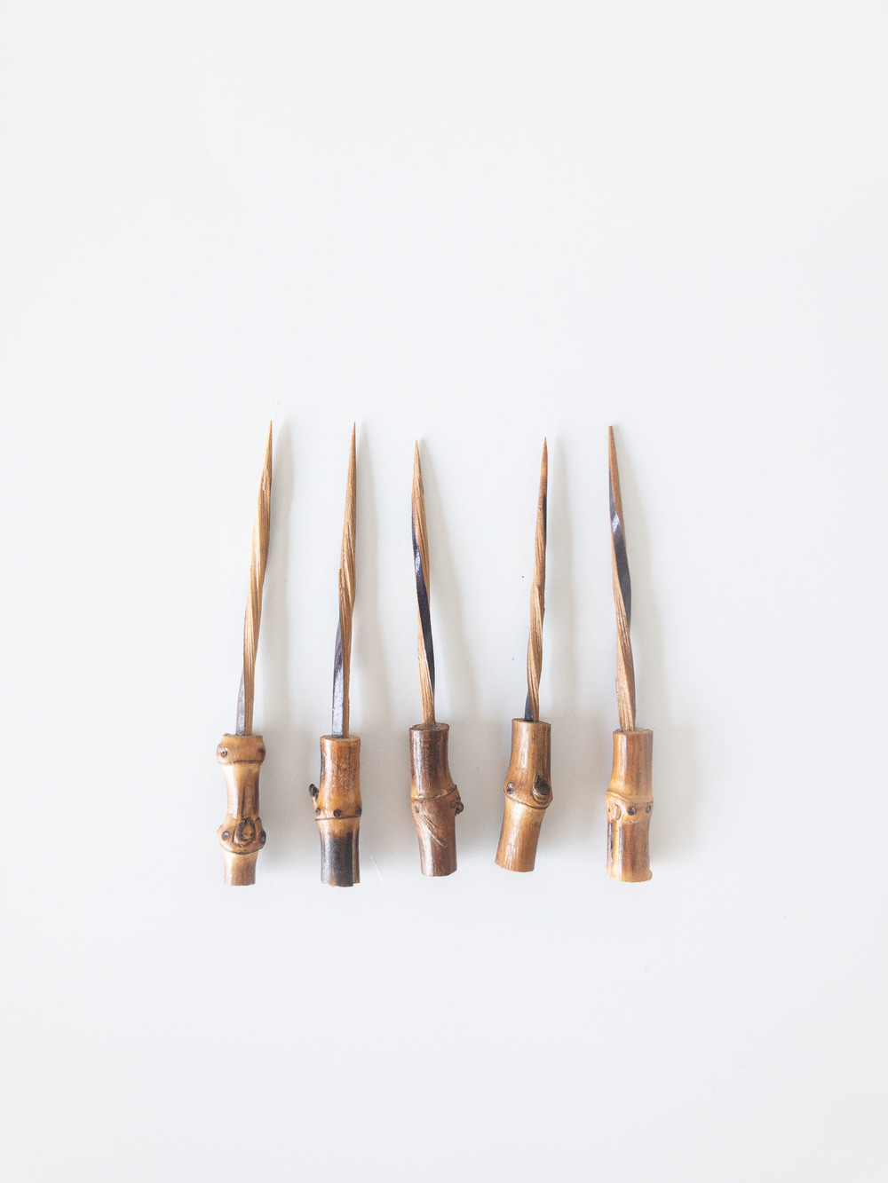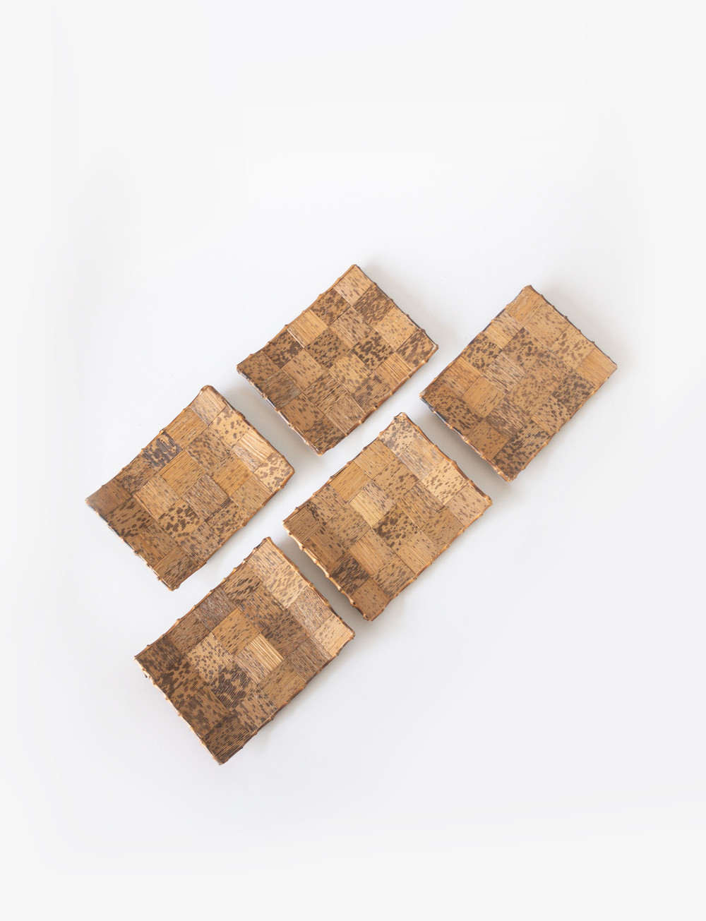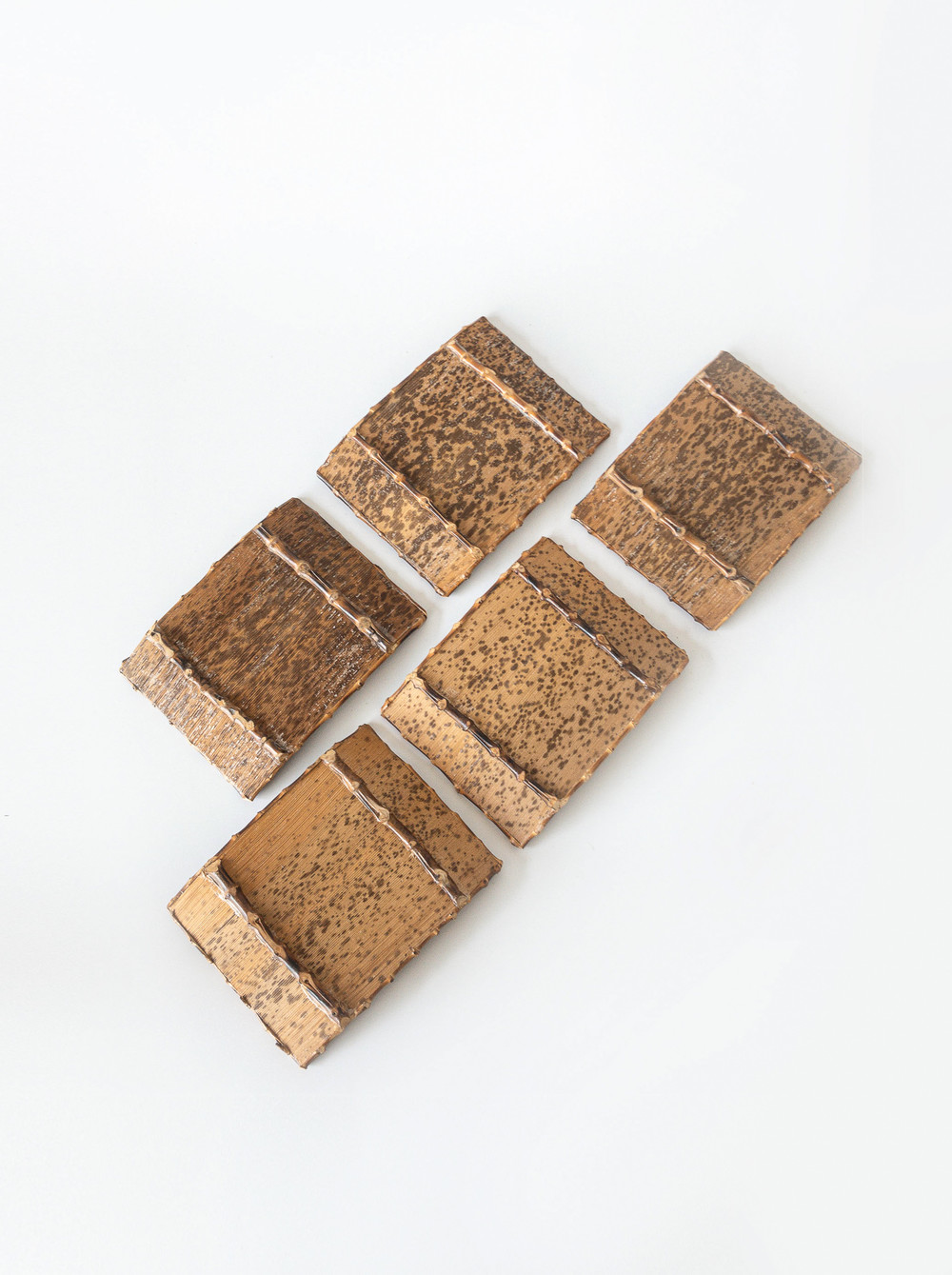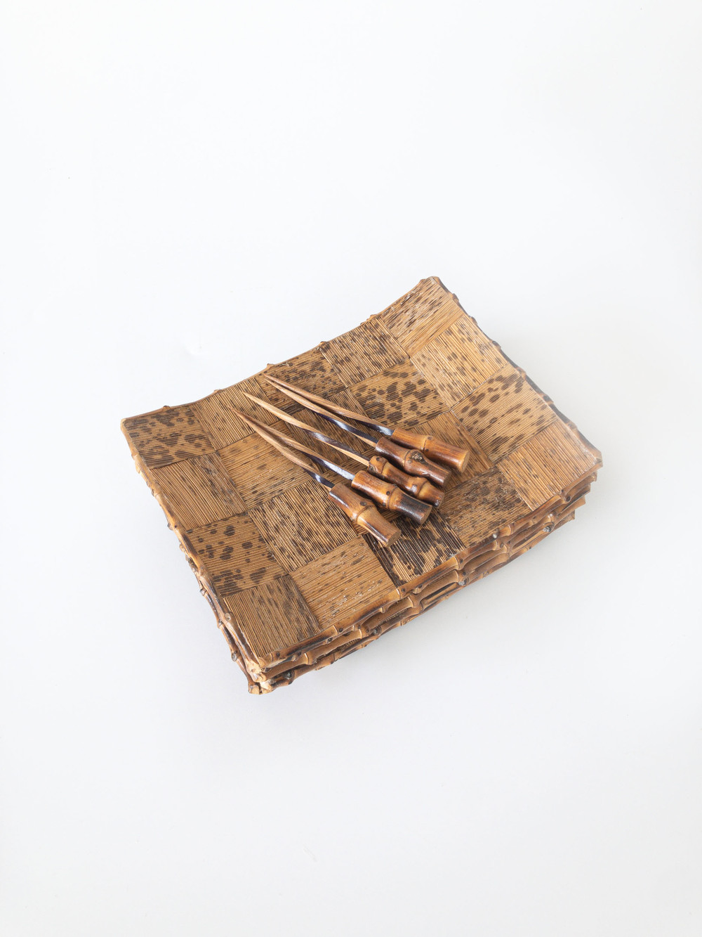 대나무로 만들어진 빈티지 다식 접시와 꽂이 세트입니다. 접시의 양 테두리에 대나무가 둘러져 있으며, 표면에는 바둑무늬로 점박이 있는 대나무의 결을 교차하여 붙였습니다. 그로 인해 만들어지는 무늬가 독특하고 재미있는 제품입니다. 찻자리를 가지실 때 간단한 다식을 올려서 사용하시면 좋은 제품으로, 찻자리에 따뜻한 분위기를 더해줄 것입니다. 5개의 제품 모두 천연 대나무를 사용하여 손으로 만들어졌기 때문에 그 모양과 무늬가 조금씩 다른 점 양해부탁드리며, 제품은 랜덤으로 발송됩니다. 접시1개와 꽂이1개가 한 세트입니다.