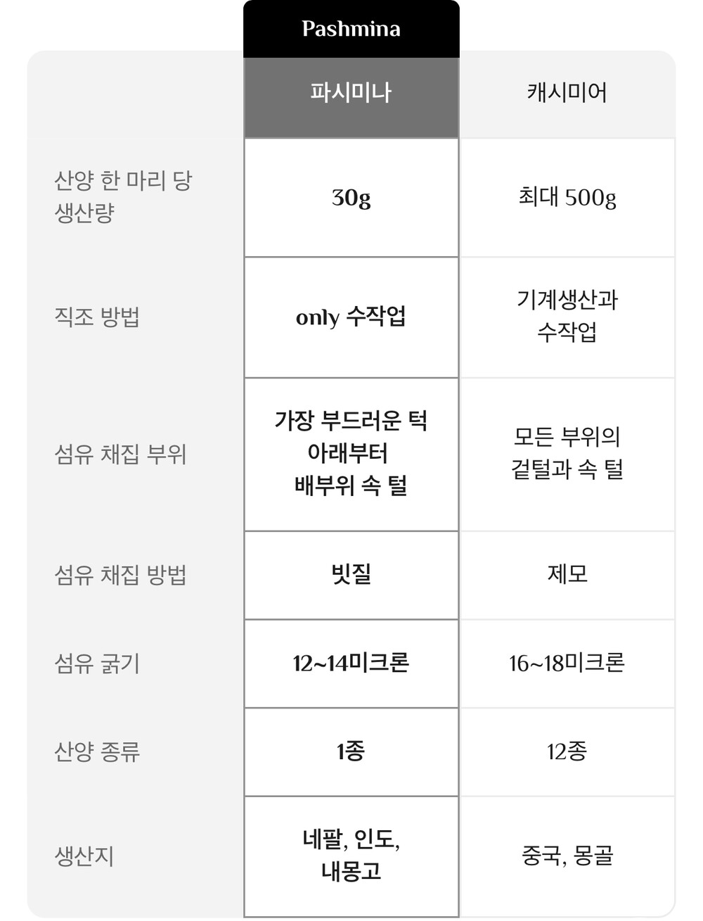 파시미나(Pashmina)는히말라야 고산지에서 서식하는 산양의 턱 밑에서 가슴을 지나 복부까지의 가장 부드러운 직물을 선별하여 제작한 최상급의 캐시미어 섬유를 파시미나라고 합니다. 히말라야 해발 15000피트, 영하 30도 이하의 추위의 환경을 견디기 위해 히말라야 산양은 듀베(DUVET)라는 이중구조 털을 만들어내는 진화를 거치게 됩니다. 파시미나는 빗질하여 얻은 이 듀베(DUVET)를 모아 직조하여 사용합니다.이 듀베(DUVET)는 매우 가늘고 섬세해서 기계를 사용한 직조는 불가능하여 모든 과정은 사람의 손을 통하여만 제작이 가능합니다.
