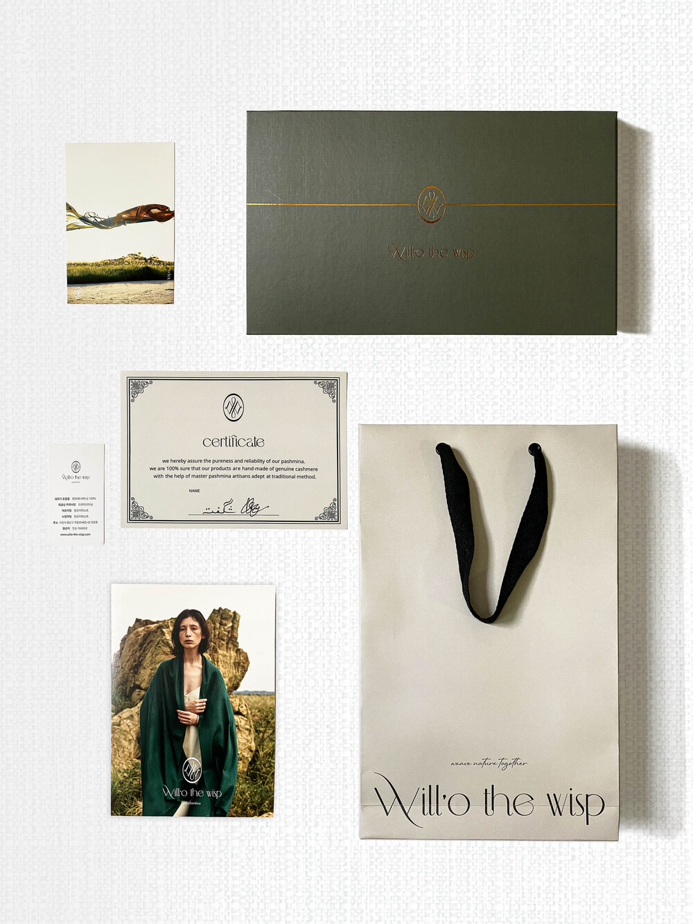 히말라야 해발 15000피트, 영하50도의 고산지의 추위를 견디는 카쉬미르 산양의 털 중 가장 부드러운 부분만을 모아 직조한 최상급 캐시미어인 파시미나 머플러 브랜드로, 직접 카쉬미르 지역 스리나가르에서 파시미나를 정식 수입하여 Will'o the wisp만의 무드로 재해석한 브랜드입니다. 윤리적이며 지속 가능한 파시미나의 생산과 공급을 지향하며, 윤리적인 수작업을 통하여 제작됩니다. 장인들의 오랜 감정의 예술적 표현을 선보임으로써 그들의 삶을 향상시키는 매개체이자 전통 예술 보존에 도움이 되는 브랜드로 성장하기를 희망합니다.