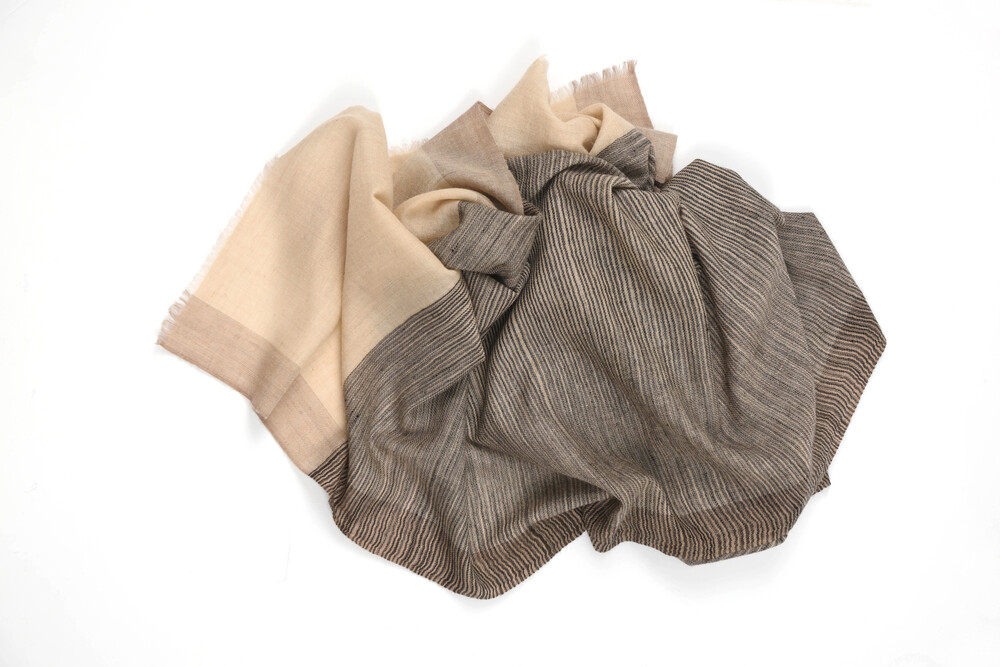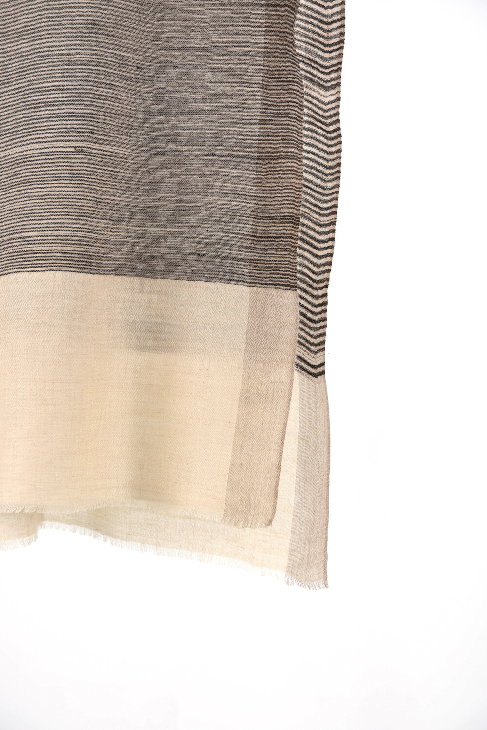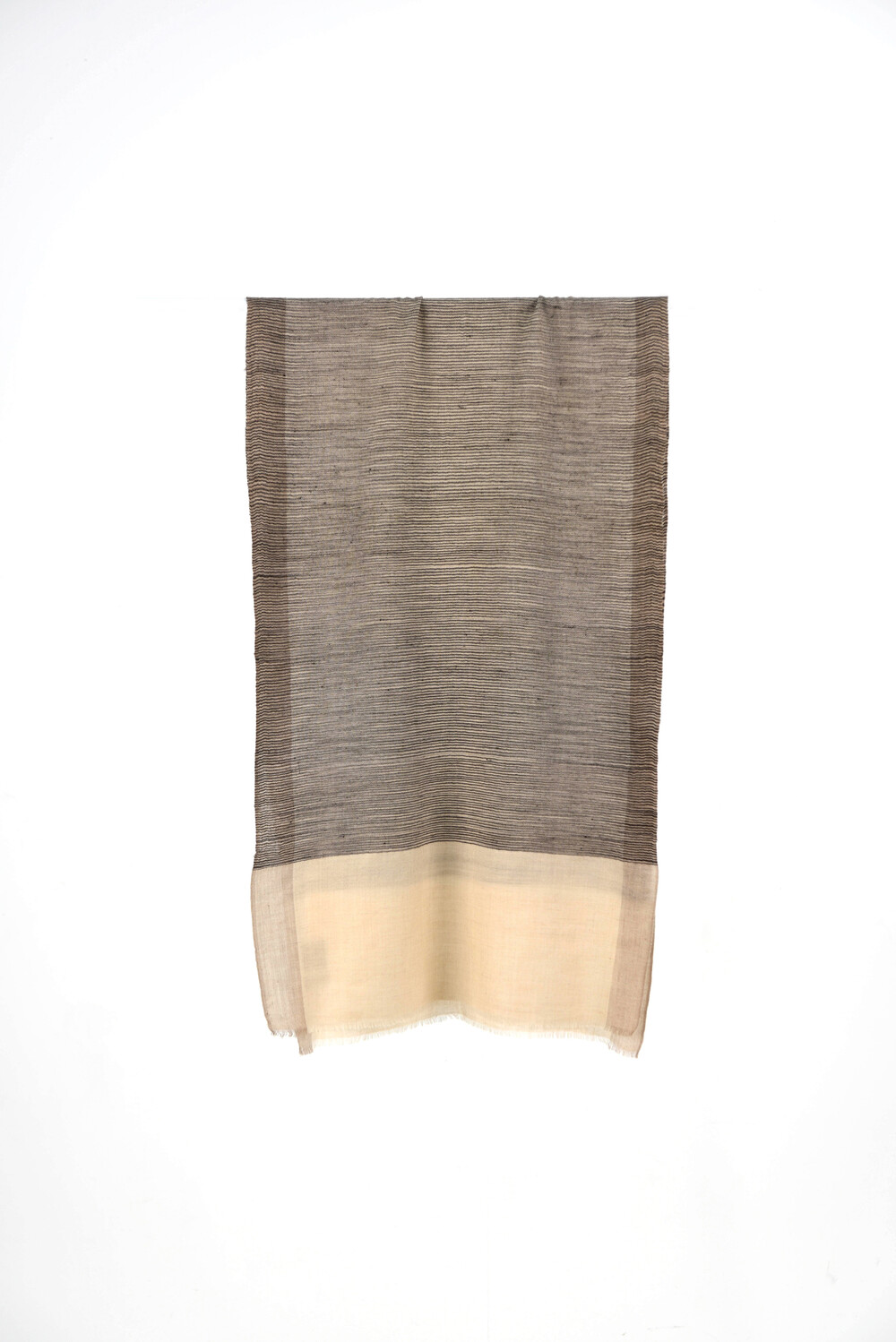 Stripe White는 짙은 브라운계열의 얇은 스트라이프 패턴과 Ecru 파시미나의 조합입니다.