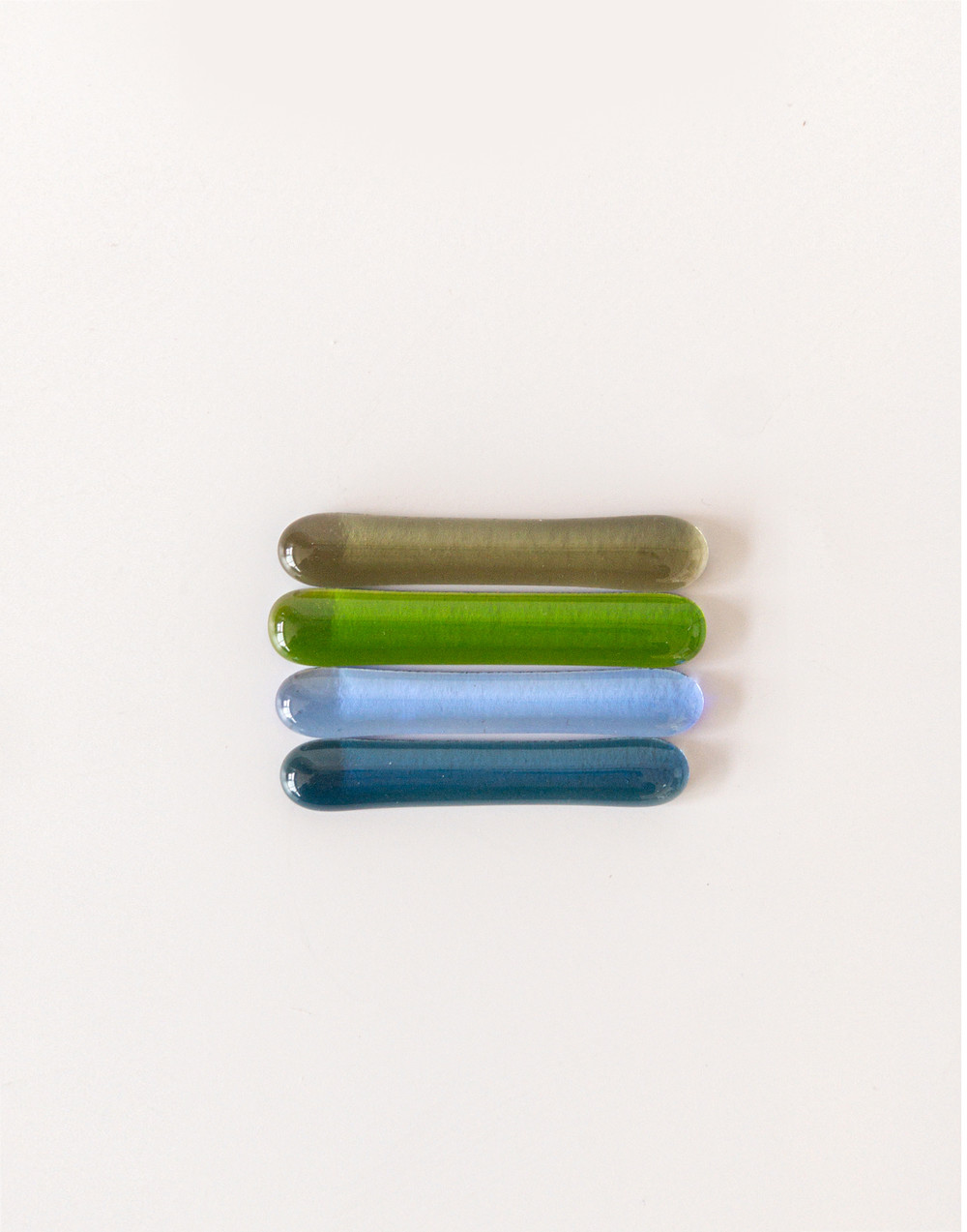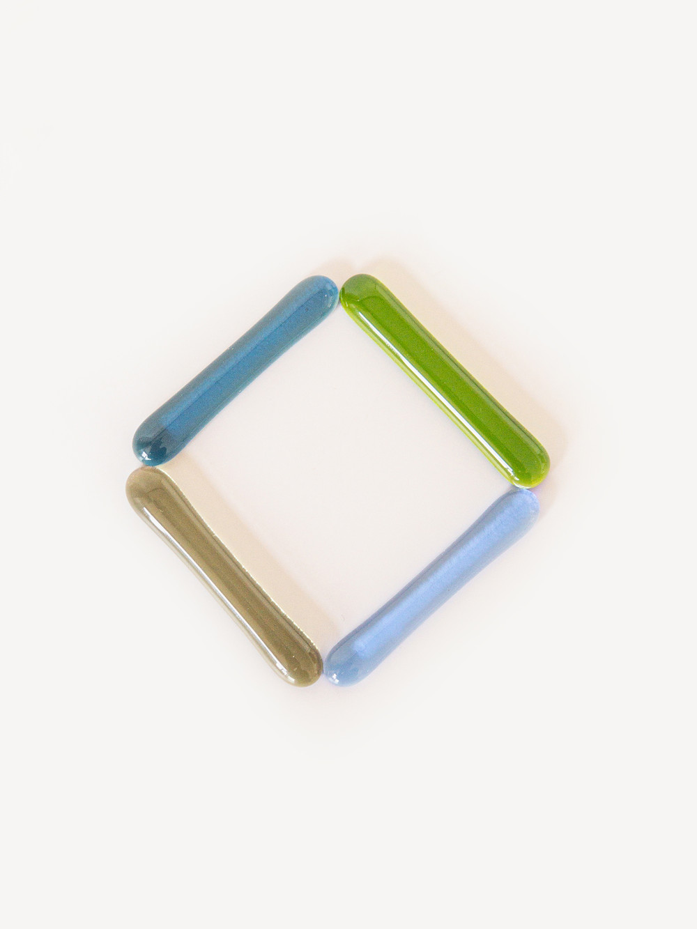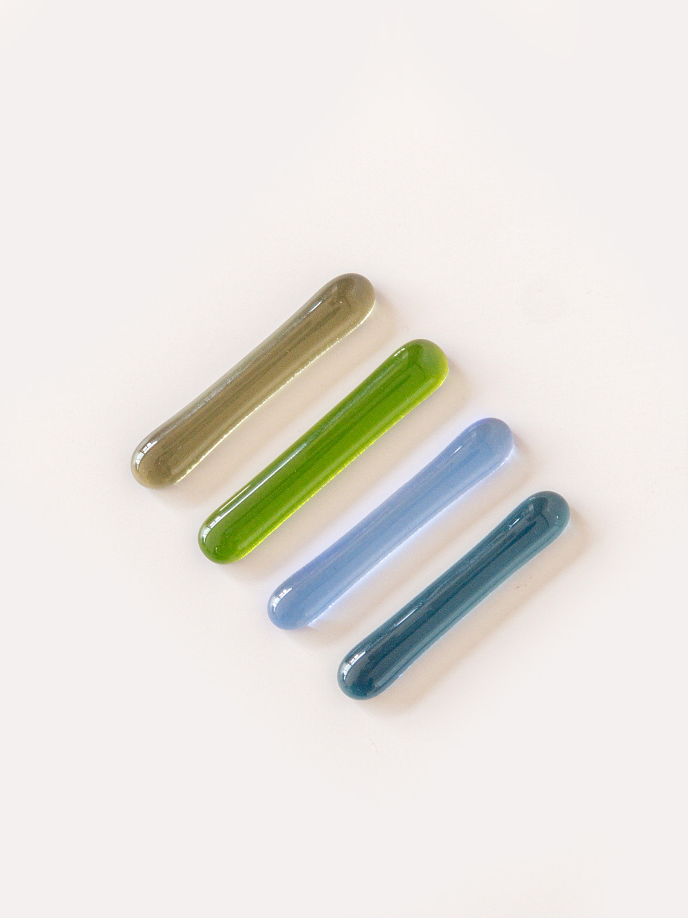 유리편집의 작은 수저 받침 세트(B)입니다. 투명한 유리 위에 색 유리를 한겹 더 올려 만들어져 더욱 맑고 투명합니다. B세트는 그린과 블루 위주의 컬러 네가지로 조합되어 함께 사용하면 테이블 위를 더욱 생기있고 화사하게 만들어 줍니다. 수저 받침 외에도 차도구를 올려 놓거나 필기구 등을 올려 다양하게 활용해 보세요.