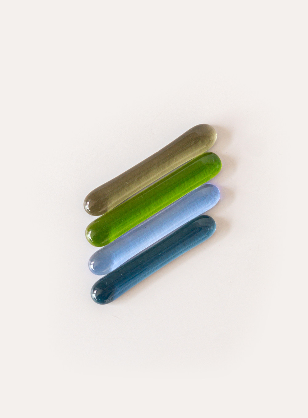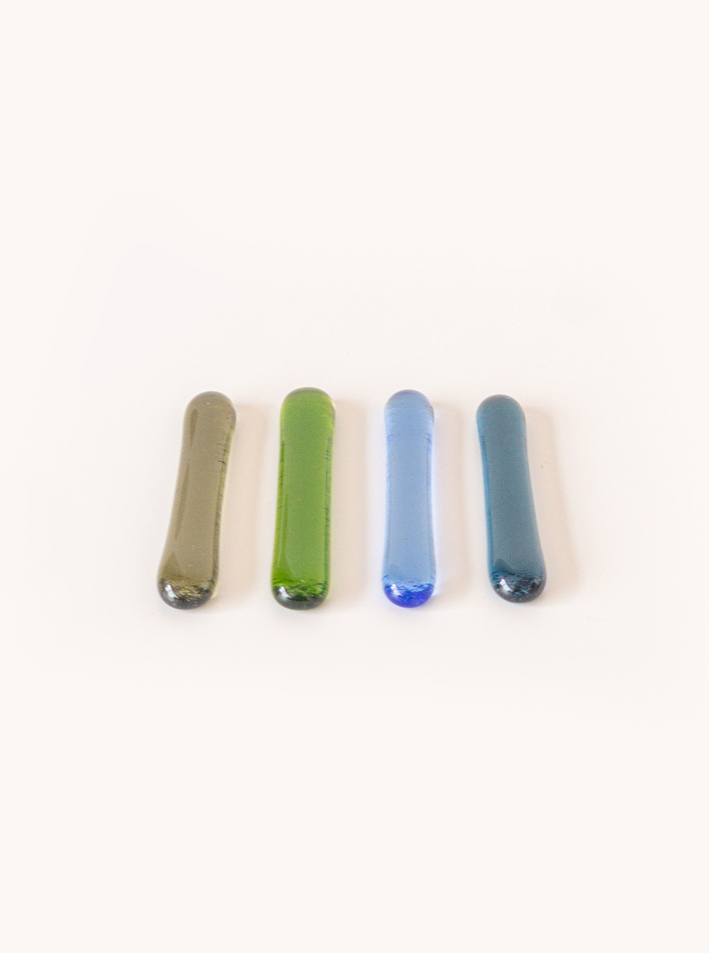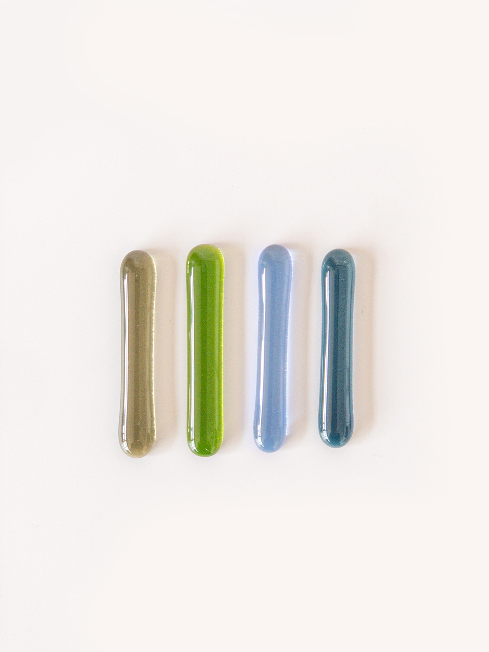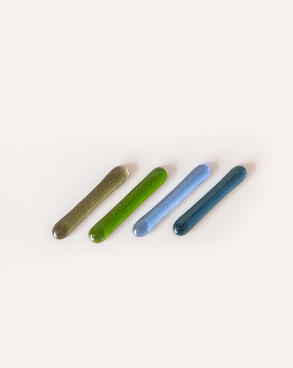 유리편집의 작은 수저 받침 세트(B)입니다. 투명한 유리 위에 색 유리를 한겹 더 올려 만들어져 더욱 맑고 투명합니다. B세트는 그린과 블루 위주의 컬러 네가지로 조합되어 함께 사용하면 테이블 위를 더욱 생기있고 화사하게 만들어 줍니다. 수저 받침 외에도 차도구를 올려 놓거나 필기구 등을 올려 다양하게 활용해 보세요.