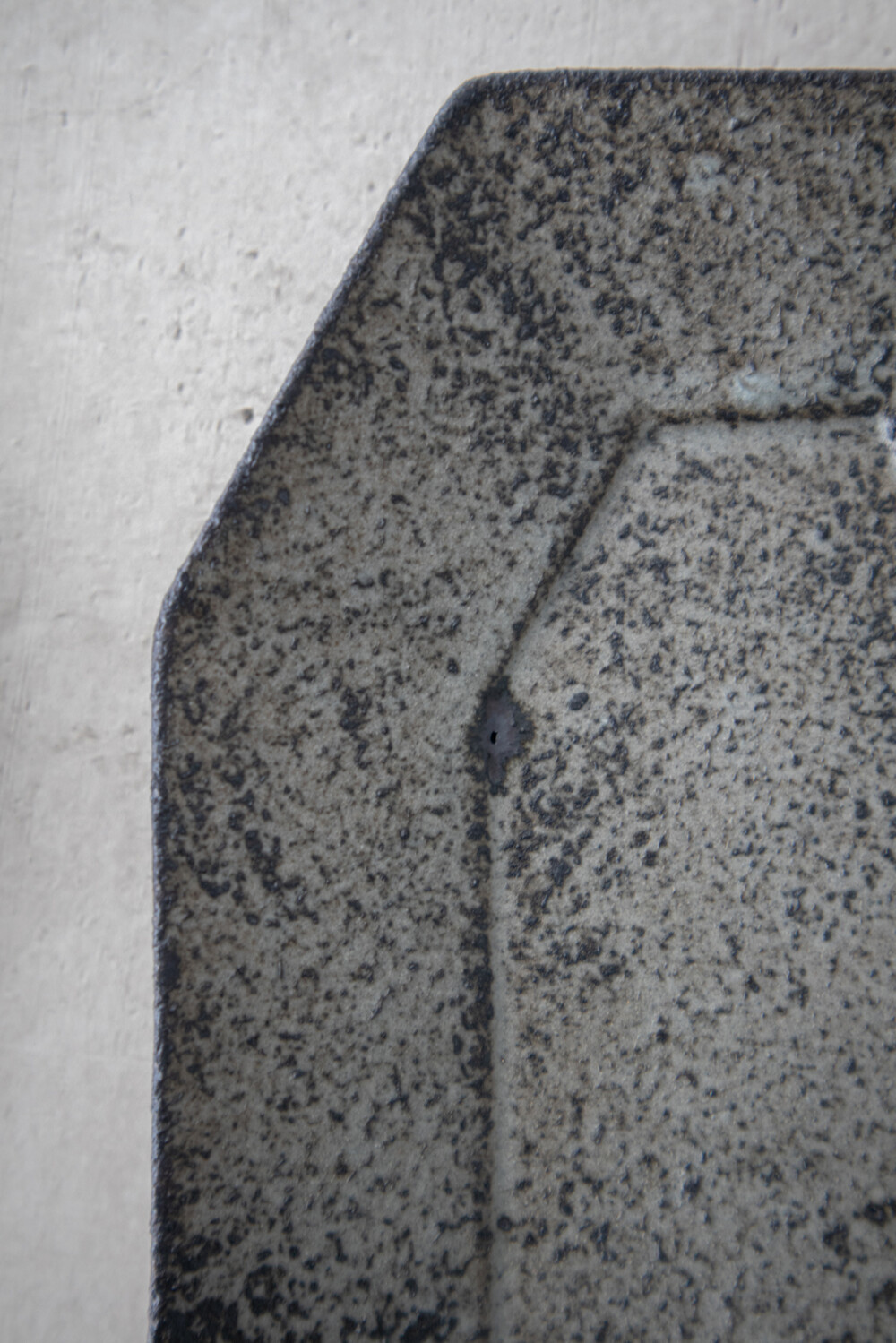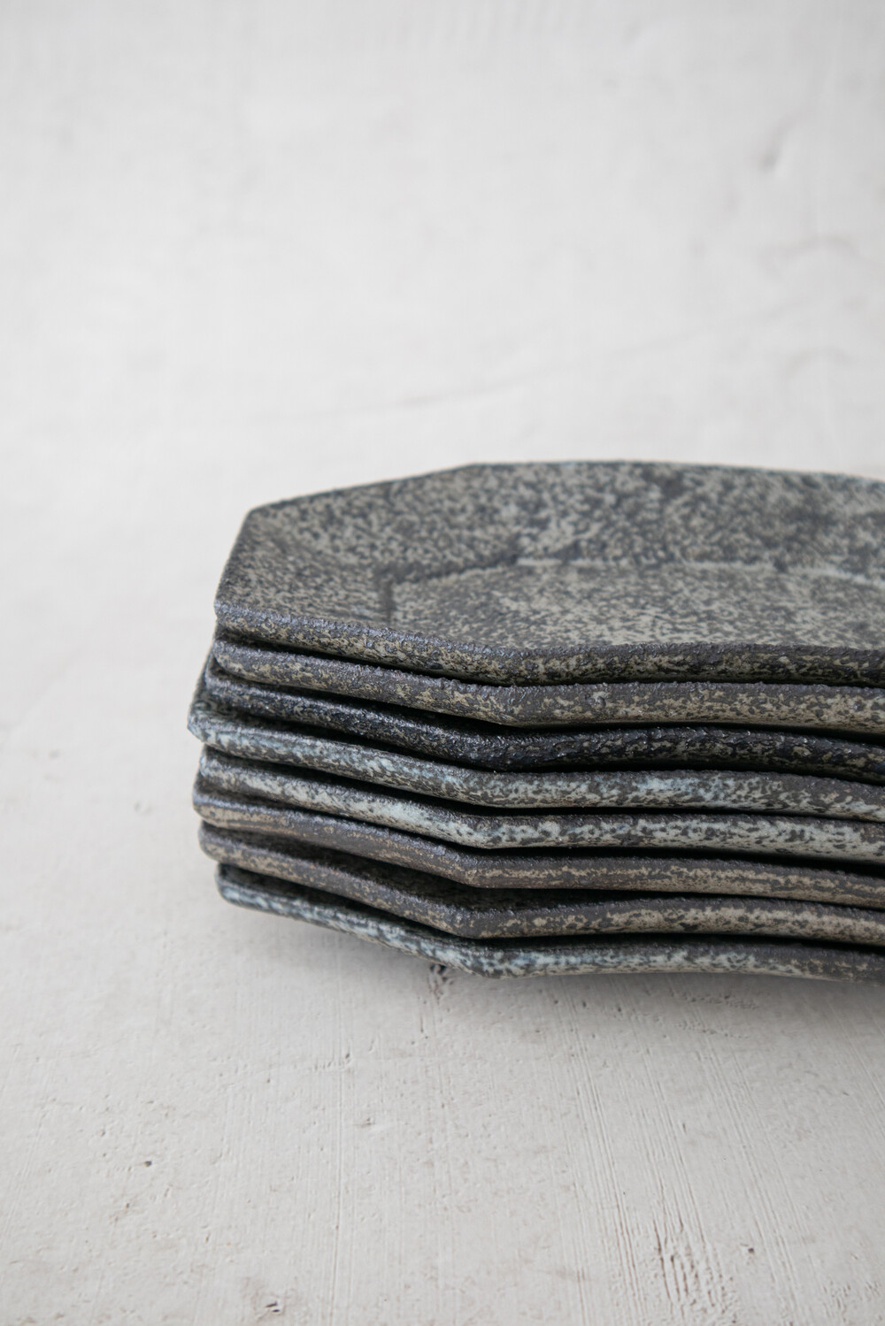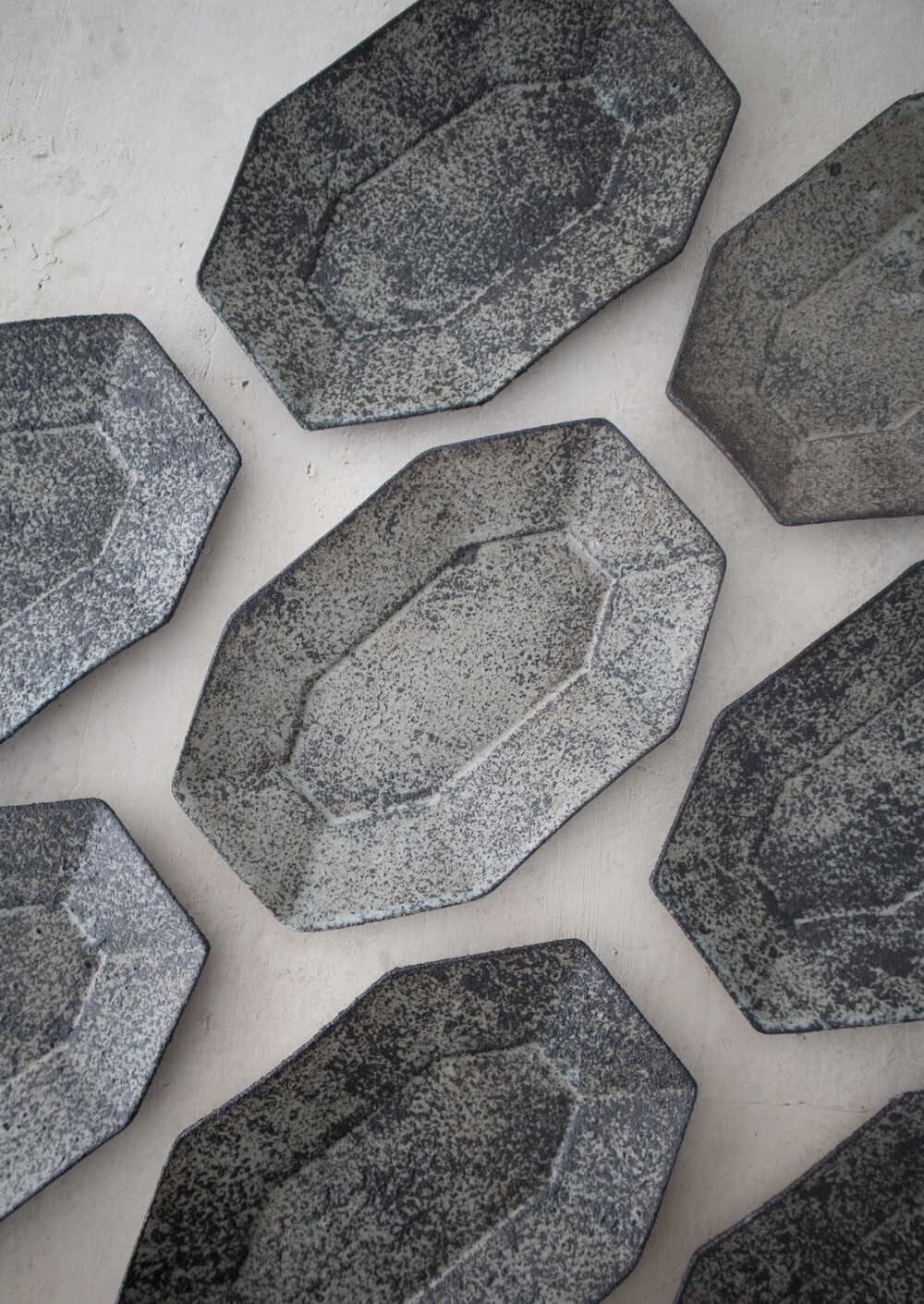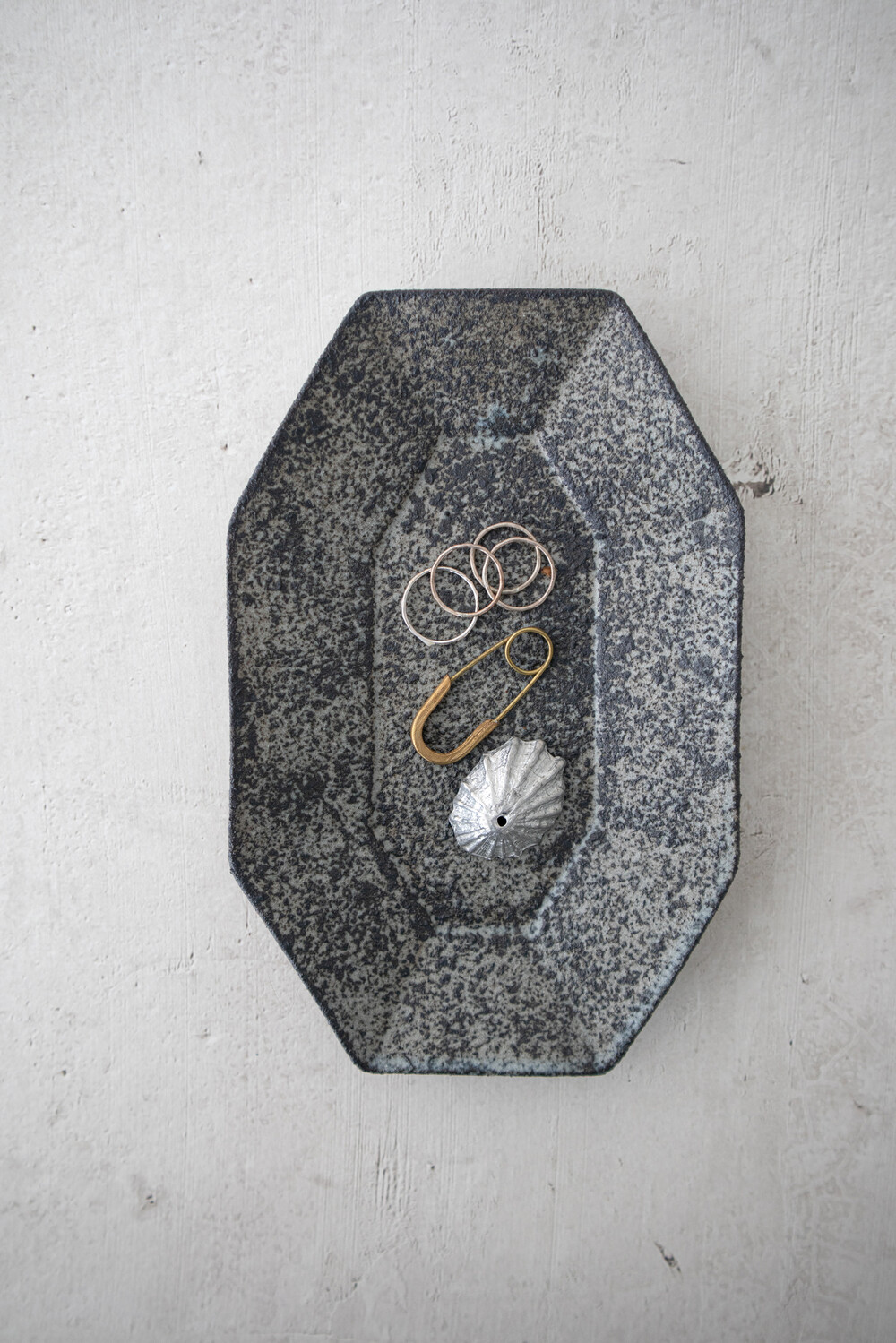 프루의 잔돌 팔각 접시 A형입니다. 잔돌 시리즈는 강가에 모여진 자잘 자잘한 돌멩이들을 형상화하여 제작되었습니다. 흙을 밀고 두들겨 얇게 여러 번 분장하여 만들어진 잔돌 접시는 강가에 모여진 자잘 자잘한 돌멩이들을 형상화하여 제작된 하나의 오브제입니다. 까슬까슬한 질감을 가지고 있으며 어둡고 밝은 돌멩이들의 형상이 자연스럽게 보입니다. 기본 온도보다 낮게 소성하여 식기보다 오브제로서의 역할이 알맞습니다. 같은 가마에서 나왔더라도 제품마다 컬러와 질감이 조금씩 다르며, 입고시마다 달라질 수 있습니다. 상품은 랜덤 발송됩니다.
