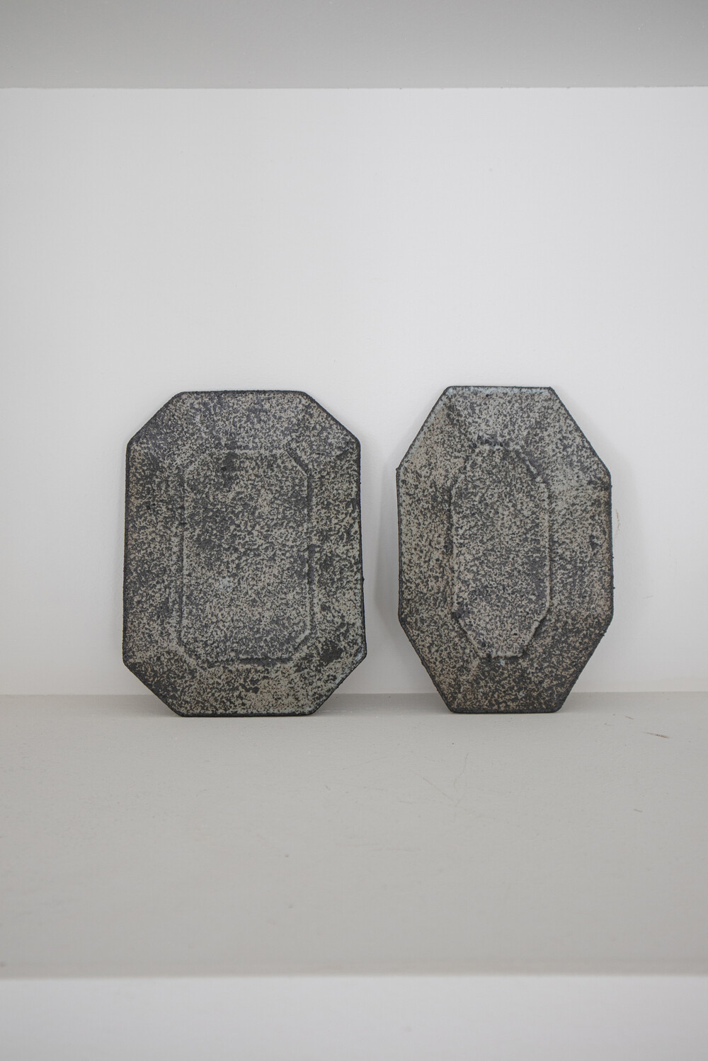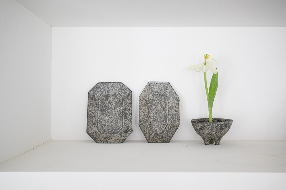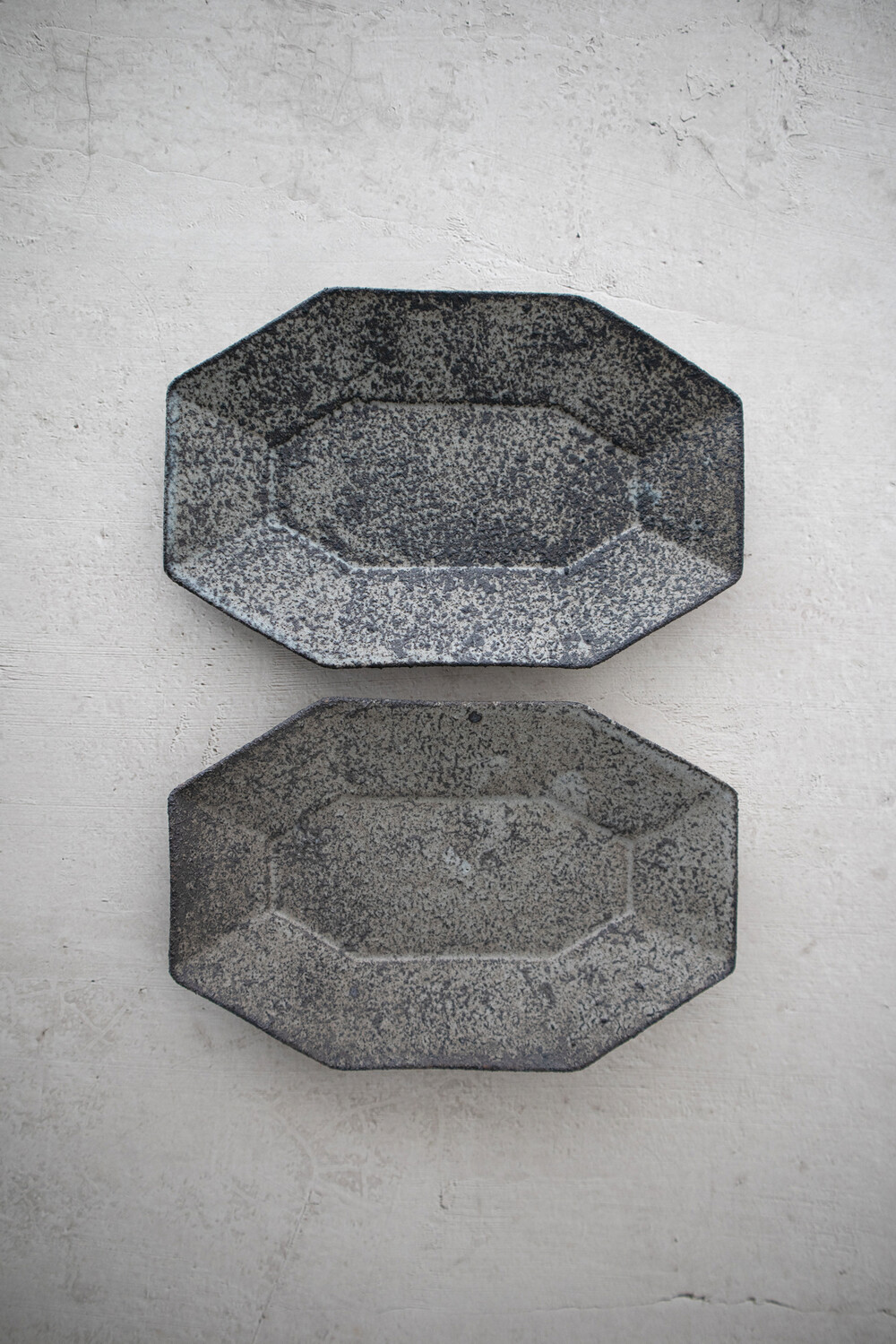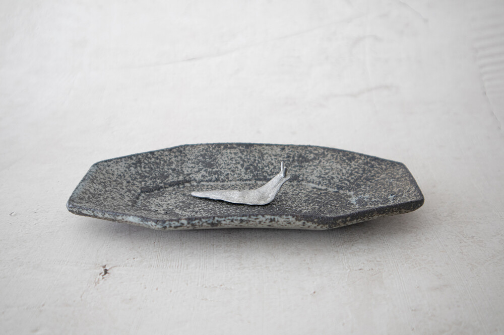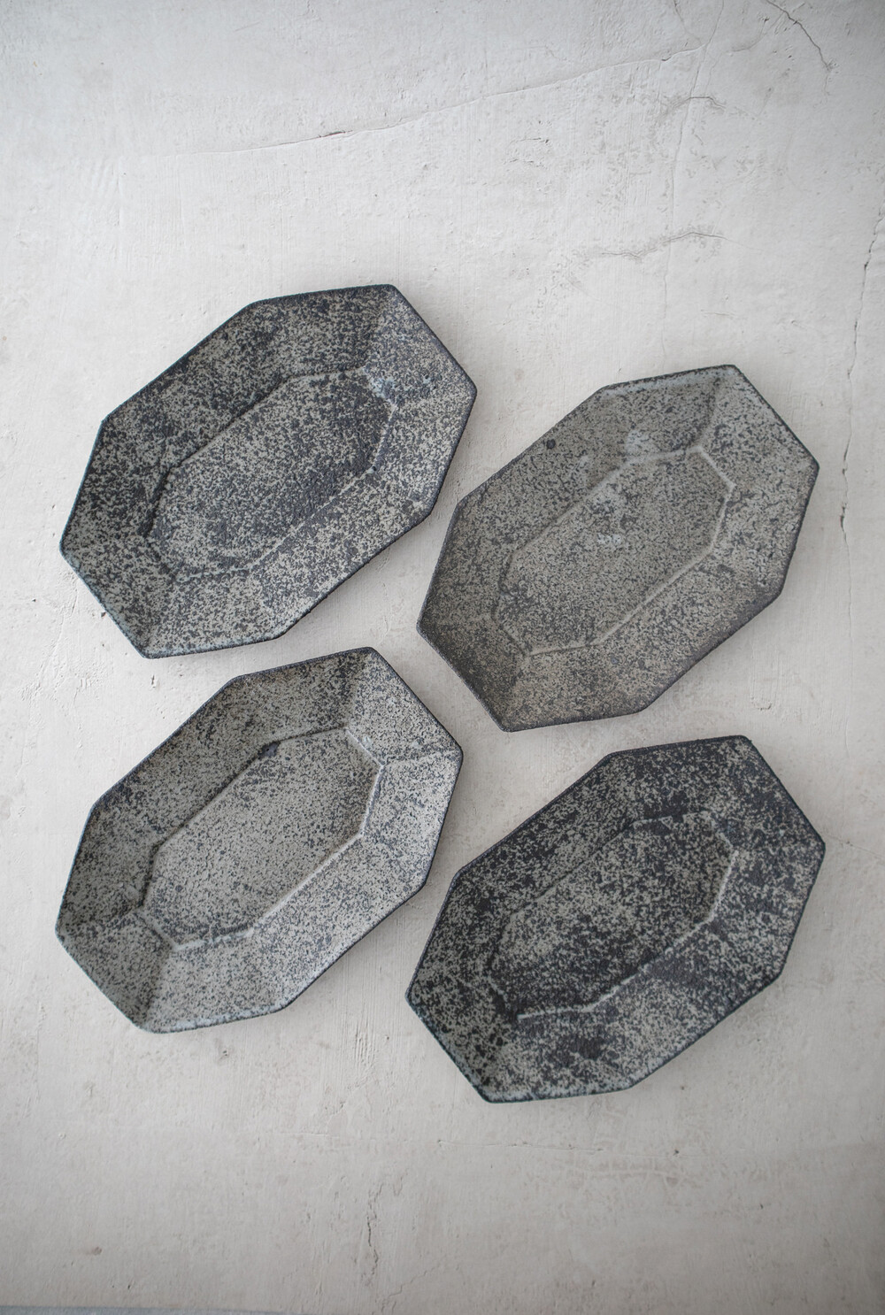 프루의 잔돌 팔각 접시 A형입니다. 잔돌 시리즈는 강가에 모여진 자잘 자잘한 돌멩이들을 형상화하여 제작되었습니다. 흙을 밀고 두들겨 얇게 여러 번 분장하여 만들어진 잔돌 접시는 강가에 모여진 자잘 자잘한 돌멩이들을 형상화하여 제작된 하나의 오브제입니다. 까슬까슬한 질감을 가지고 있으며 어둡고 밝은 돌멩이들의 형상이 자연스럽게 보입니다. 기본 온도보다 낮게 소성하여 식기보다 오브제로서의 역할이 알맞습니다. 같은 가마에서 나왔더라도 제품마다 컬러와 질감이 조금씩 다르며, 입고시마다 달라질 수 있습니다. 상품은 랜덤 발송됩니다.