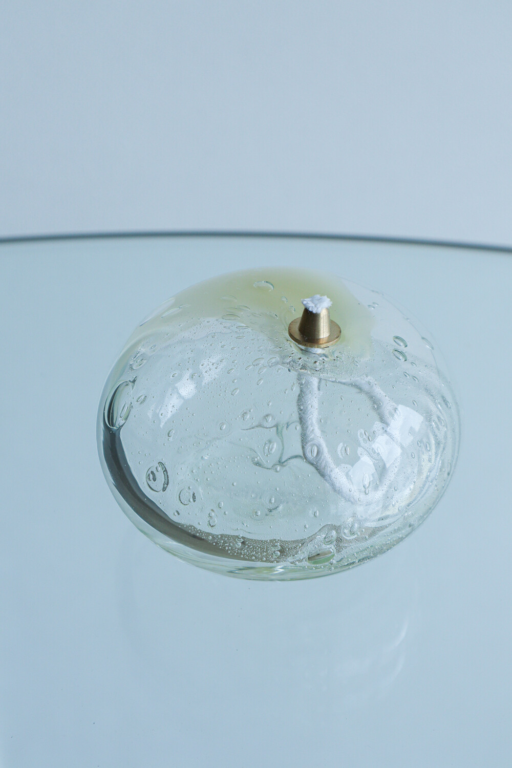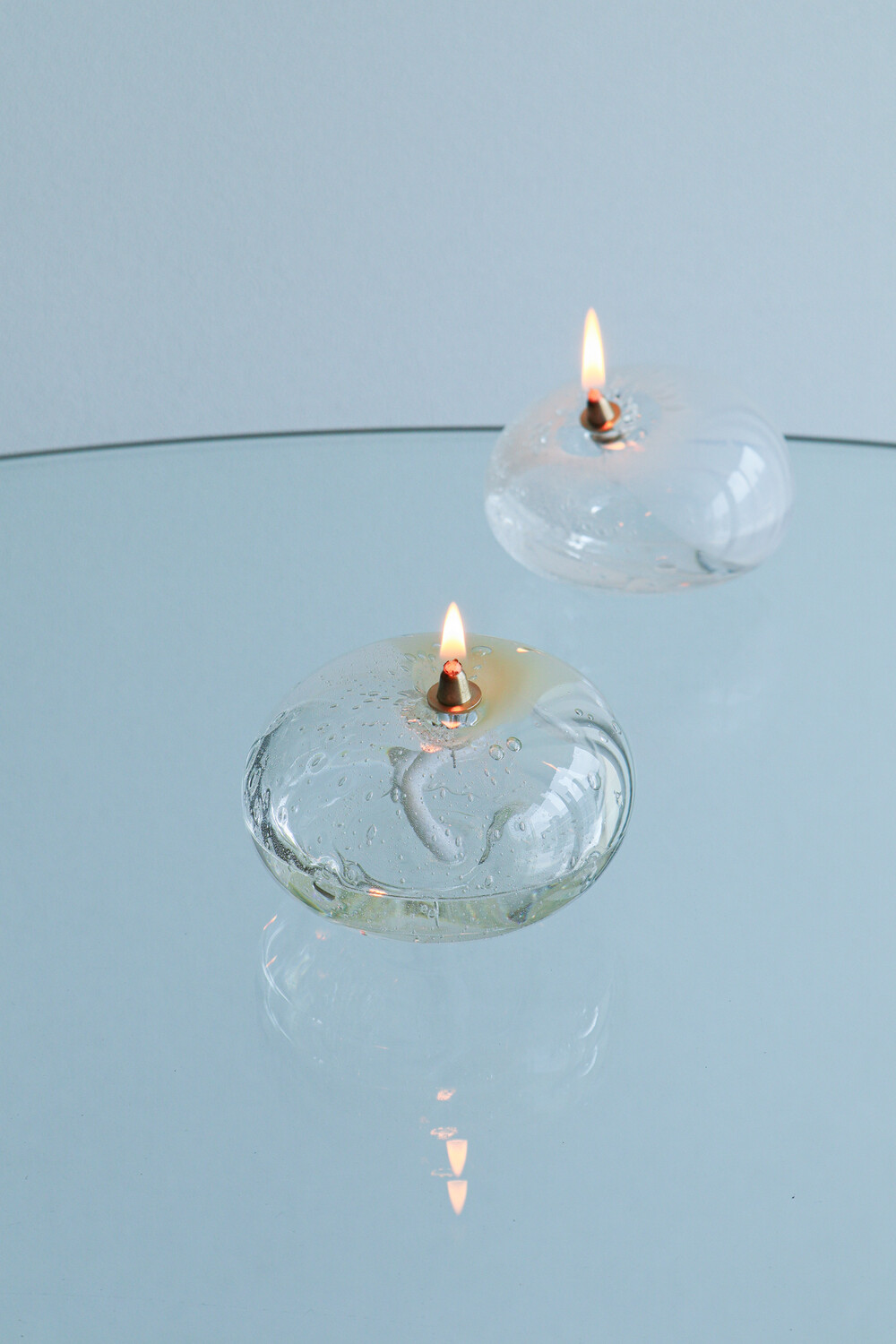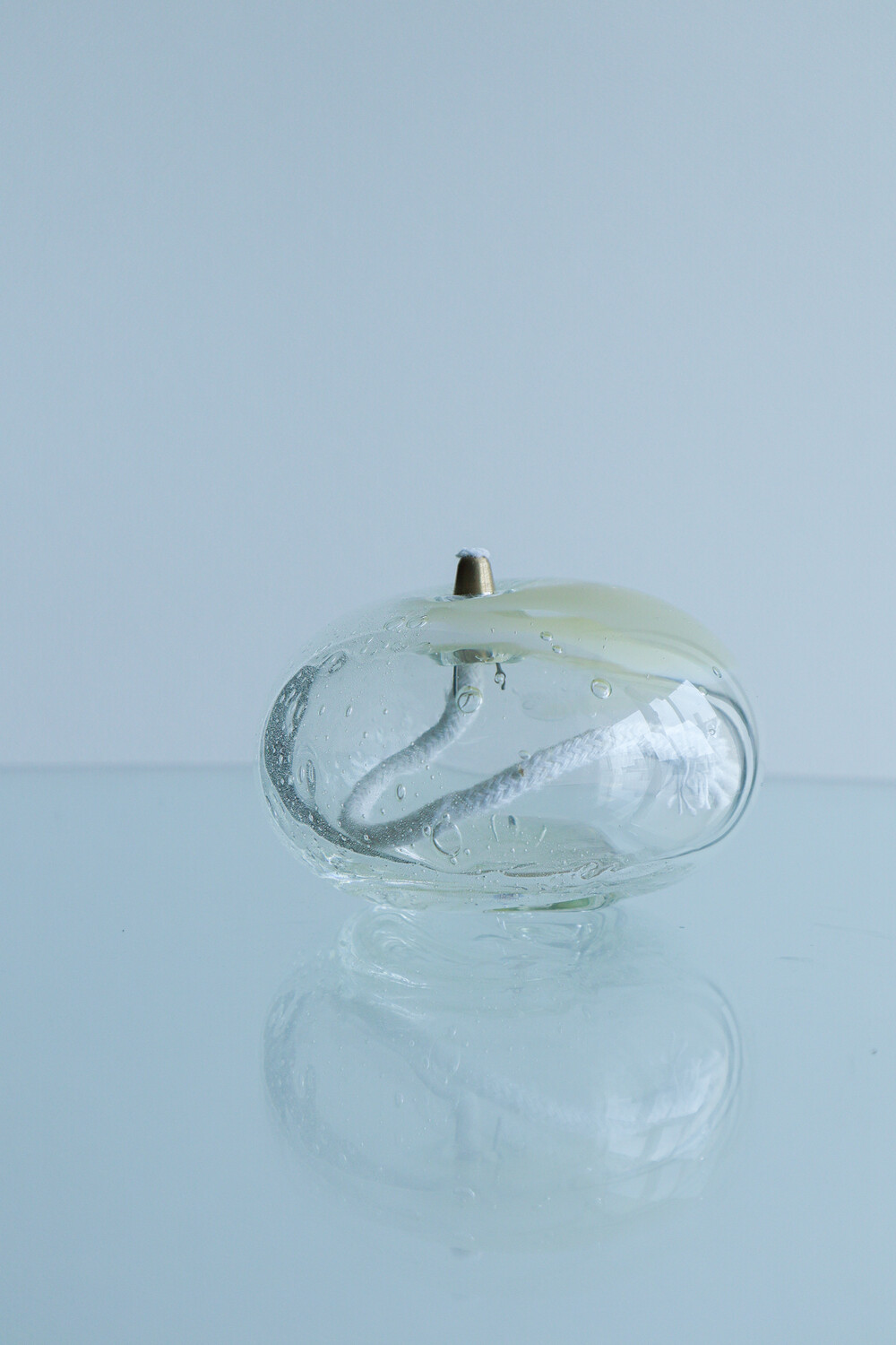 마버 글라스의 기본 납작 호롱입니다. 납작한 형태에 자유로운 유리 기포와 함께 더해진 색유리가 매력적인 작품입니다. 작은 호롱으로 공간에 따스함을 더해보세요.
