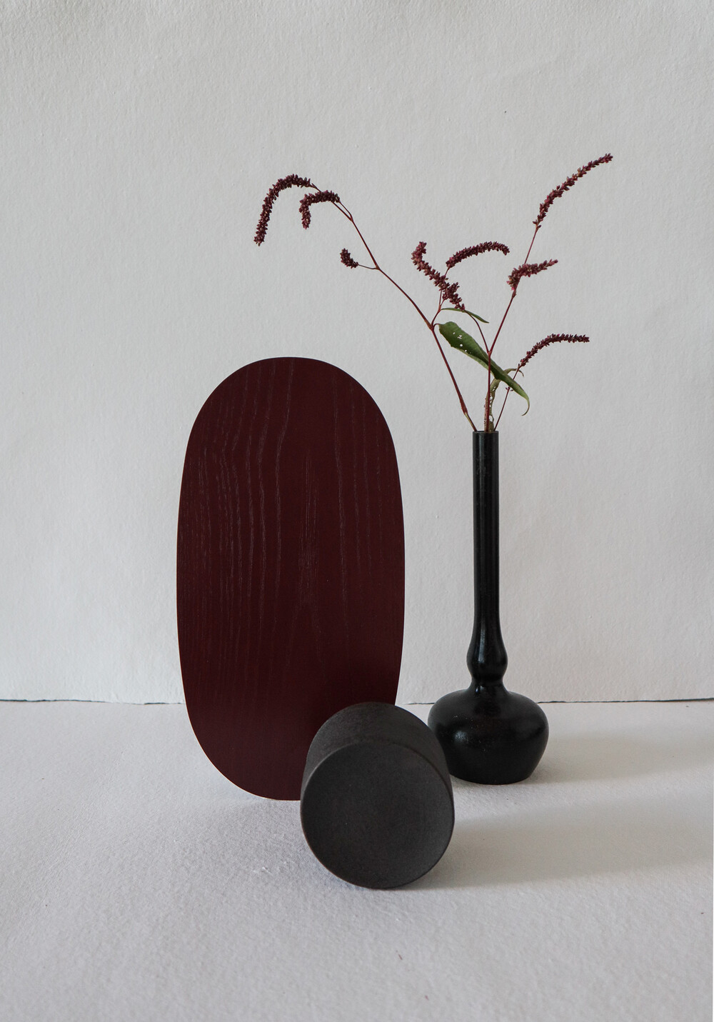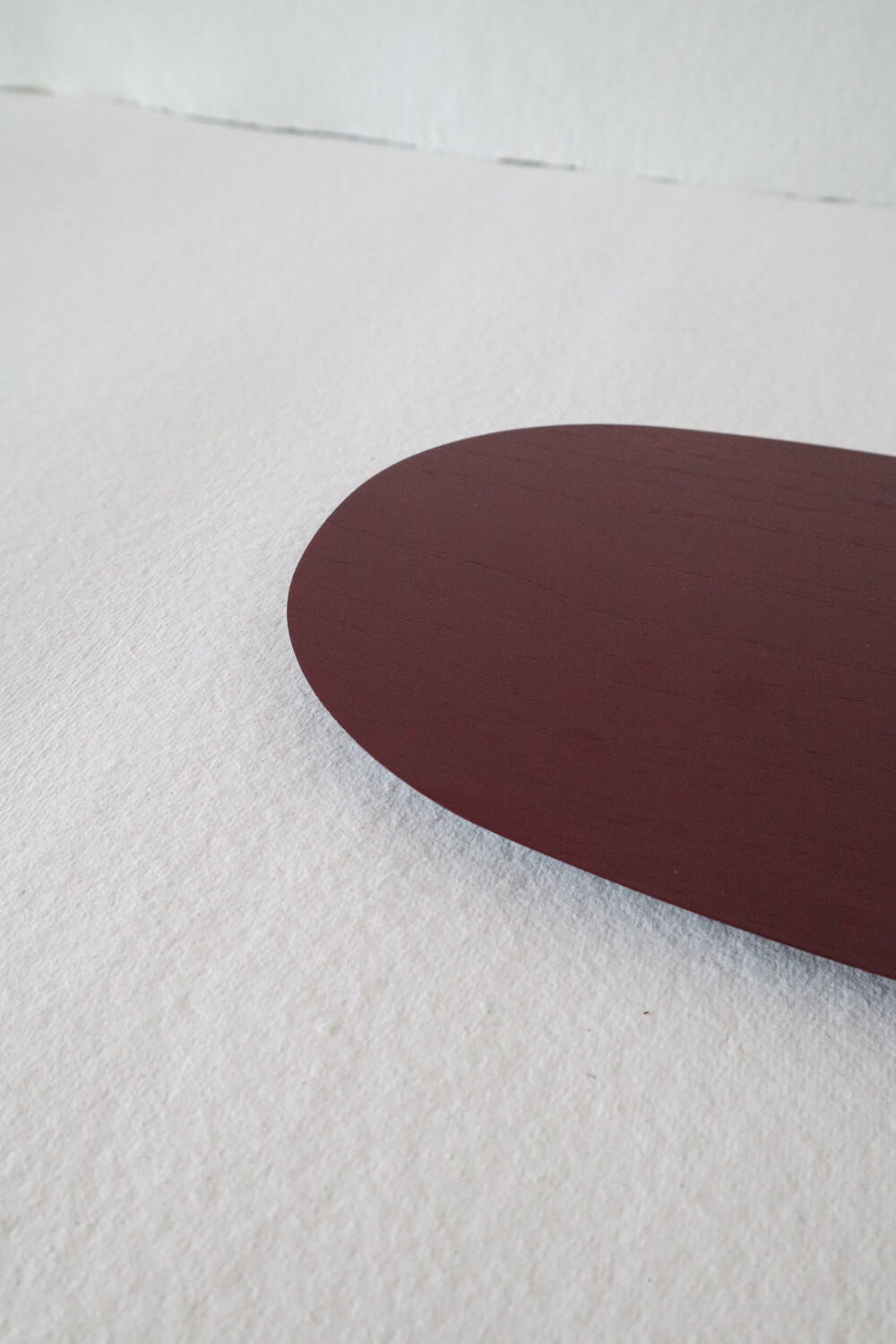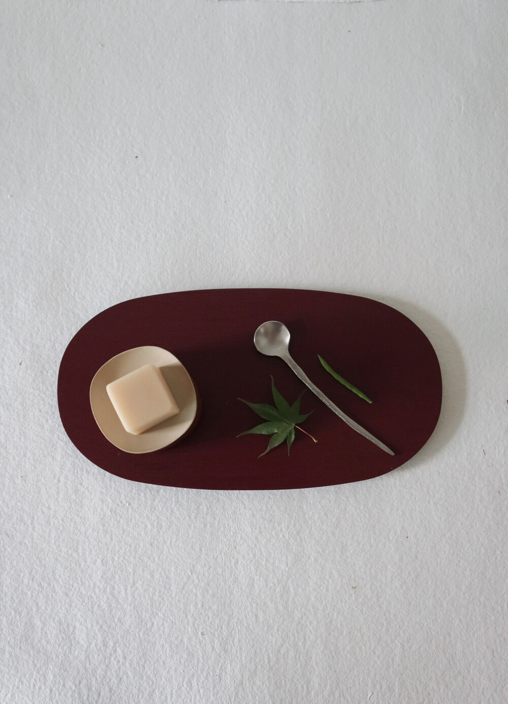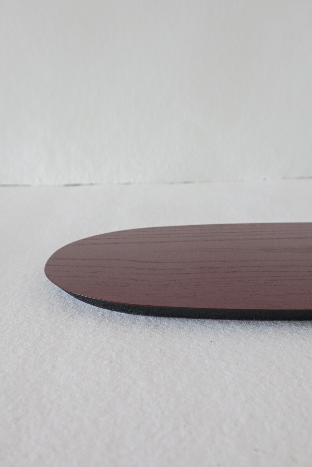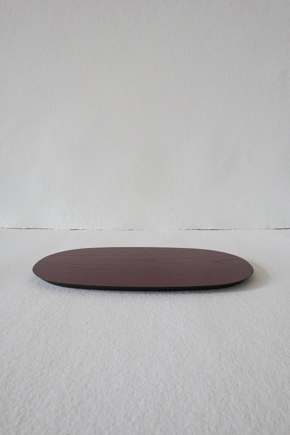 오트오트의 옻칠반 M사이즈 타원형 버건디 컬러입니다. 오트오트의 옻칠반은 무늬목 위에 안료를 섞은 정제 옻칠을 여러 번 바르고 닦아내어 얇고 단단하게 발린 색옻칠 위로 자연스러운 나뭇결이 비쳐 보입니다. 오트오트의 제품들은 작은 디테일부터 마감까지 옻칠로 정성스럽게 마무리하며, 여러 차례 바르고 닦아내어 충분한 생활방수가 가능합니다. 과일이나 다과를 바로 올려 접시를 사용하거나 컵이나 접시 등을 올려 트레이로도 사용하실 수 있습니다. M사이즈는 S사이즈의 옻칠반과 다양하게 컬러를 조합여 사용하시면 더욱 아름답습니다.