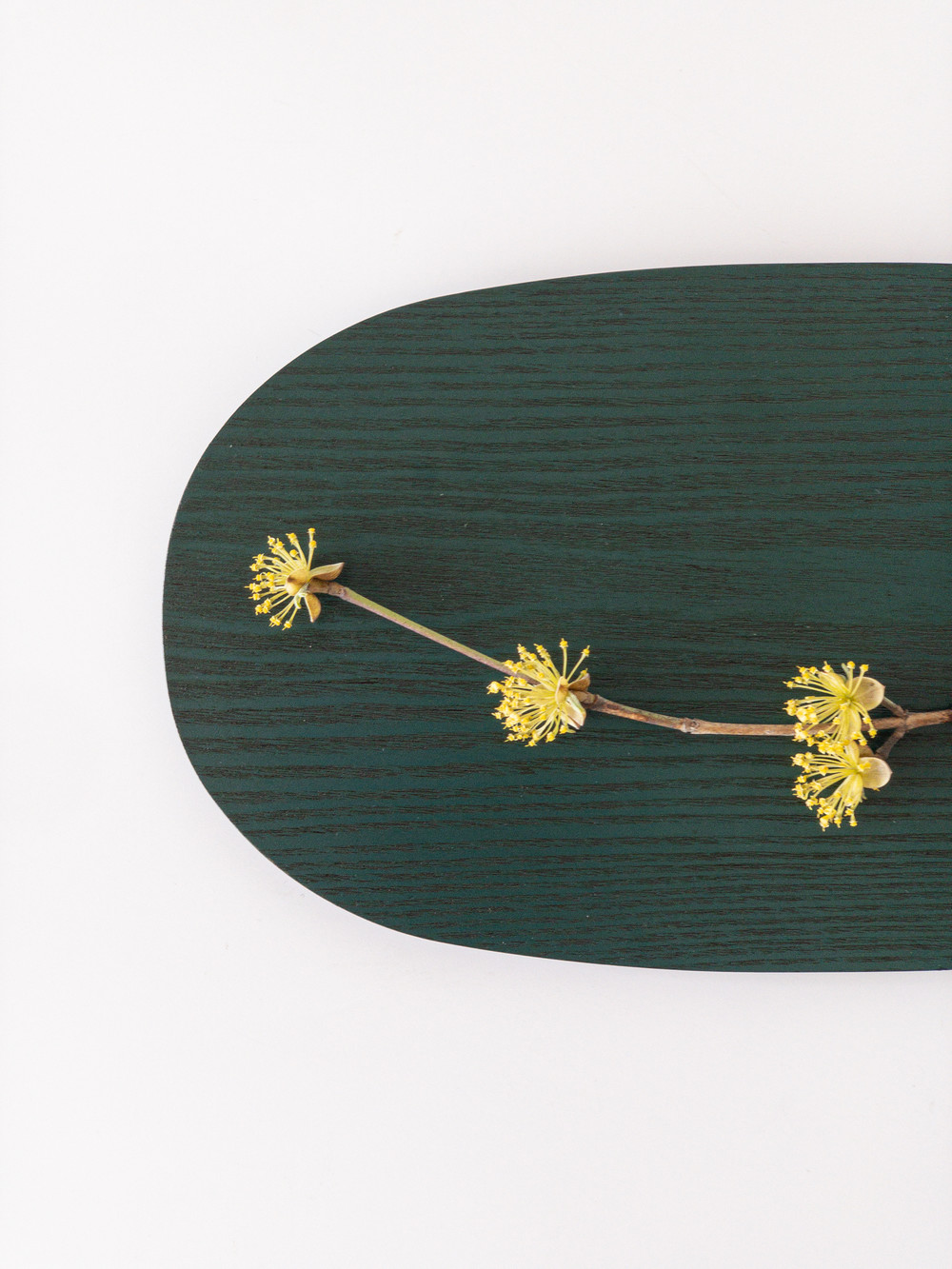 오트오트의 옻칠반 M사이즈 타원형 그린컬러입니다. 오트오트의 옻칠반은 무늬목 위에 안료를 섞은 정제 옻칠을 여러 번 바르고 닦아내어 얇고 단단하게 발린 색옻칠 위로 자연스러운 나뭇결이 비쳐 보입니다. 오트오트의 제품들은 작은 디테일부터 마감까지 옻칠로 정성스럽게 마무리하며, 여러 차례 바르고 닦아내어 충분한 생활방수가 가능합니다. 과일이나 다과를 바로 올려 접시를 사용하거나 컵이나 접시 등을 올려 트레이로도 사용하실 수 있습니다. M사이즈는 S사이즈의 옻칠반과 다양하게 컬러를 조합여 사용하시면 더욱 아름답습니다. 심플하고 즐겁게 일상에서 건강한 옻칠제품을 경험해보세요.